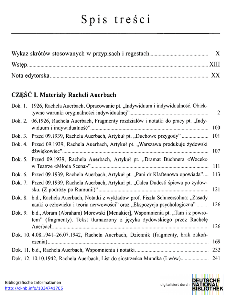 Spis treści Wykaz skrótów stosowanych w przypisach i regestach Wstęp X XIII Nota edytorska XX CZĘŚĆ I. Materiały Racheli Auerbach Dok. 1. 1926, Rachela Auerbach, Opracowanie pt. „Indywiduum i indywidualność. Obiek tywne warunki oryginalności indywidualnej" 2 Dok. 2. 06.1926, Rachela Auerbach, Fragmenty rozdziałów i notatki do pracy pt. „Indy widuum i indywidualność" 100 Dok. 3. Przed 09.1939, Rachela Auerbach, Artykuł pt. „Duchowe przygody" 101 Dok. 4. Przed 09.1939, Rachela Auerbach, Artykuł pt. „Warszawa produkuje żydowski dźwiękowiec" 107 Dok. 5. Przed 09.1939, Rachela Auerbach, Artykuł pt. „Dramat Buchnera «Wocek» w Teatrze «Młoda Scena»" 111 Dok. 6. Przed 09.1939, Rachela Auerbach, Artykuł pt. „Pani dr Klaftenowa opowiada".... 113 Dok. 7. Przed 09.1939, Rachela Auerbach, Artykuł pt. „Calea Dudesti śpiewa po żydow sku. (Z podróży po Rumunii)" 121 Dok. 8. b.d., Rachela Auerbach, Notatki z wykładów prof. Fiszla Schneersohna: „Zasady nauki o człowieku i teoria nerwowości" oraz „Ekspozycja psychologiczna" 126 Dok. 9. b.d., Abram (Abraham) Morewski [Menakier], Wspomnienia pt. „Tam i z powro tem" (fragmenty). Tekst tłumaczony z języka żydowskiego przez Rachelę Auerbach 126 Dok. 10.4.08.1941-26.07.1942, Rachela Auerbach, Dziennik (fragmenty, brak zakoń czenia) 169 Dok. 11. b.d., Rachela Auerbach, Wspomnienia i notatki 232 Dok. 12. 10.10.1942, Rachela Auerbach, List do siostrzeńca Mundka (Lwów) 241 http://d-nb.info/1034741705 VI Spis treści CZĘŚĆ II. Materiały Hersza Wassera Dok. 13. 23.10.1939, Łódź. Feldkommandantur 530, Fragment dokumentu wystawionego dla N.N. [Hersza Wassera?] 244 Dok. 14. Przed 13.11.1939, Łódź. Zarząd Żydowskiej Gminy Wyznaniowej w Łodzi, Zaświadczenie przydziału pracy nr 22148 dla Hersza Wassera 244 Dok. 15. 13.11.1939, Łódź. Feldkommandantur [5]30, Lange, Zaświadczenie wystawione dla Hersza Wassera uprawniające do chodzenia po ul. Piotrkowskiej w Łodzi 245 Dok. 16. 15.11.1939, Łódź. Polizeiprasident, Przepustka dla Hersza Wassera na podróż do Białegostoku 246 Dok. 17. 23.11.1939, Łódź. Polizeiprasident, Zezwolenie dla Hersza Wassera na poruszanie się po ulicach Łodzi 247 Dok. 18. 06.11.1941, Kraków. Urząd Dewizowy w Krakowie, Wydział Zezwoleń, Zezwo lenia na przesłanie rzeczy dla Leiba Wassera i Szmula Elbirta. Załączona lista rzeczy 248 Dok. 19. Po 1.09.1939, Łódź. Firma I. Kolner, Łódź, Zaświadczenie o zatrudnieniu Hersza Wassera w charakterze księgowego 249 Dok. 20. 01.1941, Warszawa - getto. ŻTOS, Zaproszenie dla Hersza Wassera na akademię inauguracyjną akcji „Pomocy Zimowej" 250 Dok. 21. 20.03.1941, Warszawa - getto. Komitet Domowy domu przy ul. [Muranowskiej 6?], Zawiadomienie o opodatkowaniu Hersza Wassera na rzecz ubogich i uchodź ców z okazji święta Pesach 251 Dok. 22. 05[?].1941, Warszawa - getto. Zaproszenie na seminarium Haszomer Hacair dla działaczy i wychowanków 252 Dok. 23. 3.12.1941, Warszawa - getto. Zaproszenie na seminarium Haszomer Hacair dla Hersza Wassera 253 Dok. 24. 12.1941, Warszawa - getto. Rada Żydowska w Warszawie. Wydział Szkolny, Zaproszenie dla Hersza Wassera na akademię szkolną w sali „Femina" 254 Dok. 25. 01.1942, Warszawa - getto. Hechaluc Dror, Zaproszenie dla Hersza Wassera na uroczystość zakończenia II krajowego seminarium Dror 255 Dok. 26. 31.03.1942, Warszawa - getto. N.N. [Tytelman?], Pokwitowanie wystawione dla Hersza Wassera 256 Dok. 27. 12.1939-1941, Warszawa. Hersz Wasser, Książka zapisów kasowych. Spis wydat ków codziennych. Różne notatki 257 Dok. 28. b.d., N.N. (Josef), List do N.N. (Hersza Wassera [?]) (fragment) 328 Dok. 29. 18.04.1940, [S. Wasser], List do Hersza Wassera (Warszawa). Prośba o pomoc w sprowadzeniu do Warszawy 329 Dok. 30. 06.1941-07.1942, Biłgoraj. Josif Kirszenfeld z żoną, Listy do Hersza i Blumy Wasser 332 Dok. 31. Po 02.1941, Biłgoraj. Josif Kirszenfeld, List do N.N. [(Warszawa - getto)?]. Prośba o pomoc i ratunek oraz przekazanie treści listu szwagrostwu Szai i Blumie 335 Spis treści VII Dok. 32. 25.03.1942, Łódź - getto. Chaim Rumkowski, Listy do Hersza Wassera. Oficjalne zawiadomienia, że Dora i Sulamita Elbirt oraz Lejb i Estera Wasser są zdrowi i mieszkają w łódzkim getcie 336 Dok. 33. 10.1941, Dubienka. Genia Segal, List do Blumy i Hersza Wassera. Prośba o wia domości 336 Dok. 34. Korespondencja dotycząca Szlamka (Szłojme) [Winera] [ps. Jakub Grojnowski]. Od [A] do [G] 337 Dok. 35. 05-06.1942, Otwock. Władysław Wajnblat, Listy do Hersza Wassera 338 Dok. 36. 12.11.1941, Warszawa - getto. Hersz i Bluma Wasser, List do Józefa M. Kirszenfelda. Prośba o list 340 Dok. 37. 18.07.1940, Warszawa. Hersz i Bluma Wasser, List do Lejba i Estery Wasser. Informacje dotyczące kosztów utrzymania w Warszawie 341 Dok. 38. 07-12.1941, Łódź - getto. Lejb i Estera Wasser, Listy do Hersza Wassera 342 Dok. 39. 1.04.1942, Warszawa - getto. N.N., List do Hersza Wassera. Sprawa obiadów dla siostry autora listu (Kapłańskiej) 345 Dok. 40. 1.06.1942. N.N., List do Hersza Wassera (brak zakończenia) 346 Dok. 41. 27.07.1942, Warszawa - getto. N.N., List do Hersza Wassera. Prośba o dokument zwalniający z deportacji 347 Dok. 42. b.d., Łódź. N.N., Telegram do [Hersza Wassera?] 347 CZĘŚĆ III. Materiały Menachema Mendla Kona Dok. 43. Mendel Menachem Kon - dowód osobisty 350 Dok. 44. Przed 5.05.1942, Warszawa - getto. Wydział Szkolny przy Radzie Żydowskiej, Zaproszenie na „Poranek Szkolny" do „Feminy" dla Menachema Mendla Kona .. 350 Dok. 45. 1942, Menachem Mendel Kon - korespondencja 350 Dok. 46. 26.03.1942, Eliezer z Iławy, rabin, List do Menachema Kona. Prośba o pomoc za pośrednictwem Szymona Huberbanda 353 Dok. 47. Menachem Mendel Kon - korespondencja. Od [A] do [D] 354 CZĘŚĆ IV. Materiały Eliasza Gutkowskiego Dok. 48. Eliasz Gutkowski - świadectwa szkolne i zaświadczenia zawodowe. Od [A] do [R] 358 Dok. 49. 25.06.1930, Gimnazjum Męskie 