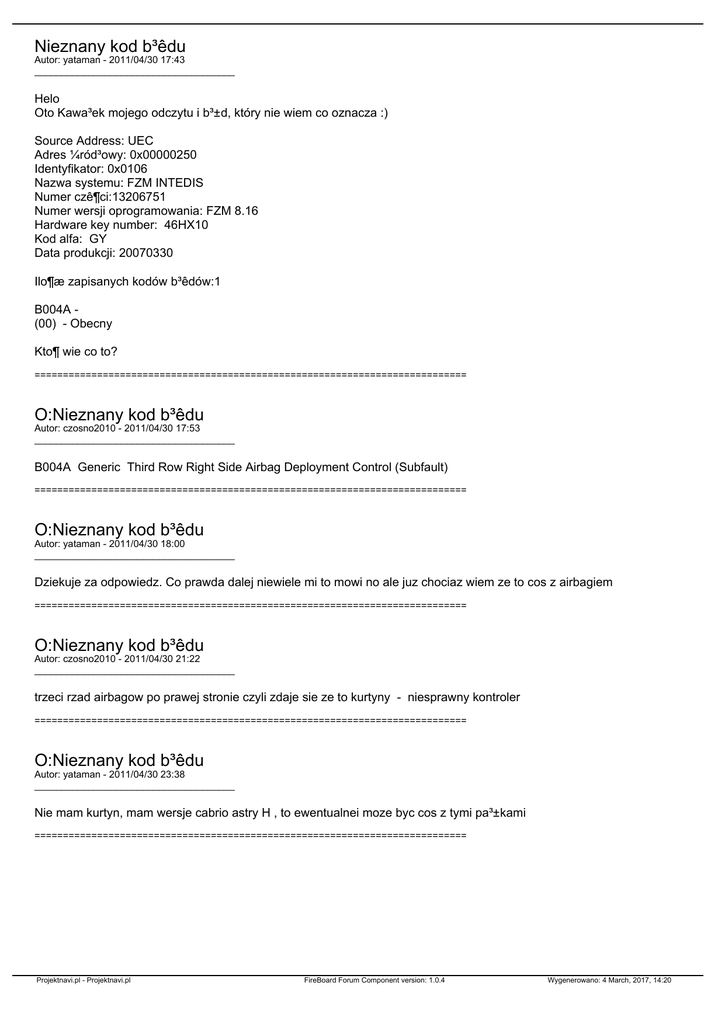 Nieznany kod b³êdu Autor: yataman - 2011/04/30 17:43 _____________________________________ Helo Oto Kawa³ek mojego odczytu i b³±d, który nie wiem co oznacza :) Source Address: UEC Adres ¼ród³owy: 0x00000250 Identyfikator: 0x0106 Nazwa systemu: FZM INTEDIS Numer czê¶ci:13206751 Numer wersji oprogramowania: FZM 8.16 Hardware key number: 46HX10 Kod alfa: GY Data produkcji: 20070330 Ilo¶æ zapisanych kodów b³êdów:1 B004A (00) - Obecny Kto¶ wie co to? ============================================================================ O:Nieznany kod b³êdu Autor: czosno2010 - 2011/04/30 17:53 _____________________________________ B004A Generic Third Row Right Side Airbag Deployment Control (Subfault) ============================================================================ O:Nieznany kod b³êdu Autor: yataman - 2011/04/30 18:00 _____________________________________ Dziekuje za odpowiedz. Co prawda dalej niewiele mi to mowi no ale juz chociaz wiem ze to cos z airbagiem ============================================================================ O:Nieznany kod b³êdu Autor: czosno2010 - 2011/04/30 21:22 _____________________________________ trzeci rzad airbagow po prawej stronie czyli zdaje sie ze to kurtyny - niesprawny kontroler ============================================================================ O:Nieznany kod b³êdu Autor: yataman - 2011/04/30 23:38 _____________________________________ Nie mam kurtyn, mam wersje cabrio astry H , to ewentualnei moze byc cos z tymi pa³±kami ============================================================================ Projektnavi.pl - Projektnavi.pl FireBoard Forum Component version: 1.0.4 Wygenerowano: 4 March, 2017, 14:20
