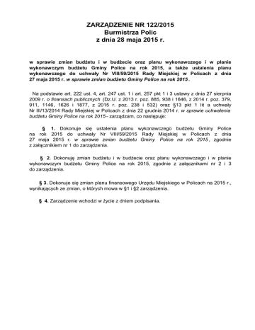 ZARZĄDZENIE NR 122/2015 Burmistrza Polic z dnia 28 maja 2015 r. w sprawie zmian budżetu i w budżecie oraz planu wykonawczego i w planie wykonawczym budżetu Gminy Police na rok 2015, a także ustalenia planu wykonawczego do uchwały Nr VIII/59/2015 Rady Miejskiej w Policach z dnia 27 maja 2015 r. w sprawie zmian budżetu Gminy Police na rok 2015 . Na podstawie art. 222 ust. 4, art. 247 ust. 1 i art. 257 pkt 1 i 3 ustawy z dnia 27 sierpnia 2009 r. o finansach publicznych (Dz.U. z 2013 r. poz. 885, 938 i 1646, z 2014 r. poz. 379, 911, 1146, 1626 i 1877, z 2015 r. poz. 238 i 532) oraz §13 pkt 1 lit a uchwały Nr III/13/2014 Rady Miejskiej w Policach z dnia 22 grudnia 2014 r. w sprawie uchwalenia budżetu Gminy Police na rok 2015 - zarządzam, co następuje: § 1. Dokonuje się ustalenia planu wykonawczego budżetu Gminy Police na rok 2015 do uchwały Nr VIII/59/2015 Rady Miejskiej w Policach z dnia 27 maja 2015 r. w sprawie zmian budżetu Gminy Police na rok 2015 , zgodnie z załącznikiem nr 1 do zarządzenia. § 2. Dokonuję zmian budżetu i w budżecie oraz planu wykonawczego i w planie wykonawczym budżetu Gminy Police na rok 2015, zgodnie z załącznikami nr 2 i 3 do zarządzenia. § 3. Dokonuje się zmian planu finansowego Urzędu Miejskiego w Policach na 2015 r., wynikających ze zmian, o których mowa w §1 i §2 zarządzenia. § 4. Zarządzenie wchodzi w życie z dniem podpisania. Załącznik nr 1 do Zarządzenia Nr 122/2015 Burmistrza Polic z dnia 28.05.2015 r. Ustala się plan wykonawczy budżetu Gminy Police na rok 2015 do uchwały Nr VIII/59/2015 Rady Miejskiej w Policach z dnia 27 maja 2015 r. w sprawie zmian budżetu Gminy Police na rok 2015 . Zadania własne Dochody Dział Rozdział Dysponent § 801 80101 Szkoła Podstawowa nr 1 w Policach 0970 80110 Gimnazjum nr 1 w Policach 921 0970 92109 Urząd Miejski Wydział OR 0970 Razem: Zmniejszenia w zł Zwiększenia w zł 0 0 22 629 2 629 - 2 629 0 20 000 - 20 000 0 1 122 - 1 122 0 23 751 Zmniejszenia w zł Zwiększenia w zł 0 0 22 629 2 629 - 2 629 0 20 000 - 20 000 0 1 122 - 1 122 0 23 751 Wydatki Dział Rozdział Dysponent § 801 80101 Szkoła Podstawowa nr 1 w Policach 4270 80110 Gimnazjum nr 1 w Policach 921 4270 92109 Urząd Miejski Wydział OR/ Osiedle "Jasienica" Rada Osiedla nr 3 Razem: 4210 Zadania wspólne realizowane w drodze umów lub porozumień między jednostkami samorządu terytorialnego Dochody Dział 853 Rozdział Dysponent 85395 Ośrodek Pomocy Społecznej w Policach § Zmniejszenia w zł Zwiększenia w zł 0 - 9 526,46 9 050,14 - 476,32 0 9 526,46 Zmniejszenia w zł Zwiększenia w zł 0 9 526,46 2327 - 9 050,14 2329 - 476,32 0 9 526,46 2007 2009 Razem: Wydatki Dział 853 Rozdział Dysponent 85395 Ośrodek Pomocy Społecznej w Policach PROJEKT: POBUDKA - obudź swój potencjał Razem: § Załącznik nr 2 do Zarządzenia Nr 122/2015 Burmistrza Polic z dnia 28.05.2015 r. Zmiany w planie wydatków budżetowych oraz w planie wykonawczym budżetu Gminy Police na rok 2015. Zadania własne Wydatki Dział 750 Rozdział Dysponent 75023 Urząd Miejski Wydział OR 758 Zwiększenia w zł 4170 4270 10 000 10 000 138 000 10 000 10 000 0 4810 138 000 - 24 500 24 500 10 800 5 800 5 000 62 000 50 000 24 500 24 500 10 800 10 800 200 000 200 000 80195 Urząd Miejski Wydział OK 853 Zmniejszenia w zł 75818 Urząd Miejski Wydział FN Rezerwa ogólna 801 § 4300 4700 85336 Urząd Miejski Wydział OK 4210 4270 4300 900 90002 Urząd Miejski Wydział GO 4300 - 200 000 Urząd Miejski Wydział OR 4010 4110 4120 42 366 6 676 958 12 000 10 000 2 000 5 000 5 000 250 300 0 5 000 5 000 250 300 90095 Urząd Miejski Wydział DG 926 4270 4300 92604 Ośrodek Sportu i Rekreacji w Policach Razem: 4190 4210 Załącznik nr 3 do Zarządzenia Nr 122/2015 Burmistrza Polic z dnia 28.05.2015 r. Zmiana planu dochodów i wydatków budżetowych oraz zmiana planu wykonawczego budżetu Gminy Police na rok 2015. Zadania zlecone Dochody Dział 750 Rozdział Dysponent 75011 Urząd Miejski § Zmniejszenia w zł Zwiększenia w zł 2010 0 0 22 577 22 577 22 577 § Zmniejszenia w zł Zwiększenia w zł 4010 4110 4120 0 0 22 577 18 870 3 244 463 22 577 Razem: Wydatki Dział 750 Rozdział Dysponent 75011 Urząd Miejski Wydział OR Razem: UZASADNIENIE Dokonuje się zmian budżetu i w budżecie oraz planu wykonawczego i w planie wykonawczym budżetu Gminy Police na 2015 rok. Ustala się plan wykonawczy budżetu Gminy Police na rok 2015 do uchwały Nr VIII/59/2015 Rady Miejskiej w Policach z dnia 27 maja 2015 r. w sprawie zmian budżetu Gminy Police na rok 2015 . Ustala się plan wykonawczy budżetu Gminy Police na rok 2015 do uchwały Nr VIII/59/2015 Rady Miejskiej w Policach z dnia 27 maja 2015 r. w sprawie zmian budżetu Gminy Police na rok 2015 , zgodnie z załącznikiem nr 1 do zarządzenia. Zadania własne 1. Dział 750 rozdział 75023 - przenosi się plan wydatków w kwocie 10.000 zł z przeznaczeniem na wynagrodzenia bezosobowe. 2. Dział 758 rozdział 75818 - środki z rezerwy ogólnej w kwocie 138.000 zł przenosi się do działu 900 rozdział 90002 z przeznaczeniem na zabezpieczenie wydatków niezbędnych do zawarcia umowy na odbiór i zagospodarowanie odpadów komunalnych. 3. Dział 801 rozdział 80195 - przenosi się plan wydatków w kwocie 24.500 zł z przeznaczeniem na usługi wdrożeniowe oraz szkolenia pracowników Wydziału Oświaty i Kultury i pracowników podległych jednostek oświatowych w zakresie: Aplikacji Sigma Arkusz dla organu prowadzącego (gromadzenie i przetwarzanie danych o organizacji szkoły oraz import danych Systemu Informacji Oświatowej) - 21.500 zł oraz Aplikacji Dotacje podręcznikowe (zebranie informacji oraz wniosków o dotacje na zakup podręczników, materiałów ćwiczeniowych szkół i rozliczanie dotacji) - 3.000 zł. 4. Dział 853 rozdział 85336 - przenosi się plan wydatków w łącznej kwocie 10.800 zł z przeznaczeniem na zakup usług pozostałych, celem rekultywacji terenu zielonego dookoła 16-10 Hufca Pracy OHP