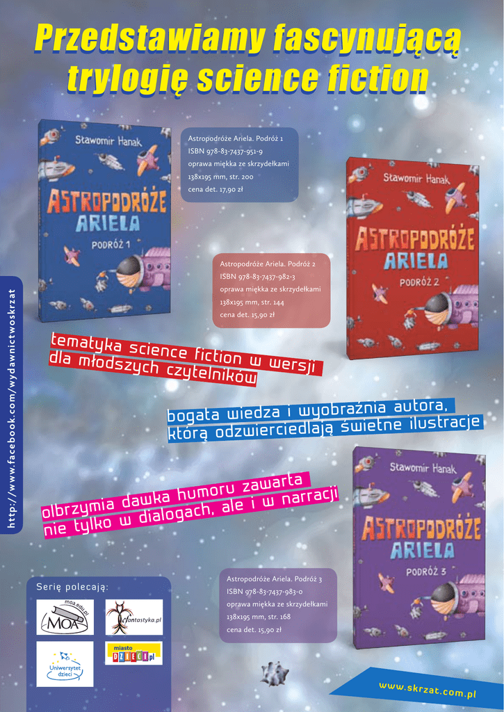 Przedstawiamy fascynującą trylogię science fiction Astropodróże Ariela. Podróż 1 ISBN 978-83-7437-951-9 oprawa miękka ze skrzydełkami 138x195 mm, str. 200 cena det. 17,90 zł Astropodróże Ariela. Podróż 2 ht tp: //w w w. faceb ook . com/w ydaw nic twoskrzat ISBN 978-83-7437-982-3 oprawa miękka ze skrzydełkami 138x195 mm, str. 144 cena det. 15,90 zł tematyka s dla młodsz cience fiction w wers ych czyteln ji ików nia autora, bogata wiedza i wyobraź ietne ilustracje św ą aj dl ie rc ie w dz o rą ó kt arta w a z u r o r ra c j i a hum a k n w a w d i a i olbrzym w dialogach, ale nie tylko S e r ię p ole c ają: Astropodróże Ariela. Podróż 3 ISBN 978-83-7437-983-0 oprawa miękka ze skrzydełkami 138x195 mm, str. 168 cena det. 15,90 zł w w w .s k r z a t .c o m .p l Podróż 1 ht tp: //w w w. faceb ook . com/w ydaw nic twoskrzat Jest rok 2213. Ariel, nieco przemądrzały uczeń szkoły astropilotów. Na co dzień porusza się plecakowym napędem lewitującym i lata kosmobusem na Księżyc, a jego ulubione przysmaki to moonburgery i space-cola. Nieoczekiwanie wraz z ojcem wyrusza na wyspę Guam, ponieważ załoga badająca dno Rowu Mariańskiego, której przewodniczy jego mama, w tajemniczych okolicznościach traci kontakt z bazą… w w w .s k r z a t .c o m .p l ht tp: //w w w. faceb ook . com/w ydaw nic twoskrzat Podróż 2 W drugiej części „Astropodróży” spełnia się największe marzenie Ariela: wybrany spośród tysiąca kandydatów z całego świata bierze udział w wyprawie na Texaran – planetę odległą od Ziemi o 43 lata świetlne! Jest to możliwe dzięki skokowi w nadprzestrzeń, który okazuje się nieco… zaskakujący. Na Texaranie Ariel spotyka przedziwne istoty zwane murplami, poznaje historię tajemniczego zaginięcia większości załogi podczas wyprawy na Cremonę d i dowiaduje się, do czego pilotowi potrzebna jest… matematyka. w w w .s k r z a t .c o m .p l Podróż 3 Trzecia i zarazem najbardziej niespodziewana astropodróż Ariela to podróż w czasie… do Polski ht tp: //w w w. faceb ook . com/w ydaw nic twoskrzat z 2013 roku. Chłopiec poznaje swoich rówieśników z przeszłości, swoje miasto, po którym nie podróżuje ani jeden kosmobus, za to jeżdżą tramwaje i rowery, zajada się przysmakami, które nie mają nic wspólnego z chemicznym jedzeniem z przyszłości, i zyskuje nowych przyjaciół. Martwiąc się, jak wróci do swoich czasów, Ariel zaczyna rozumieć, jak ważni są dla niego rodzice i przyjaciele. Powrót chłopca na Księżyc będzie możliwy, ale niezwykle zaskakujący! w w w .s k r z a t .c o m .p l o autorze Dorastał w czasach, kiedy o komputerach czytało się w książkach science fiction. Mieszka w Raciborzu. Przez kilka lat tworzył teksty dla amatorskiej grupy rockowej, której był wokalistą. Napisał mnóstwo okazjonalnych piosenek i wierszyków. Jego debiutancka powieść „Dziewczyny i chłopaki. Niepotrzebne skreślić” znalazła się na liście książek dostrzeżonych podczas II Konkursu Literackiego im. Astrid Lindgren. W 2013 roku wydał wakacyjną powieść przygodową „Lipcowe przypadki Agatki”. Uwielbia lotnictwo, muzykę i swoją córkę, Martynę, dla której co roku na urodziny pisze kolejną książkę. am iłem. Nazyw w a t s d e z r p ię nie y scy Aha, chyba s ack, ale wsz v o N n o e L dward , że się Robert E się to st ąd ło ię z W l. ie r ają A w unilany mnie nazyw n a t y z c ., L imion, R. E. skrót moich mi w łaśnie z r b ) e g a u g al lan gu (univer s lat tr zynaście ż ju m a M . „ar-i-el” y tr zeciej klas m ie n z c u i jestem ootów. Wsp il p o r t s A ii Akadem w lokromnie, że s ie n ż ju m mnia łe w szkole. y z s p le j a n t ach jestem yś zost ać kied ję ie z d a n Mam naut ą, t akim o r t s a im lk wie Turner czy i, k s r a k o T jak ać dę odkr yw ę B r… e h e r D et y. Może naw t e n la p e w o n jazy napotkam to ja pier ws yteligentną c in ę d w a r p a k ąś n ózgie t akie bezm ie n a , ję c wiliza ranu. urple z Texa m k ja i k r o st w k nie ładnie t a ę h c o r t e ż Wiem, wolę, żebyle a , ć la a w h się pr zec ś jestem jakim ie n e ż , li ie z ście wied f ra g me n t ht tp: //w w w. faceb ook . com/w ydaw nic twoskrzat Sławomir Han a k w w w .s k r z a t .c o m .p l