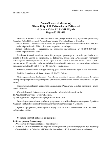Gdańsk, dnia 5 listopada 2014 r. PS-III.9514.33.2014 Protokół kontroli okresowej Glantz II Sp. J. B. Palkowska, A. Palkowski ul. Jana z Kolna 12, 81-351 Gdynia Regon:221782690 Kontrolę, w dniach 30 - 31 października 2014 r., przeprowadzili niżej wymienieni pracownicy Wydziału Polityki Społecznej Pomorskiego Urzędu Wojewódzkiego w Gdańsku: - Tamara Bielesz – inspektor wojewódzki, na podstawie upoważnienia nr PS-I.0030.294.2014 z dnia 16 października 2014 r., kierująca zespołem kontrolnym; - Bożena Dobrowolska – specjalista, na podstawie upoważnienia nr PS-I.0030.294.2014 z dnia 16 października 2014 r. Przedmiot kontroli: ustalenie stanu faktycznego i prawnego w zakresie spełniania przez Glantz II Spółka Jawna B. Palkowska, A. Palkowski, zwaną dalej „Pracodawcą”, warunków i obowiązków określonych w art. 28 ust. 1 pkt 1-3, art. 30 ust. 4 oraz art. 33 ust. 1 i ust. 3 pkt 1 ustawy z dnia 27 sierpnia 1997 r. o rehabilitacji zawodowej i społecznej oraz zatrudniania osób niepełnosprawnych (Dz. U. z 2011 r. Nr 127, poz. 721, z późn. zm.). Jednostką kontrolowaną kierują wspólnicy, pani Bożena Palkowska i pan Adam Palkowski. Siedziba Pracodawcy: ul. Jana z Kolna 12, 81-351 Gdynia. Miejsca prowadzenia działalności – Pracodawca przedstawił zespołowi kontrolnemu do wglądu umowy na wykonywanie usług sprzątania, (aktualny wykaz obiektów stanowi załącznik nr 1 do protokołu). Podstawowym zakresem działalności gospodarczej Pracodawcy są usługi sprzątania i czyszczenia obiektów. W czasie kontroli dokumentację udostępniały i udzielały informacji osoby: 1) Pan Adam Palkowski – Współwłaściciel, 2) Pani Agnieszka Chojnowska – Specjalista ds. kadr i płac. Kontrolę przeprowadzono zgodnie z programem kontroli zaakceptowanym przez Dyrektora Wydziału Polityki Społecznej Pomorskiego Urzędu Wojewódzkiego w Gdańsku. Zgodnie z programem, kontrolą został objęty okres od dnia 1 października 2013 r. do dnia 31 października 2014 r. W trakcie kontroli ustalono, co następuje: 1. Status prawny Pracodawcy: Pracodawca prowadzi działalność na podstawie: Wpisu do KRS Nr 0000439210 Rejestru Przedsiębiorców prowadzonego przez Sąd Rejonowy Gdańsk-Północ w Gdańsku, VIII Wydział Gospodarczy Krajowego Rejestru Sądowego. 1 Decyzji Wojewody Pomorskiego Nr D/02/2013 z dnia 21 marca 2013 r. 2. Spełnianie przez Pracodawcę warunków określonych w art. 28 ustawy z dnia 27 sierpnia 1997 r. o rehabilitacji zawodowej i społecznej oraz zatrudniania osób niepełnosprawnych: 1) stan zatrudnienia ogółem: [..]*osoby ([.]*etaty), w tym niepełnosprawnych [.]*osoby ([..]* etaty). Wszystkie osoby zatrudnione są na podstawie przepisów kodeksu pracy. [.]*osoby ([.]*etatów) mają orzeczony lekki stopień niepełnosprawności, [ ]* osób ([.]* etatów) ma orzeczony umiarkowany stopień niepełnosprawności, [.]*osób ([.]*etatów) ma orzeczony znaczny stopień niepełnosprawności (zestawienie stanowi załącznik nr 2 do protokołu). Pracodawca przedstawił zespołowi kontrolnemu stan zatrudnienia w losowo wybranym czasie kontrolowanego okresu: listopad 2013 r.; marzec, maj, lipiec (zestawienia stanowią załączniki od nr 3 do nr 6 do protokołu), październik 2014 r. (zestawienie stanowi załącznik nr 2 do protokołu). Zespół kontrolny stwierdził, że w okresie poddanym kontroli Pracodawca wypełniał warunki zatrudnienia, określone w art. 28 ust. 1 ustawy z dnia 27 sierpnia 1997 r. o rehabilitacji zawodowej i społecznej oraz zatrudniania osób niepełnosprawnych, dla pracodawców posiadających status zakładu pracy chronionej. W trakcie czynności kontrolnych skontrolowano akta osobowe [.]* osób niepełnosprawnych zatrudnionych w zakładzie: [.]*osób mających orzeczony znaczny stopień niepełnosprawności, [.]*osób mających orzeczony umiarkowany stopień niepełnosprawności, [.]* osób mających orzeczony lekki stopień niepełnosprawności (zestawienie stanowi załącznik nr 7 do protokołu). We wszystkich aktach osobowych, objętych kontrolą, stwierdza się aktualne umowy o pracę (z treści umowy wynika zakres czynności), aktualne zaświadczenia lekarskie o braku przeciwwskazań zdrowotnych do wykonywania pracy na stanowisku oraz orzeczenia o stopniu niepełnosprawności. 2) wskaźnik zatrudnienia osób niepełnosprawnych wynosi [.]*%, wskaźnik zatrudnienia osób niepełnosprawnych z umiarkowanym lub znacznym stopniem niepełnosprawności wynosi [..]*% (stan na dzień kontroli). Pracodawca przedstawił wskaźniki zatrudnienia w ww. miesiącach kontrolowanego okresu. Zespół kontrolny stwierdził, że w okresie poddanym kontroli pracodawca osiągał wartości wskaźników zatrudnienia, określone w art. 28 ust. 1 pkt 1a ustawy z dnia 27 sierpnia 1997 r. o rehabilitacji zawodowej i społecznej oraz zatrudniania osób niepełnosprawnych, dla pracodawców posiadających status zakładu pracy chronionej. 3) obiekt i pomieszczenia w Gdyni przy ul. Jana z Kolna 12, użytkowane w ramach statusu zakładu pracy chronionej na podstawie postanowienia Państwowej Inspekcji Pracy Nr 03073/Pz20/2002 z dnia 21 marca 2002 r., stwierdzające, że obiekt i pomieszczenia odpowiadają przepisom i zasadom bezpieczeństwa i higieny pracy, uwzględniają potrzeby zatrudnionych tu osób niepełnosprawnych w zakresie przystosowania stanowisk pracy, pomieszczeń higienicznosanitarnych i ciągów komunikacyjnych oraz spełniają wymagania dostępności do nich. Ostatnia kontrola Państwowej Inspekcji Pracy, zakończona protokołem Nr 03140-5317-K047-Pt/14, z dnia 3września 2014 r., potwierdziła, że biorąc pod uwagę stopień niepełnosprawności oraz schorzenia niepełnosprawnych zatrudnionych, bariery architektoniczne nie występują. 2 Obiekty i pomieszczenia są przystosowane dla osób niepełnosprawnych stosownie do wymagań dotyczących poszczególnych grup niepełnosprawności osób zatrudnionych. Pomieszczenia higieniczno-sanitarne dostosowa