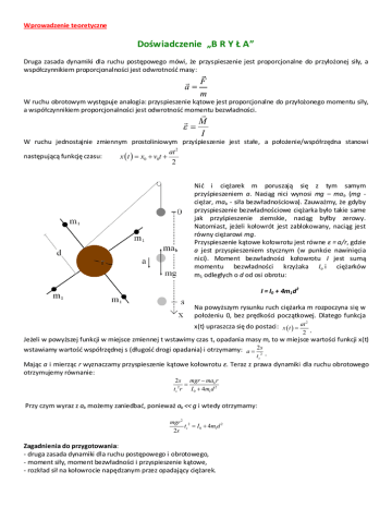 Wprowadzenie teoretyczne Doświadczenie „B R Y Ł A” Druga zasada dynamiki dla ruchu postępowego mówi, że przyspieszenie jest proporcjonalne do przyłożonej siły, a współczynnikiem proporcjonalności jest odwrotność masy: a F m W ruchu obrotowym występuje analogia: przyspieszenie kątowe jest proporcjonalne do przyłożonego momentu siły, a współczynnikiem proporcjonalności jest odwrotność momentu bezwładności. M I W ruchu jednostajnie zmiennym prostoliniowym przyśpieszenie jest stałe, a położenie/współrzędna stanowi następującą funkcję czasu: x t x0 v0t at 2 2 Nić i ciężarek m poruszają się z tym samym przyśpieszeniem a. Naciąg nici wynosi mg – mab (mg ciężar, mab - siła bezwładnościowa). Zauważmy, że gdyby przyspieszenie bezwładnościowe ciężarka było takie same jak przyśpieszenie ziemskie, naciąg byłby zerowy. Natomiast, jeżeli kołowrót jest zablokowany, naciąg jest równy ciężarowi mg. Przyspieszenie kątowe kołowrotu jest równe ε = a/r, gdzie a jest przyspieszeniem stycznym (w punkcie nawinięcia nici). Moment bezwładności kołowrotu I jest sumą momentu bezwładności krzyżaka Io i ciężarków m1 odległych o d od osi obrotu: I = I0 + 4m1d2 Na powyższym rysunku ruch ciężarka m rozpoczyna się w położeniu 0, bez prędkości początkowej. Dlatego funkcja 2 x(t) upraszcza się do postaci: x t at 2 . Jeżeli w powyższej funkcji w miejsce zmiennej t wstawimy czas ts opadania masy m, to w miejsce wartości funkcji x(t) wstawiamy wartość współrzędnej s (długość drogi opadania) i otrzymamy: a 2s t2. s Mając a i mierząc r wyznaczamy przyspieszenie kątowe kołowrotu ε. Teraz z prawa dynamiki dla ruchu obrotowego otrzymujemy równanie: 2s mgr mab r ts 2 r I 0 4m1d 2 Przy czym wyraz z ab możemy zaniedbać, ponieważ ab << g i wtedy otrzymamy: mgr 2 2 ts I 0 4m1d 2 2s Zagadnienia do przygotowania: - druga zasada dynamiki dla ruchu postępowego i obrotowego, - moment siły, moment bezwładności i przyspieszenie kątowe, - rozkład sił na kołowrocie napędzanym przez opadający ciężarek. Szablon metodyczny „B R Y Ł A” Student 1: Wyznaczanie momentu bezwładności metodą dynamiczną w ruchu obrotowym. Student 2: Sprawdzanie II zasady dynamiki w przypadku ruchu obrotowego. Baza teoretyczna a Ruch postępowy: F m Ruch obrotowy: x t 2s mgr mab r ts 2 r I 0 4m1d 2 M I at 2 2 Io – wyznaczany moment bezwładności (samego ‘krzyżaka’, czyli kołowrotu bez ciężarków) Powyższe równanie daje się przekształcić do postaci funkcji liniowej na różne sposoby: mgr 2 2 ts I 0 4m1d 2 2s Zatem, w celu wyznaczenia momentu bezwładności metodą dynamiczną w ruchu obrotowym, należy: - wykonać pomiary czasu spadku ciężarka m na drodze s w zależności od odległości ciężarków m1 od osi obrotu, 2 - sporządzić wykres zależności mgr ts 2 od d 2 2s - odczytać z niego wartość momentu bezwładności I o. 2sI 8sm1d 2 1 ts 2 2sr 2 20 gr 2 m gr Zatem, w celu sprawdzenia II zasady dynamiki w przypadku ruchu obrotowego, należy: - wykonać pomiary czasu spadku ciężarka m na drodze s w zależności od jego masy, - sporządzić wykres zależności ts2 od m-1 - zanalizować jego liniowość. Wskazówki do sprawozdania – wyznaczanie „B R Y Ł A” Student 1: Wyznaczanie momentu bezwładności metodą dynamiczną w ruchu obrotowym. I. Metodyka (ideowy plan ćwiczenia) II. Przebieg ćwiczenia II.1. Przebieg czynności II.2. Szkic układu pomiarowego III. Wyniki III.1. Wyniki pomiarów 1 2 ts [s] d [cm] ts = ... m=… d = ... m = … 3 4 5 6 r=… r = … 7 8 9 10 8 9 10 s=… s = … III.2. Obliczenia (przykładowe – odnoszą się np. do pomiaru nr 5) mgr 2 2 ts ... 2s mgr 2ts 2 gr 2ts 2 mgr ts 2 mgr 2t s 2 mgr 2t s m r s ts ... 2s 2s s 2s 2 s d2 = … d 2 = ... III.3. Wyniki obliczeń 1 2 3 4 5 6 7 2 mgr 2 ts 2s mgr 2 2 ts 2s […] […] d2 […] d2 […] III.4. Wykres + obliczenie współczynnika wysokości b i jego odchylenia Sb IV. Podsumowanie Wyznaczona wartość … wynosi ... Dokładność metody: ... Dodatkowe wnioski, spostrzeżenia, przyczyny niepewności pomiarowych. Wskazówki do sprawozdania – sprawdzanie „B R Y Ł A” Student 2: Sprawdzanie II zasady dynamiki w przypadku ruchu obrotowego. I. Metodyka (ideowy plan ćwiczenia) II. Przebieg ćwiczenia II.1. Przebieg czynności II.2. Szkic układu pomiarowego III. Wyniki III.1. Wyniki pomiarów 1 ts [s] m [g] [g] m ts = ... 2 3 4 5 6 7 8 9 10 6 7 8 9 10 III.2. Obliczenia (przykładowe – odnoszą się do pomiaru nr 3) ts 2 = … Δts 2 = … m-1 = … Δm-1 = … III.3. Wyniki obliczeń 1 2 ts […] -1 m […] Δts 2 […] Δm-1 […] 2 3 4 5 III.4. Wykres IV. Podsumowanie Ponieważ na wykresie … można poprowadzić prostą przechodzącą przez wszystkie prostokąty niepewności pomiarowych, nie ma podstaw do stwierdzenia odstępstwa od … Ewentualnie: Odstępstwo od liniowości w zakresie ... może wynikać z …. Dodatkowe wnioski, spostrzeżenia, przyczyny niepewności pomiarowych.