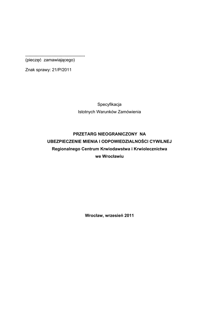 .................................................. (pieczęć zamawiającego) Znak sprawy: 21/P/2011 Specyfikacja Istotnych Warunków Zamówienia PRZETARG NIEOGRANICZONY NA UBEZPIECZENIE MIENIA I ODPOWIEDZIALNOŚCI CYWILNEJ Regionalnego Centrum Krwiodawstwa i Krwiolecznictwa we Wrocławiu Wrocław, wrzesień 2011 SPECYFIKACJA ISTOTNYCH WARUNKÓW ZAMÓWIENIA dotycząca ubezpieczenia mienia i odpowiedzialności cywilnej Regionalnego Centrum Krwiodawstwa i Krwiolecznictwa we Wrocławiu SPECYFIKACJA ISTOTNYCH WARUNKÓW ZAMÓWIENIA NA UBEZPIECZENIE MIENIA I ODPOWIEDZIALNOŚCI CYWILNEJ Regionalnego Centrum Krwiodawstwa i Krwiolecznictwa we Wrocławiu Regionalne Centrum Krwiodawstwa i Krwiolecznictwa im. prof. dr hab. Tadeusza Dorobisza we Wrocławiu 50-345 Wrocław, ul Czerwonego Krzyża 5/9 wrzesień 2011 r. 2 SPECYFIKACJA ISTOTNYCH WARUNKÓW ZAMÓWIENIA dotycząca ubezpieczenia mienia i odpowiedzialności cywilnej Regionalnego Centrum Krwiodawstwa i Krwiolecznictwa we Wrocławiu SPIS TREŚCI CZĘŚĆ A – INFORMACJE OGÓLNE 1. 2. 3. 4. Zamawiający. Przedmiot zamówienia. Podstawa prawna postępowania o udzielenie zamówienia i tryb udzielania zamówienia. Informacja o braku zamiaru zawarcia umowy ramowej i ustanawiania dynamicznego systemu zakupów. 5. Informacja na temat wskazania przez wykonawcę części zamówienia, którą zamierza powierzyć podwykonawcom 6. Informacja o udziale brokera ubezpieczeniowego. CZĘŚĆ B – INSTRUKCJA DLA WYKONAWCÓW 1. 2. 3. 4. 5. 6. 7. 8. 9. 10. 11. 12. 13. 14. 15. 16. 17. Informacje wstępne. Termin wykonania umowy. Warunki udziału w postępowaniu Wymagane oświadczenia i dokumenty Wymagane dokumenty od oferentów zagranicznych Wykonawcy składający ofertę wspólną Sposób porozumiewania się z wykonawcami. Osoby uprawnione do kontaktu z wykonawcami oraz udzielania wyjaśnień. Termin związania ofertą Opis sposobu przygotowania oferty (wymagania ogólne, wprowadzanie zmian i wycofanie oferty, opis sposobu opakowania i oznakowania oferty, składanie ofert. otwarcie ofert) Opis sposobu obliczenia ceny. Kryteria i ocena ofert. Umowa. Wymagania dotyczące zabezpieczenia należytego wykonania umowy. Wykluczenie z postępowania. Odrzucanie ofert. Unieważnienie postępowania. Środki Ochrony Prawnej. CZĘŚĆ C – WYMAGANIA ZAMAWIAJĄCEGO 1. Termin wykonania umowy 2. Wykaz lokalizacji 3. Rodzaj ubezpieczeń 3.1.Ubezpieczenie mienia od ognia i innych zdarzeń losowych. 3.2.Ubezpieczenie odpowiedzialności cywilnej w związku z posiadanym mieniem i wykonywanymi zadaniami. 3.3.Ubezpieczenie sprzętu elektronicznego i medycznego. 3.4.Ubezpieczenie mienia od kradzieży z włamaniem i rabunku wraz z ryzykiem dewastacji. 3.5. Ubezpieczenie mienia w transporcie na terenie RP i w transporcie zagranicznym 3.6 Ubezpieczenia komunikacyjne 4. Klauzule brokerskie oraz dodatkowe zapisy regulujące warunki ubezpieczenia. 5. Płatność składki ZAŁĄCZNIKI DO OFERTY 1) Formularz oferty - Załącznik nr 1 2) Oświadczenie o braku podstaw do wykluczenia - Załącznik nr 2, 3 SPECYFIKACJA ISTOTNYCH WARUNKÓW ZAMÓWIENIA dotycząca ubezpieczenia mienia i odpowiedzialności cywilnej Regionalnego Centrum Krwiodawstwa i Krwiolecznictwa we Wrocławiu 3) Oświadczenie wykonawcy o spełnianiu warunków udziału w postępowaniu określonych w art. 22 ust. 1 ustawy prawo zamówień publicznych - Załącznik nr 3 4) Oświadczenie dotyczące sytuacji finansowej wykonawcy – Załącznik nr 4 5) Formularz cenowy – Załącznik Nr 5, 6) Oświadczenie o powierzeniu wykonywania części zamówienia podwykonawcom - Załącznik Nr 6, 7) Zaparafowany wzór umowy ubezpieczenia – Załącznik nr 7. 8) Wykaz osób uprawnionych do reprezentowania wykonawcy - Załącznik Nr 8. Specyfikacja zawiera 51 ponumerowane strony 4 SPECYFIKACJA ISTOTNYCH WARUNKÓW ZAMÓWIENIA dotycząca ubezpieczenia mienia i odpowiedzialności cywilnej Regionalnego Centrum Krwiodawstwa i Krwiolecznictwa we Wrocławiu CZĘŚĆ A INFORMACJE OGÓLNE 1. Zamawiający: Regionalne Centrum Krwiodawstwa i Krwiolecznictwa im. prof. dr hab. Tadeusza Dorobisza we Wrocławiu Adres: 50-345 Wrocław, ul Czerwonego Krzyża 5/9 NIP: - 898-18-53-248 REGON: - 000291121 - Postępowanie przygotowuje i przeprowadza w imieniu i na rzecz Zamawiającego jako jego Pełnomocnik: Akma-Brokers Sp. z o.o. Ul. Poleska 27 40 – 733 Katowice Przedstawicielstwo we Wrocławiu: ul. Kościuszki 108a/30, 50-441 Wrocław 2. Przedmiot zamówienia. Przedmiotem ubezpieczenia jest: • • ubezpieczenie odpowiedzialności cywilnej Regionalnego Centrum Krwiodawstwa i Krwiolecznictwa we Wrocławiu w związku z posiadanym mieniem i wykonywanymi zadaniami, kod wg Wspólnego Słownika Zamówień (CPV): 66516400-4, ubezpieczenie od ognia i innych zdarzeń losowych mienia stanowiącego własność lub znajdującego się w posiadaniu Regionalnego Centrum Krwiodawstwa i Krwiolecznictwa we Wrocławiu, kod wg Wspólnego Słownika Zamówień (CPV): 66515100-4, • ubezpieczenie od kradzieży z włamaniem i rabunku mienia stanowiącego własność lub znajdującego się w posiadaniu Regionalnego Centrum Krwiodawstwa i Krwiolecznictwa we Wrocławiu, kod wg Wspólnego Słownika Zamówień (CPV): 66515000-3, • ubezpieczenie od wszystkich ryzyk sprzętu elektronicznego stanowiącego własność lub znajdującego się w posiadaniu Regionalnego Centrum Krwiodawstwa i Krwiolecznictwa we Wrocławiu. kod wg Wspólnego Słownika Zamówień (CPV): 66515400-7. • Ubezpieczenia mienia w transporcie krajowym i zagranicznym kod wg Wspólnego Słownika Zamówień (CPV): 66514120-3 • Ubezpieczenia komunikacyjne: Odpowiedzialności Cywilnej posiadaczy pojazdów, Następstwa Nieszczęśliwych Wypadków, Auto Casco wraz z ryzykiem Kradzieży, ubezpieczenie auto assistance; kody wg Wspólnego Słownika Zamówień (CPV): 66516100-1 (OC), 66514110-0 (AC), 66512100-3 (NNW), 66514110-0 (assistance). Dodatkowo od dnia 01.01.2012r. RCKiK podlegać będzie obowiązkowemu ubezpieczeniu odpow