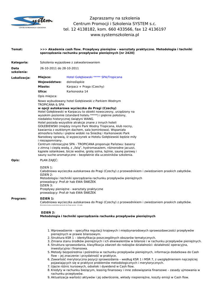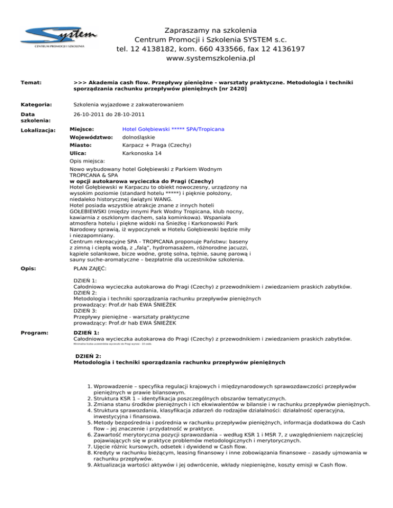 Zapraszamy na szkolenia Centrum Promocji i Szkolenia SYSTEM s.c. tel. 12 4138182, kom. 660 433566, fax 12 4136197 www.systemszkolenia.pl Temat: >>> Akademia cash flow. Przepływy pieniężne - warsztaty praktyczne. Metodologia i techniki sporządzania rachunku przepływów pieniężnych [nr 2420] Kategoria: Szkolenia wyjazdowe z zakwaterowaniem Data szkolenia: 26-10-2011 do 28-10-2011 Lokalizacja: Miejsce: Hotel Gołębiewski ***** SPA/Tropicana Miejsce: Hotel Gołębiewski ***** SPA/Tropicana Województwo: dolnośląskie Województwo: dolnośląskie Miasto: Karpacz ++ Praga (Czechy) Miasto: Karpacz Praga (Czechy) Ulica: Ulica: Opis miejsca: Opis miejsca: Karkonoska 1414 Karkonoska Nowo wybudowany hotel Gołębiewski z Parkiem Wodnym Nowo wybudowany hotel Gołębiewski z Parkiem Wodnym TROPICANA & SPA TROPICANA & SPA ww opcji autokarowa wycieczka dodo Pragi (Czechy) opcji autokarowa wycieczka Pragi (Czechy) Hotel Gołębiewski w Karpaczu to obiekt nowoczesny, urządzony nana Hotel Gołębiewski w Karpaczu to obiekt nowoczesny, urządzony wysokim poziomie (standard hotelu *****) i pięknie położony, wysokim poziomie (standard hotelu *****) i pięknie położony, niedaleko historycznej świątyni WANG. niedaleko historycznej świątyni WANG. Hotel posiada wszystkie atrakcje znane z innych hoteli Hotel posiada wszystkie atrakcje znane z innych hoteli GOŁEBIEWSKI (między innymi Park Wodny Tropicana, klub nocny, GOŁEBIEWSKI (między innymi Park Wodny Tropicana, klub nocny, kawiarnia z oszklonym dachem, sala kominkowa). Wspaniała kawiarnia z oszklonym dachem, sala kominkowa). Wspaniała atmosfera hotelu i piękne widoki nana Śnieżkę i Karkonowski Park atmosfera hotelu i piękne widoki Śnieżkę i Karkonowski Park Narodowy sprawią, iż iż wypoczynek ww Hotelu Gołębiewski będzie miły Narodowy sprawią, wypoczynek Hotelu Gołębiewski będzie miły i niezapomniany. i niezapomniany. Centrum rekreacyjne SPA - TROPICANA proponuje Państwu: baseny Centrum rekreacyjne SPA - TROPICANA proponuje Państwu: baseny z zimną i ciepłą wodą, z „falą”, hydromasażem, różnorodne jacuzzi, z zimną i ciepłą wodą, z „falą”, hydromasażem, różnorodne jacuzzi, kąpiele solankowe, bicze wodne, grotę solna, tężnie, saunę parową i i kąpiele solankowe, bicze wodne, grotę solna, tężnie, saunę parową sauny suche-aromatyczne – bezpłatnie dla uczestników szkolenia. sauny suche-aromatyczne – bezpłatnie dla uczestników szkolenia. Opis: PLAN ZAJĘĆ: DZIEŃ 1: Całodniowa wycieczka autokarowa do Pragi (Czechy) z przewodnikiem i zwiedzaniem praskich zabytków. DZIEŃ 2: Metodologia i techniki sporządzania rachunku przepływów pieniężnych prowadzący: Prof.dr hab EWA ŚNIEŻEK DZIEŃ 3: Przepływy pieniężne - warsztaty praktyczne prowadzący: Prof.dr hab EWA ŚNIEŻEK Program: DZIEŃ 1: Całodniowa wycieczka autokarowa do Pragi (Czechy) z przewodnikiem i zwiedzaniem praskich zabytków. Minimalna liczba uczestników wycieczki do Pragi wynosi - 10 osób. DZIEŃ 2: Metodologia i techniki sporządzania rachunku przepływów pieniężnych 1. Wprowadzenie – specyfika regulacji krajowych i międzynarodowych sprawozdawczości przepływów pieniężnych w prawie bilansowym. 2. Struktura KSR 1 – identyfikacja poszczególnych obszarów tematycznych. 3. Zmiana stanu środków pieniężnych i ich ekwiwalentów w bilansie i w rachunku przepływów pieniężnych. 4. Struktura sprawozdania, klasyfikacja zdarzeń do rodzajów działalności: działalność operacyjna, inwestycyjna i finansowa. 5. Metody bezpośrednia i pośrednia w rachunku przepływów pieniężnych, informacja dodatkowa do Cash flow – jej znaczenie i przydatność w praktyce. 6. Zawartość merytoryczna pozycji sprawozdania – według KSR 1 i MSR 7, z uwzględnieniem najczęściej pojawiających się w praktyce problemów metodologicznych i merytorycznych. 7. Ujęcie różnic kursowych, odsetek i dywidend w Cash flow. 8. Kredyty w rachunku bieżącym, leasing finansowy i inne zobowiązania finansowe – zasady ujmowania w rachunku przepływów. 9. Aktualizacja wartości aktywów i jej odwrócenie, wkłady niepieniężne, koszty emisji w Cash flow. 10. Darowizny, konwersje, dotacje a rachunek przepływów pieniężnych. DZIEŃ 3: Przepływy pieniężne - warsztaty praktyczne 1. Zasady sporządzania rachunku przepływów pieniężnych metodą bezpośrednią. 2. Zastosowanie zestawień technicznych w procesie sporządzania rachunku przepływów pieniężnych metodą pośrednią. 3. Prezentacja zestawień technicznych. 4. Analiza poszczególnych pozycji sprawozdania. 5. Powiązania między zestawieniami pomocniczymi oraz uzgadnianie ich poprawności. 6. Ustalanie wartości korekt wyniku finansowego w działalności operacyjnej, 7. Ustalanie i klasyfikacja wpływów i wydatków z działalności inwestycyjnej i finansowej. 8. Eliminacje zdarzeń niepieniężnych i wartości memoriałowych uwzględnionych przy ustalaniu kwot wpływów i wydatków. 9. Analiza rozbudowanego przykładu liczbowego. 10. Zestawienia pomocnicze jako podstawowe materiały do badania rachunku przepływów pieniężnych. 11. Ogólne uwagi praktyczne dotyczące analityki kont księgowych dla potrzeb rachunku przepływów pieniężnych. Profil uczestników: Szkolenie przeznaczone dla: · jednostek innych niż banki i zakłady ubezpieczeń · księgowych, głównych księgowych, biegłych rewidentów, osób sporządzających rachunek przepływów pieniężnych · analityków finansowych, kadry zarządzającej, pracowników komórek kredytowych banków Forma szkolenia: wykłady i warsztaty Certyfikaty: tak Cena: CENA DATA REJESTRACJI 2 490.00 netto zł./osobę (3 062.70 zł. brutto) do: 17-10-2011 2 740.00 netto zł./osobę (3 370.20 zł. brutto) od: 18-10-2011 RABAT 250.00 zł./osobę W PROMOCJI: 2.490 zł. + 23% VAT, z RABATEM 250 zł .przy zgłoszeniu do 17 października 2011r. Po zakończeniu promocji: 2.740 zł. + 23% VAT Cena zawiera: Przyja