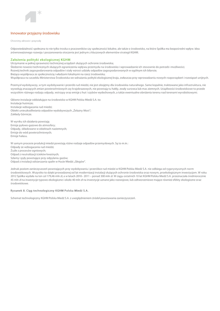 Innowator przyjazny środowisku Chronimy zdrowie i przyrodę Odpowiedzialność społeczna to nie tylko troska o pracowników czy społeczności lokalne, ale także o środowisko, na które Spółka ma bezpośredni wpływ. Idea zrównoważonego rozwoju i poszanowania otoczenia jest jednym z kluczowych elementów strategii KGHM. Założenia polit yki ekologicznej KG H M Utrzymanie w pełnej sprawności technicznej urządzeń służących ochronie środowiska; Śledzenie nowości technicznych służących ograniczeniu wpływu przemysłu na środowisko i wprowadzanie ich stosownie do potrzeb i możliwości; Rozwój technik zagospodarowania odpadów i stały wzrost udziału odpadów zagospodarowanych w ogólnym ich bilansie; Bieżąca współpraca ze społecznością i władzami lokalnymi na rzecz środowiska; Współpraca na szczeblu Ministerstwa Środowiska we wdrażaniu polityki ekologicznej kraju, zwłaszcza przy wprowadzaniu nowych rozporządzeń i rozwiązań unijnych. Przemysł wydobywczy, w tym wydobywanie i przerób rud miedzi, nie jest obojętny dla środowiska naturalnego. Same kopalnie, traktowane jako infrastruktura, nie wywołują znaczących zmian powierzchniowych czy krajobrazowych, nie powstają tu hałdy, zwały surowca lub mas ziemnych. Uciążliwości środowiskowe to przede wszystkim różnego rodzaju odpady, wstrząsy oraz emisje z hut i szybów wydechowych, a także ewentualne obniżenia terenu nad terenami wyrobiskowymi. Główne instalacje oddziałujące na środowisko w KGHM Polska Miedź S.A. to: Instalacje hutnicze; Instalacje wzbogacania rud miedzi; Obiekt unieszkodliwiania odpadów wydobywczych „Żelazny Most”; Zakłady Górnicze. W wyniku ich działania powstają: Emisje pyłowo-gazowe do atmosfery; Odpady, składowane w obiektach naziemnych; Emisje do wód powierzchniowych; Emisje hałasu. W samym procesie produkcji miedzi powstają różne rodzaje odpadów przemysłowych. Są to m.in.: Odpady ze wzbogacania rud miedzi; Żużle z procesów ogniowych; Odpad z neutralizacji ścieków kwaśnych; Szlamy i pyły powstające przy odpylaniu gazów; Odpad z instalacji odsiarczania spalin w Hucie Miedzi „Głogów”. Jednak poziom zanieczyszczeń powstających przy wydobywaniu i przeróbce rud miedzi w KGHM Polska Miedź S.A. nie odbiega od rygorystycznych norm środowiskowych. Wszystko to dzięki prowadzonej od lat modernizacji instalacji służących ochronie środowiska oraz nowym, proekologicznym inwestycjom. W roku 2012 Spółka wydała na ten cel 179,46 mln zł, a w latach 2010– 2011 – ponad 300 mln zł. W ciągu ostatnich 10 lat KGHM Polska Miedź S.A. przeznaczała średniorocznie 45 mln zł na inwestycje typowo ekologiczne i około 40 mln zł na inwestycje uznane jako rozwojowe, lub odtworzeniowe mające również efekty ekologiczne oraz środowiskowe. R y s unek 8. Ciąg t echnologiczny K GHM P ols k a Miedź S.A . Schemat technologiczny KGHM Polska Miedź S.A. z uwzględnieniem źródeł powstawania zanieczyszczeń. Wszystkie instalacje mające wpływ na środowisko muszą posiadać stosowne zezwolenia organów administracji publicznej. Oddziały Spółki posiadają sektorowe decyzje administracyjne zezwalające na korzystanie ze środowiska. W przypadku ośmiu instalacji zgodnie z ustawą Prawo Ochrony Środowiska wymagane jest posiadanie pozwolenia zintegrowanego, którymi dysponuje KGHM Polska Miedź S.A. Łączne ustawowe opłaty za korzystanie ze środowiska, poniesione przez Oddziały KGHM Polska Miedź S.A. w 2012 roku, wyniosły 26,96 mln zł i były wyższe o 1,48 mln zł niż rok wcześniej. Zmiana ta wynika głównie ze wzrostu stawek opłat za korzystanie ze środowiska. W 2012 roku najwyższe opłaty Spółka uiściła za zrzut ścieków: 17,36 mln zł, w tym 17,35 mln zł za odprowadzanie wód z obiektu unieszkodliwiania odpadów „Żelazny Most”. EN1 Wy k o rzy s ta n e s u ro w ce / ma teri a ły w ed łu g w a g i i o b jęto ś ci 1) Jed n o s tk a mi a ry 2010 2011 2012 Mg 30 805 183 31 240 837 31 725 395 Wydobycie rud miedzi Emis j a oł owiu do powiet r za z zak ł adów K GHM P ols k a MI edź S.A . (t /r ) Emis j a miedzi do powiet r za z zak ł adów K GHM P ols k a MI edź S.A . (t /r )