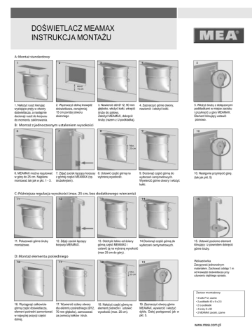 DOŚWIETLACZ MEAMAX INSTRUKCJA MONTAŻU A: Montaż standardowy 1 2 3 4 5 Mind. 15 cm 1. Nałożyć ruszt kierując wystające pręty w otwory doświetlacza, a następnie docisnąć ruszt do korpusu do momentu zaklinowania. 2. Wyznaczyć dolną krawędź doświetlacza, conajmniej 15 cm poniżej otworu okiennego 3. Nawiercić dół Ø 12, 90 mm głęboko, włożyć kołki, wkręcić śruby do połowy. Założyć MEAMAX, dokręcić śruby (razem z U-podkładką). 4. Zaznaczyć górne otwory, nawiercić i włożyć kołki. 5. Włożyć śruby z dołączonymi podkładkami w miejce zacisku i przykręcić u góry MEAMAX. Element klinujący ustawić pionowo. B: Montaż z jednoczesnym ustaleniem wysokości 6 7 8 9 10 Max. 25 cm 6. MEAMAX można regulować w górę do 25 cm. Najpierw montować tak jak w pkt. 1 - 3. 7. Zdjąć zacisk łączący korpusy 8. Ustawić część górną na z górnej części MEAMAX (np. wybraną wysokość. śrubokrętem). 9. Docisnąć część górną do wytłoczeń centymetrowych. Wywiercić górne otwory i włożyć kołki. 10. Następnie przykręcić górę. (tak jak pkt. 5) C: Późniejsza regulacja wysokości (max. 25 cm, bez dodatkowego wiercenia) 11 11. Poluzować górne śruby montażowe. 12 12. Zdjąć zacisk łączący korpusy MEAMAX. D: Montaż elementu pośredniego 16 17 13 14 14.Docisnąć część górną do 13. Odchylić lekko od ściany górną część MEAMAX i wytłoczeń centymetrowych. ustawić ją na wybraną wysokość (max 25 cm do góry) . 18 19 15 15. Ustawić poziomo element klinujący i z powrotem dokręcić górne śruby. Wskazówka Zasypywać jednorodnym materiałem. Zachować odstęp 1 m od krawędzi doświetlacza przy używaniu ciężkiego sprzętu. Max. 25 cm Zestaw montażowy 16. Wyciągnąć całkowicie górną część doświetlacza, element pośredni zamontować w najwyżej pozycji części dolnej. 17. Wywiercić cztery otwory 18. Nałożyć część górną na dla elemntu pośredniego (Ø12, element pośredni i ustawić wysokość (max. 25 cm). 70 mm głęboko), zamocować za pomocą kołków i śrub. 19. Zaznaczyć otwory górne MEAMAX, wywiercić i włożyć dyble. Dalej postępować jak w pkt. 5. • 4 kołki F12, czarne • 2 podkładki 40 x 9 x 2,5 • 2 U-podkładki • 4 śruby 8 x 90 • 2 MEAMAX zaciski, czarne www.mea.com.pl