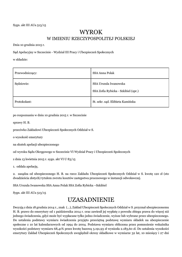 Sygn. akt III AUa 513/15 WYROK W IMIENIU RZECZYPOSPOLITEJ POLSKIEJ Dnia 10 grudnia 2015 r. Sąd Apelacyjny w Szczecinie - Wydział III Pracy i Ubezpieczeń Społecznych w składzie: Przewodniczący: SSA Anna Polak Sędziowie: SSA Urszula Iwanowska SSA Zofia Rybicka - Szkibiel (spr.) Protokolant: St. sekr. sąd. Elżbieta Kamińska po rozpoznaniu w dniu 10 grudnia 2015 r. w Szczecinie sprawy H. B. przeciwko Zakładowi Ubezpieczeń Społecznych Oddział w S. o wysokość emerytury na skutek apelacji ubezpieczonego od wyroku Sądu Okręgowego w Szczecinie VI Wydział Pracy i Ubezpieczeń Społecznych z dnia 13 kwietnia 2015 r. sygn. akt VI U 83/15 1. oddala apelację, 2. zasądza od ubezpieczonego H. B. na rzecz Zakładu Ubezpieczeń Społecznych Oddział w S. kwotę 120 zł (sto dwadzieścia złotych) tytułem zwrotu kosztów zastępstwa procesowego w instancji odwoławczej. SSA Urszula Iwanowska SSA Anna Polak SSA Zofia Rybicka –Szkibiel Sygn. akt III AUa 513/15 UZASADNIENIE Decyzją z dnia 18 grudnia 2014 r., znak (...), Zakład Ubezpieczeń Społecznych Oddział w S. przyznał ubezpieczonemu H. B. prawo do emerytury od 1 października 2014 r. oraz zawiesił jej wypłatę z powodu zbiegu prawa do więcej niż jednego świadczenia, gdyż może być wypłacane tylko jedno świadczenie, wyższe lub wybrane przez ubezpieczonego. Do ustalenia podstawy wymiaru świadczenia przyjęto przeciętną podstawę wymiaru składek na ubezpieczenie społeczne z 10 lat kalendarzowych od 1994 do 2004. Podstawa wymiaru obliczona przez pomnożenie wskaźnika wysokości podstawy wymiaru 68,41% przez kwotę bazową 3.191,93 zł wyniosła 2.183,60 zł. Do ustalenia wysokości emerytury Zakład Ubezpieczeń Społecznych uwzględnił okresy składkowe w wymiarze 32 lat, 10 miesięcy i 27 dni tj. 394 miesięcy, okresy nieskładkowe w wymiarze 9 miesięcy i 27 dni tj. 9 miesięcy. Wysokość emerytury została obliczona w następujący sposób 24% x 3.191,93 zł = 766,06 zł; (394x 1,3%)/12 x 2.183,60 zł = 931,96 zł; (9 x 0,7%)/12 x 2.183,60 zł = 11,57 zł; Razem 1.709,59 zł. Zgodnie z art. 5 ust. 2a do stażu pracy nie uwzględniono okresów pełnienia służby wojskowej. Odwołanie od powyższej decyzji wniósł ubezpieczony, który wskazał, iż wyliczona przez organ rentowy kwota emerytury 1 709,59 zł jest dla niego, jako rencisty po groźnym wypadku, któremu uległ w czasie pełnienia służby wojskowej, znaczącą sumą, niezbędną ze względu na koszty ustawicznego leczenia związane z kalectwem. Zdaniem ubezpieczonego emerytura powinna być mu wypłacana równolegle do wojskowej renty inwalidzkiej. W odpowiedzi na odwołanie organ rentowy wniósł o jego oddalenie, podtrzymując dotychczasową argumentację. Wyrokiem z dnia 13 kwietnia 2015 r. Sąd Okręgowy w Szczecinie VI Wydział Pracy i Ubezpieczeń Społecznych oddalił odwołanie ubezpieczonego. Sąd Okręgowy wydając rozstrzygnięcie ustalił, że H. B. urodził się (...) Pełnił służbę wojskową od 3 maja 1978 r do 22 listopada 1990 r, a rozkazem personalnym z dnia 8 października 1990 r. został zwolniony z zawodowej służby wojskowej i przeniesiony w stan spoczynku z powodu ustalenia przez wojskową komisję lekarską niezdolności do tej służby z dniem 22 listopada 1990 r. Decyzją Wojskowego Biura Emerytalnego z dnia 20 marca 1991 r. H. B., na podstawie ustawy z dnia 16 grudnia 1972 r. o zaopatrzeniu emerytalnym żołnierzy zawodowych i ich rodzin, nabył prawo do renty z tytułu inwalidztwa 3 grupy pozostającego w związku ze służbą wojskową. Do stażu uwzględniono okresy pełnienia służby wojskowej od 27 kwietnia 1966 r. do 17 kwietnia 1968 r. oraz od 3 maja 1978 r. do 21 listopada 1990 r. Decyzją zamienną z dnia 24 lutego 1997 r. Wojskowe Biuro Emerytalne w S., działając w oparciu o przepisy ustawy z dnia 10 grudnia 1993 r. o zaopatrzeniu emerytalnym żołnierzy zawodowych i ich rodzin, ustaliło ubezpieczonemu nową wysokość świadczenia. Na 50% wymiar świadczenia złożyło się 40 % wobec zaliczenia ubezpieczonego do III grupy inwalidów oraz 10% z tytułu inwalidztwa uzasadniającego przyznanie świadczenia odszkodowawczego. Decyzją z dnia 9 października 2006 r. Wojskowe Biuro Emerytalne w S. ustaliło ubezpieczonemu nową wysokość świadczenia wobec zaliczenia wnioskodawcy do II grupy inwalidów w związku ze służbą wojskową orzeczeniem (...) z dnia 23 marca 2005 r. Ustalono, iż procentowy wymiar świadczenia wynosi 80% - 70% wobec zaliczenia ubezpieczonego do II grupy inwalidów, 10% z tytułu inwalidztwa w związku ze świadczeniami odszkodowawczymi. Sąd I instancji ustalił ponadto, że wojskowa renta inwalidzka po waloryzacji, tj. od dnia 1 marca 2014 r. wypłacana jest ubezpieczonemu w kwocie 2 090,46 zł. Wysokość ustalonej przez Zakład Ubezpieczeń Społecznych emerytury wyniosła 1 709,59 zł. Sąd Okręgowy wydał rozstrzygnięcie w oparciu o przepisy art. 95 ust. 1, art. 96 ust. 1 pkt 1 ustawy o emeryturach i rentach z FUS oraz art. 7 ustawy z dnia 10 grudnia 1993 r. o zaopatrzeniu emerytalnym żołnierzy zawodowych oraz ich rodzin, a także mając na uwadze treść art. 54 ust. 1, art. 11 oraz art. 30 ust. 1 ustawy z dnia 29 maja 1974 r. o zaopatrzeniu inwalidów wojennych i wojskowych oraz ich rodzin. Sąd I instancji wskazał, że spór w istocie sprowadza się do interpretacji przepisów i ustalenia, czy ubezpieczony jest uprawniony do pobierania jednocześnie prawa do świadczenia rentowego i emerytalnego. Ubezpieczony inwalidą stał się jako żołnierz zawodowy, a więc nie może być uznany za inwalidę wojskowego w rozumieniu przepisów ustawy o zaopatrzeniu inwalidów wojennych i wojskowych oraz ich rodzin, nie jest także inwalidą wojennym. W związku z tym nie ma on prawa do zbiegu świadczeń. Stanowisko takie zaprezentował także Sąd Najwyższy. Sąd Okręgowy zaznaczył, że wypłata emerytury nie może być dokonywana, skoro wypłacana jest renta wojskowa jako 