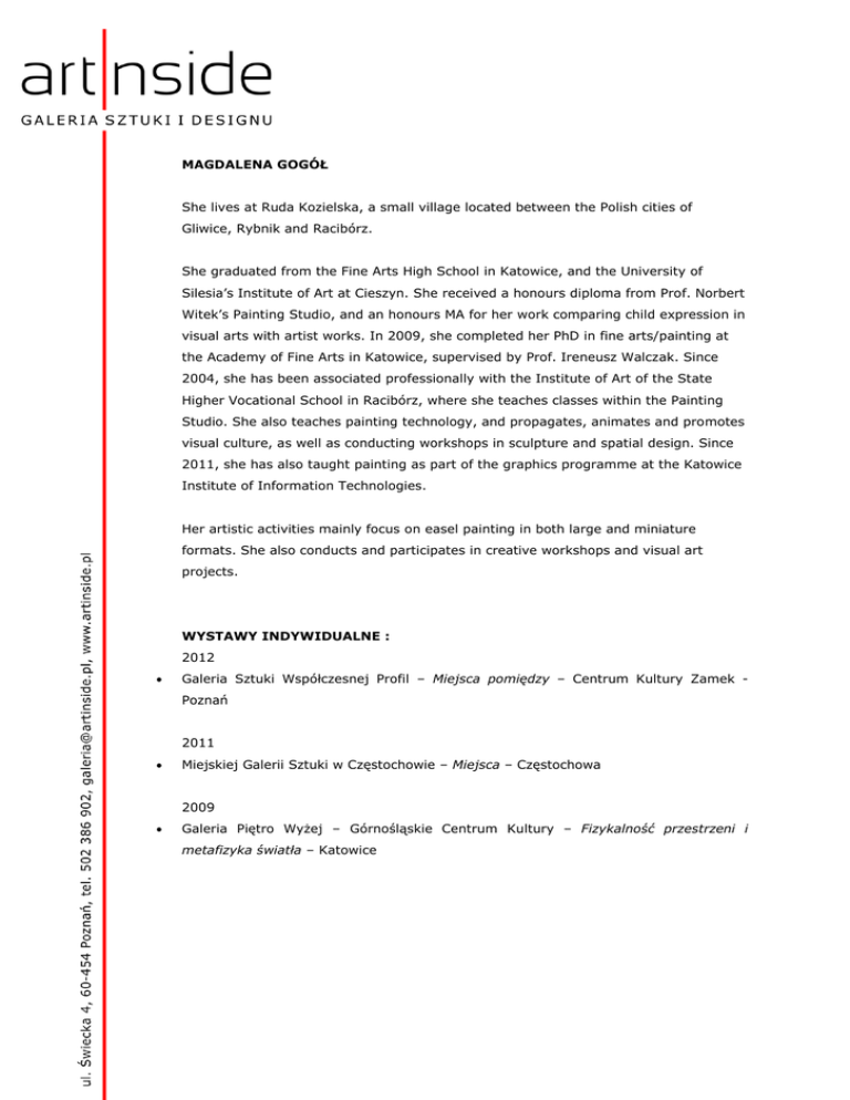 MAGDALENA GOGÓŁ She lives at Ruda Kozielska, a small village located between the Polish cities of Gliwice, Rybnik and Racibórz. She graduated from the Fine Arts High School in Katowice, and the University of Silesia’s Institute of Art at Cieszyn. She received a honours diploma from Prof. Norbert Witek’s Painting Studio, and an honours MA for her work comparing child expression in visual arts with artist works. In 2009, she completed her PhD in fine arts/painting at the Academy of Fine Arts in Katowice, supervised by Prof. Ireneusz Walczak. Since 2004, she has been associated professionally with the Institute of Art of the State Higher Vocational School in Racibórz, where she teaches classes within the Painting Studio. She also teaches painting technology, and propagates, animates and promotes visual culture, as well as conducting workshops in sculpture and spatial design. Since 2011, she has also taught painting as part of the graphics programme at the Katowice Institute of Information Technologies. Her artistic activities mainly focus on easel painting in both large and miniature formats. She also conducts and participates in creative workshops and visual art projects. WYSTAWY INDYWIDUALNE : 2012 Galeria Sztuki Współczesnej Profil – Miejsca pomiędzy – Centrum Kultury Zamek Poznań 2011 Miejskiej Galerii Sztuki w Częstochowie – Miejsca – Częstochowa 2009 Galeria Piętro Wyżej – Górnośląskie Centrum Kultury – Fizykalność przestrzeni i metafizyka światła – Katowice 2008 Klub Niezależnych Stowarzyszeń Twórczych Marchołt – inside-beside-outside – Katowice Galeria Epicentrum – wnętrzność z zewnątrz – Jastrzębie Zdrój 2007 Galeria 3 2 0 (z Prof. Kazimierzem Cieślikiem)- Festiwal Nauki i Sztuki – wnętrzność– Bielsko Biała Galeria Fundacji Elektrowni Rybnik - wnętrzność - Rybnik Galeria Forma – malarstwo – wystawa z okazji XV Finału WOŚP – Kuźnia Raciborska 2006 Galeria Klubu Akademickiego – malarstwo – Uniwersytet Opolski – Opole Galeria MDK – z perspektywy przyziemnej” – Mikołów 2005 Galeria Na Sali – malarstwo – DK Olza Galeria sztuki – malarstwo – Rybnickie Centrum Kultury– Rybnik Galeria Panorama – malarstwo - GCK – Jastrzębie Zdrój Galeria Sikornik – ego-kolor – Gliwice Mĕstská Galerie – malarstwo – Odry – Czechy 2004 Galeria Plamy- perspektywa egocentryczna – Rybnik 2001 Galeria TPZR – designed by … MAGDA GOGÓŁ” – Racibórz Galeria Epicentrum – TO JA – Jastrzębie Zdrój Galeria Stalowe Anioły – Sielsko- anielskie – Bytom 1999 Galeria MOK – pamiętam, wiem, przypuszczam… – instalacja i malarstwo – Powiatowa Inauguracja Roku Kulturalnego – Kuźnia Raciborska 1998 Galeria Antresola– malarstwo – Tarnowskie Góry Galeria Plenerowa Sorrento – malarstwo– Zabrze 1997 Galeria Przewiązka – malarstwo - Instytut Sztuki – Cieszyn Galeria Rotunda – malarstwo– Bytom WAŻNIEJSZE PROJEKTY I WYSTAWY ZBIOROWE : 2012 7 Międzynarodowe Biennale Miniatury – Częstochowa 2012 Wystawa miniatury malarskiej studentów IS PWSZ z pracowni Magdaleny GogółPeszke – małe obrazy o większym znaczeniu – Galeria RCI – Racibórz wystawa artystów-pedagogów I S PWSZ w Raciborzu oraz studentów i absolwentów kierunku: edukacja artystyczna w zakresie sztuk plastycznych - PRZEGLĄDARKA 1/1 Powiatowe Muzeum Ziemi Głubczyckiej Wystawa studentów i wykładowców Instytutu Sztuki PWSZ Racibórz – … w czasie - Galeria RCK – Racibórz 2011 VI Międzynarodowe Biennale Malarstwa i Tkaniny – Barwy i Faktury – Gdynia 2011 III Międzynarodowym Biennale Obrazu "QUADRO-ART" 2011 – Łódź 2011 CZAS-TIME-ZEIT – Wystawa międzynarodowa - Zamek Piastowski – Racibórz zdarzenia-zderzenia – cykl wystaw zbiorowych pedagogów IS PWSZ w Raciborzu – Zabrze, Racibórz, Wodzisław Jesienne Konfrontacje II Triennale Polskiego Malarstwa Współczesnego Rzeszów 2010 Galeria Umelcov Spisa w Novej Spisskiej Vsi - Słowacja 2010 II Międzynarodowy Konkurs Malarski - Przestrzeń Publiczna - Konteksty – Poznań 2010 Jesienne Konfrontacje II Triennale Polskiego Malarstwa Współczesnego Rzeszów 2010 VII Triennale Sztuki SACRUM – Dom -droga istnienia – Miejska Galeria Sztuki – Częstochowa II Międzynarodowe Biennale Obrazu Quadro-Art , Łódź 2009 8 Triennale Małych Form Malarskich –Galeria Sztuki Wozownia – Toruń 2010 Sen na jawie – Muzeum Miejskie w Siemianowicach XI Festiwal Sztuki Wysokiej –… od …do i pomiędzy – Bytom 2010 2009 I Międzynarodowy Konkurs Malarski - Obraz przestrzeni Publicznej – Poznań 2009 II Rybnik Art. Festiwal – Rybnik 2009 Z jawy – Galeria Marchołt - Katowice Wystawa twórczości artystów - pedagogów Instytutu Sztuki PWSZ w Raciborzu – Galeria Student – Ostrawa - Czechy Postawy 2009 - BWA Leszno Z bliska - Galeria Znad Wiliji – Wilno – Litwa X Festiwal Sztuki Wysokiej – Ciepłem skojarzeni – Bytom 2009 Plener Malarski Polsko-Czeski – Tworków 2009 2008 Festiwal Polskiego Malarstwa Współczesnego– Zamek Książąt Pomorskich – Szczecin 2008 Rybnik Art Festiwal 2008 I Międzynarodowe Biennale Obrazu – Quadro-art. - Łódź, 2007 IV Ogólnopolskie Biennale Malarstwa i Tkaniny Unikatowej - Trójmiasto '2007 Jesienne Konfrontacje Triennale Polskiego Malarstwa Współczesnego Rzeszów 2007 – najlepsze obrazy - Galeria Umelcov Spisa w Novej Spisskiej Vsi - Słowacja ze snu – Galeria Na II P – Gliwice 2007 udział w IV Wodzisławskim Przeglądzie Kina Uffowego – w kat. animacja, eksperyment - reż. animacja Podryw - Prezentacje Filmu Artystycznego Video-Art. Projekt Experimentart – Rybnik 2007 Jesienne Konfrontacje Triennale Polskiego Malarstwa Współczesnego - Rzeszów 2007 7 Triennale Małej Formy Malarskiej –Galeria Sztuki Wozownia - Toruń 2007- Wystawa -15 lat Ogólnopolskiego Konkursu Sztuki im. Vincenta Van Gogha – Muzeum Śląskie – Katowice Wystawa Absolwentów Pa
