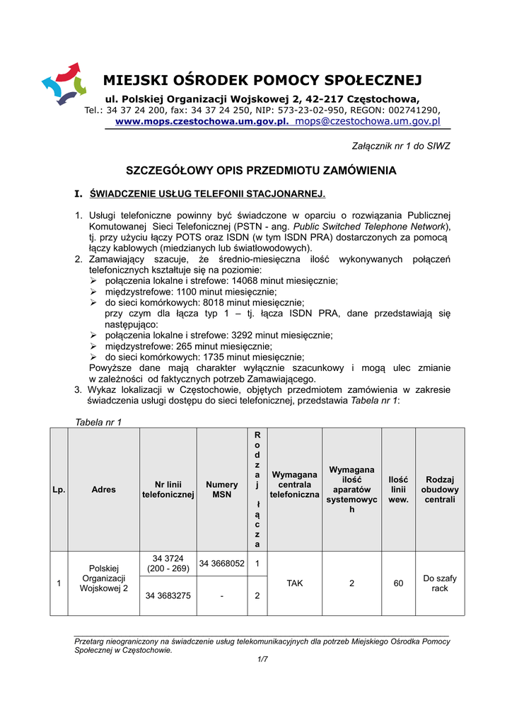 MIEJSKI OŚRODEK POMOCY SPOŁECZNEJ ul. Polskiej Organizacji Wojskowej 2, 42-217 Częstochowa, Tel.: 34 37 24 200, fax: 34 37 24 250, NIP: 573-23-02-950, REGON: 002741290, www.mops.czestochowa.um.gov.pl. [email protected] Załącznik nr 1 do SIWZ SZCZEGÓŁOWY OPIS PRZEDMIOTU ZAMÓWIENIA I. ŚWIADCZENIE USŁUG TELEFONII STACJONARNEJ. 1. Usługi telefoniczne powinny być świadczone w oparciu o rozwiązania Publicznej Komutowanej Sieci Telefonicznej (PSTN - ang. Public Switched Telephone Network), tj. przy użyciu łączy POTS oraz ISDN (w tym ISDN PRA) dostarczonych za pomocą łączy kablowych (miedzianych lub światłowodowych). 2. Zamawiający szacuje, że średnio-miesięczna ilość wykonywanych połączeń telefonicznych kształtuje się na poziomie: połączenia lokalne i strefowe: 14068 minut miesięcznie; międzystrefowe: 1100 minut miesięcznie; do sieci komórkowych: 8018 minut miesięcznie; przy czym dla łącza typ 1 – tj. łącza ISDN PRA, dane przedstawiają się następująco: połączenia lokalne i strefowe: 3292 minut miesięcznie; międzystrefowe: 265 minut miesięcznie; do sieci komórkowych: 1735 minut miesięcznie; Powyższe dane mają charakter wyłącznie szacunkowy i mogą ulec zmianie w zależności od faktycznych potrzeb Zamawiającego. 3. Wykaz lokalizacji w Częstochowie, objętych przedmiotem zamówienia w zakresie świadczenia usługi dostępu do sieci telefonicznej, przedstawia Tabela nr 1: Tabela nr 1 Lp. Adres Nr linii telefonicznej Numery MSN R o d z a j Wymagana centrala telefoniczna ł ą c z a 1 Polskiej Organizacji Wojskowej 2 34 3724 (200 - 269) 34 3668052 - Ilość linii wew. Rodzaj obudowy centrali 2 60 Do szafy rack 1 TAK 34 3683275 Wymagana ilość aparatów systemowyc h 2 _______________________________________________________________________________________ Przetarg nieograniczony na świadczenie usług telekomunikacyjnych dla potrzeb Miejskiego Ośrodka Pomocy Społecznej w Częstochowie. 1/7 MIEJSKI OŚRODEK POMOCY SPOŁECZNEJ ul. Polskiej Organizacji Wojskowej 2, 42-217 Częstochowa, Tel.: 34 37 24 200, fax: 34 37 24 250, NIP: 573-23-02-950, REGON: 002741290, www.mops.czestochowa.um.gov.pl. [email protected] 2 Nowowiejskiego 26 3 Jasnogórska 34 4 Niepodległości 20/22 IV piętro 5 Staszica 10 6 Nowowiejskiego 15 34 3243822 - 2 34 3683212 - 2 34 3615943 - 2 Dodatkowy numer - 2 34 3709404 34 3709414 2 34 3633234 2 - 34 3630207 34 3630209 2 Dodatkowy numer - 2 34 3444944 34 3444945 2 34 3444946 34 3444947 2 34 3214085 34 3214086 2 34 3710282 - 2 Dodatkowy numer - 2 TAK 0 8 naścienna TAK 0 8 naścienna TAK 0 30 naścienna TAK 0 28 Do szafy rack lub naścienna TAK 0 12 naścienna TAK 0 12 naścienna 7 Kilińskiego 13 8 Niepodległości 20/22 parter 34 3631819 34 3639506 2 TAK 0 8 naścienna 9 Warszawska 13 34 3631188 - 2 NIE - - - 10 Al. Pokoju 13 34 3628359 - 2 NIE - - - 4. Centrala telefoniczna z pozycji 1 powinna dodatkowo obsługiwać linię telefoniczną ISDN BRA (2B+D) użyczoną Zamawiającemu przez inny podmiot (przekierowywanie połączeń przychodzących na określony numer wewnętrzny, realizowanie połączeń wychodzących na określony zakres numerów za pomocą tej konkretnej linii telefonicznej). 5. Obecny operator to Orange, za wyjątkiem poz. 5 (ul. Staszica 10) – Globitel. Dotychczasowy rodzaj łącza w tej lokalizacji: VOIP. 6. Dodatkowy numer telefoniczny – oznacza konieczność dostarczenia dodatkowego numeru telefonicznego oprócz obecnie używanych w danej lokalizacji. 7. Wymagana centrala telefoniczna – oznacza konieczność dostarczenia, skonfigurowania i serwisowania przez Wykonawcę centrali telefonicznej przez cały okres trwania umowy. Centrala zostaje wydzierżawiona Zamawiającemu, a płatności za dzierżawę, serwisowanie i zachowanie gotowości serwisowej, zostaną uwzględnione w wysokości opłaty abonamentowej dla każdego łącza. Zarówno centrala telefoniczna jak i aparaty systemowe, muszą być fabrycznie nowe, wyprodukowane przez tego samego producenta. _______________________________________________________________________________________ Przetarg nieograniczony na świadczenie usług telekomunikacyjnych dla potrzeb Miejskiego Ośrodka Pomocy Społecznej w Częstochowie. 2/7 MIEJSKI OŚRODEK POMOCY SPOŁECZNEJ ul. Polskiej Organizacji Wojskowej 2, 42-217 Częstochowa, Tel.: 34 37 24 200, fax: 34 37 24 250, NIP: 573-23-02-950, REGON: 002741290, www.mops.czestochowa.um.gov.pl. [email protected] 8. Łącze typ 1 – łącze ISDN PRA co najmniej 15 B+D, z obsługą co najmniej 70 numerów DDI. 9. Łącze typ 2 – łącze z nielimitowanymi połączeniami do sieci krajowych w ramach opłaty abonamentowej. 10. Wymagania ogólne wobec Wykonawcy: 1) bezpłatny ruch w grupie Zamawiającego pomiędzy wszystkimi numerami; 2) wykonywanie bezpłatnych połączeń do służb powołanych ustawowo do niesienia pomocy, tj. na wszystkie numery określane jako alarmowe (112, 999, 998, 997, 991, ...) w tym numer 986 – Straż Miejska; 3) świadczenie usług telefonicznych w zakresie połączeń: lokalnych (strefowych), międzymiastowych, międzynarodowych, do sieci komórkowych, z numerami alarmowymi, informacyjnymi, biurem numerów oraz świadczenie usług faksowych; 4) utworzenie wirtualnej centrali obejmującej wszystkie lokalizacje i numery telefoniczne Zamawiającego w sposób umożliwiający przełączanie rozmów telefonicznych pomiędzy poszczególnymi lokalizacjami oraz obsługę skróconego wybierania numerów telefonicznych; 5) sekundowe naliczanie dla połączeń krajowych w każdym rodzaju ruchu bez opłat inicjujących za rozpoczęte połączenie; 6) jednolita stawka za połączenia przez całą dobę; 7) Wykonawca nie zmieni w trakcie wykonywania umowy wysokości abonamentów oraz cen połączeń w sposób niekorzystny dla Zamawiającego, dopuszczalne są jedynie zmiany wynikające ze zmian stawek podatku VAT. W takim przypadku zmianie ulegnie wysokość wynagrodzenia Wykonawcy brutto – wynagr
