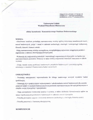 Zal4cznikdo uchwalynr 5 Senatu UL podjetejna 1. roboczymposiedzeniu Dosiedzeniuw dniu 17 wtzegnia2012 t. UniwersytetL6dzki Wydzial Filozoficzno-Historyczny StudiumDoktoranckiego efektyksztalceniaHumanistycznego WIEDZA teorii, -Absolwencistudiumposiadaj4zaawansowanA wiedzEog6lnqdotyczqcqzasadniczych pojgi i zasadw zakresiearcheologii,etnologiii antropologiikulturowej, metodbadawczych, filozofii,historiii historii sztuki. polskiei -Majqzaawansowan4 najnowszeosi4gniEcia uwzglqdniaj4c4 wiedzEszczeg6lowau zagranicmez zakesu obowiqgujqcychdysclplin. -Wykazuj4siEmajomoSci4metodykii metodologiiwspomnianych dyscyplinnabatdzojuz w szkole metodykinauczania poziomie.Dotyczyto takzedobrejznajomoSci zaawansowanym wyZszej. i posiadajq og6lnE - Znaj4zasady projektowbadawczych ocenypublikacjinaukouych, badairnaukowych. w zasadach finansowania orientacjq UMIEJqTNOSCI - Posiadaj4umiejgtnosciwprowadzaniado obiegu naukowegonowych wynik6w badan (publikacje), dla szeroko - OrientujqsiEw prakfyczrymwykorzystaniui udoskonalaniu metodbadawczych w lub specjalistycmym pojgtychbadanw naukachhistorycmychnapoziomiezaawansowanym obrEbieswojejdyscyplinyi specjalnodci. - Maj4 umiejgtnoscikrytycznej analizyi syntezy,a tak2ezdolnoici formulowanias4d6wna w zakresie swoichd.vscyplin' problem6wbadawczych tematwsp6lczesnych historiasztuki) (archeologia. etnologia. - Potrafi4 terenowe prowadziczajgciai cwiczenia - Potrafiqpracowaiz literaturqobcojqzycznE KOMPETENCJE c * - Ponoszq odpowiedzialnojiz rv.lasn4 pracgi wsp6lpracownik6w. - Posiadaj4kompetencjedo prov.'adzdniasamodzielnejpracy naukoweji doskonaleniaetosutej pracy. - s4 Swiadomirori uczonegowe rvspolczesnym, demokratyczrymspoleczeristwie. - Sqtolerancyjnidla innychprzokonari, religii, rasikultur. - Prryczyniai4 sipdopostgpu spole*znego i kurhrrowego w spoleczefistwie oparty m nawiedzy.