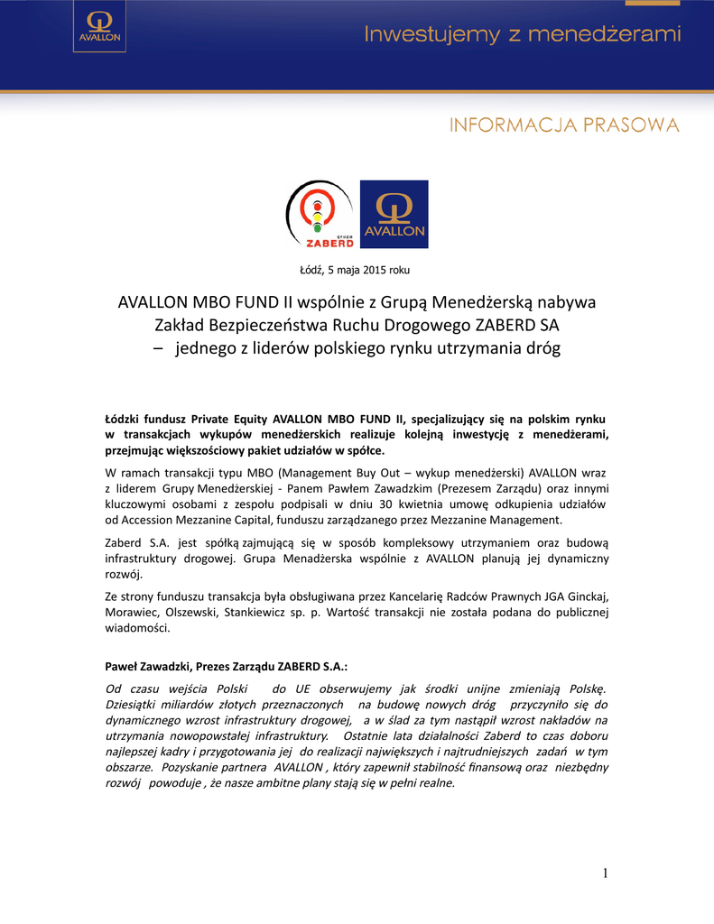 Łódź, 5 maja 2015 roku AVALLON MBO FUND II wspólnie z Grupą Menedżerską nabywa Zakład Bezpieczeństwa Ruchu Drogowego ZABERD SA – jednego z liderów polskiego rynku utrzymania dróg Łódzki fundusz Private Equity AVALLON MBO FUND II, specjalizujący się na polskim rynku w transakcjach wykupów menedżerskich realizuje kolejną inwestycję z menedżerami, przejmując większościowy pakiet udziałów w spółce. W ramach transakcji typu MBO (Management Buy Out – wykup menedżerski) AVALLON wraz z liderem Grupy Menedżerskiej ‐ Panem Pawłem Zawadzkim (Prezesem Zarządu) oraz innymi kluczowymi osobami z zespołu podpisali w dniu 30 kwietnia umowę odkupienia udziałów od Accession Mezzanine Capital, funduszu zarządzanego przez Mezzanine Management. Zaberd S.A. jest spółką zajmującą się w sposób kompleksowy utrzymaniem oraz budową infrastruktury drogowej. Grupa Menadżerska wspólnie z AVALLON planują jej dynamiczny rozwój. Ze strony funduszu transakcja była obsługiwana przez Kancelarię Radców Prawnych JGA Ginckaj, Morawiec, Olszewski, Stankiewicz sp. p. Wartość transakcji nie została podana do publicznej wiadomości. Paweł Zawadzki, Prezes Zarządu ZABERD S.A.: Od czasu wejścia Polski do UE obserwujemy jak środki unijne zmieniają Polskę. Dziesiątki miliardów złotych przeznaczonych na budowę nowych dróg przyczyniło się do dynamicznego wzrost infrastruktury drogowej, a w ślad za tym nastąpił wzrost nakładów na utrzymania nowopowstałej infrastruktury. Ostatnie lata działalności Zaberd to czas doboru najlepszej kadry i przygotowania jej do realizacji największych i najtrudniejszych zadań w tym obszarze. Pozyskanie partnera AVALLON , który zapewnił stabilność finansową oraz niezbędny rozwój powoduje , że nasze ambitne plany stają się w pełni realne. 1 Robert Więcławski, Partner Funduszu AVALLON: ZABERD S.A. to pierwsza inwestycja funduszu w sektorze usług związanych z utrzymaniem dróg i inteligentnych systemów sterowaniem ruchem. Konsekwentnie realizujemy strategię AVALLON „Inwestując z menedżerami”. W tym przypadku to osoby, które od wielu lat pracują w firmie i stanowią kompletny zespół menedżerski dysponujący unikalnym doświadczeniem ‐ co ma dla nas kluczowe znaczenie. W stosunkowo nowym w Polsce obszarze rynkowym jakim jest nowoczesne utrzymanie dróg dostrzegamy sporo możliwości rozwojowych. Wierzymy, że połączenie możliwości młodego, dynamicznego zespołu Zaberdu i naszego doświadczenia pozwoli spółce odgrywać wiodącą rolę na tym rynku. Nie wykluczamy również kolejnych akwizycji w tym sektorze wspierających strategiczne cele naszej inwestycji. Z A B E R D S . A . (www.zaberd.com.pl) ‐ spółka o profilu usługowym, zajmująca się bezpieczeństwem ruchu drogowego i kompleksowym utrzymaniem stanu dróg krajowych zimą i latem, realizacją prac dotyczących: oznakowania pionowego i poziomego, oświetlenia, barier energochłonnych, sygnalizacji świetlnych, rozwojem systemów ITS, organizacją ruchu zastępczego i innymi pracami. Siedziba spółki mieści się we Wrocławiu i prowadzi oddziały terenowe. Posiada własny park maszynowy, który pozwala na kompleksową realizację usług na terenie całego kraju. W ZABERD SA zatrudnionych jest obecnie około 250 o s ó b . AVALLON MBO FUND II (www.avallon.pl) – ZABERD SA to czwarta inwestycja funduszu utworzonego w grudniu 2012 roku, specjalizującego się w transakcjach realizowanych wspólnie z menedżerami. Poprzednie to MPS Internaeonal Ltd Sp. z o.o. – producent kosmetyków, opakowań oraz środków czystości, ORE ‐ lider w zakresie zakupów korporacyjnych oraz Velvet CARE Sp. z o.o. producent artykułów higienicznych codziennego użytku. AVALLON jest pionierem rynku wykupów menedżerskich w Polsce i działa w tym obszarze od roku 2001. Inwestorami funduszu są międzynarodowe instytucje finansowe, m.in.: Europejski Bank Odbudowy i Rozwoju oraz fundusze zarządzane przez szwajcarską firmę Akina Partners. Fundusz inwestuje w różnych branżach, głównie w firmy o obrotach od 50 do 250 milionów złotych. 2 Informacje dodatkowe: Robert Więcławski Partner Funduszu Tomasz Michoń Analityk Inwestycyjny AVALLON MBO FUND Al. Kościuszki 17 90‐418 Łódź email: [email protected] AVALLON MBO FUND Al. Kościuszki 17 90‐418 Łódź [email protected] Kontakt z prasą: Joanna Wiśniewska, tel. (042) 630 97 71, tel. 603 896 484, email: [email protected] 3