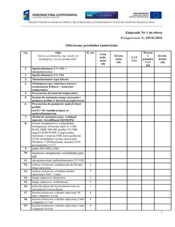 PROJEKT WSPÓŁFINANSOWANY PRZEZ UNIĘ EUROPEJSKĄ Z EUROPEJSKIEGO FUNDUSZU ROZWOJU REGIONALNEGO Załącznik Nr 1 do oferty Postępowanie Nr ZP/41/2011 Oferowany przedmiot zamówienia Lp. I. Opis Nazwa asortymentu, typ, model, nr katalogowy, nazwa producenta*) 1. Spektrofotometr UV-VIS w ukompletowaniu: *) Spektrofotometr UV-VIS 2. Monochromator typu Eberta 3. Ośmiopozycyjny zmieniacz kuwet z termostatem Peltiera + kontroler temperatury Przystawka do kontroli temperatury 4. 5. 6. 7. 8. 9 Il. szt. laserowe urządzenie wielofunkcyjne HP 11. oprogramowanie spektrofotometru UV-VIS 12. 14. uchwyt na kuwety cylindryczne do 50 mm drogi optycznej uchwyt na kuwety o krótkiej drodze optycznej ( 0,01- 1 mm) lampa zapasowa: deuterowa 1 15. lampa zapasowa: wolframowa 1 16. jeden litr płynu do mycia kuwet wraz ze specjalnymi ściereczkami, kuweta kwarcowa o drodze optycznej 10 mm i objętości 3,5 ml kuweta kwarcowa o drodze optycznej 5 mm i objętości 1,7 ml kuweta kwarcowa o drodze optycznej 1 mm i objętości 0,4 ml, 1 17. 18. 19. Kwota netto [zł] VAT [%} Wartoś ć podatku VAT [zł] Kwota brutto [zł] System do automatycznego zasysania i pomiaru próbki w kuwecie przepływowej Przystawka do pomiarów małych ilości próbki (od 0,7 µl) współpracująca ze spektrofotometrem Moduł do automatycznej walidacji aparatu - kwalifikacji IQ/OQ/PQ Zestaw komputerowy o minimalnej konfiguracji: (Procesor Intel i5, 4 GB RAM, HDD 500 GB, grafika 512 MB, napęd CD/DVD-RW z nagrywarką, minimum 4 wejścia USB, karta graficzna 32 bit, posiadający system operacyjny Windows 7 (Professional), monitor LCD przynajmniej 21,5”) pakiet MS Office EDU 10. 13. Cena jedn. netto [zł] 2 2 4 4 4 1 PROJEKT WSPÓŁFINANSOWANY PRZEZ UNIĘ EUROPEJSKĄ Z EUROPEJSKIEGO FUNDUSZU ROZWOJU REGIONALNEGO 20. 21. 22. 23. 24. 25. II. kuweta kwarcowa o drodze optycznej 10 mm i objętości 1,7 ml, kuweta kwarcowa czerniona o drodze optycznej 10 mm i objętości 0,7 ml, kuweta kwarcowa czerniona o drodze optycznej 5 mm i objętości 0,35 ml, cylindryczna kuweta kwarcowa o drodze optycznej 0,5 mm i objętości 0,278 ml, cylindryczna kuweta kwarcowa o drodze optycznej 1 mm i objętości 0,420 ml, przepływowa kuweta kwarcowa o objętości 0,450 ml. 2 2 2 2 2 2 Inne koszty**) Razem wartość oferty (wpisana do pkt 1 Formularza Ofertowego) UWAGA *) Zamawiający wymaga aby w poszczególnych wierszach tabeli wymienić elementy ukompletowania zamawianego przedmiotu zamówienia pochodzące od producenta wyrobu i jednoznacznie identyfikowalne przez nazwę, model, typ, numer katalogowy oraz elementy dodatkowe zakupione od innych producentów niezbędne do prawidłowego funkcjonowania przedmiotu zamówienia wraz z podaniem ich ilości i cen. Nie wypełnienie tabeli skutkować będzie odrzuceniem oferty. **) Wykonawca wypełnia jeżeli występują inne koszty. Przez „Inne koszty” należy rozumieć koszty: np. transportu, ubezpieczenia, tłumaczenia dokumentów, przechowania, szkolenia, udzielonych gwarancji i rękojmi jeżeli nie są uwzględnione w cenach elementów składowych zamawianego przedmiotu zamówienia. Opis oferowanego przedmiotu zamówienia Opis przedmiotu zamówienia Wymagania Zamawiającego Wypełnia Wykonawca Spektrofotometr UV-VIS będzie wykorzystywany do ilościowego i jakościowego oznaczania w roztworach substancji organicznych i nieorganicznych wykazujących absorpcję promieniowania w nadfiolecie i w zakresie widzialnym. Przystawka termostatująca Peltie będzie umożliwiała pomiar w różnych temperaturach. Opis Wykonawcy Typ: Model: Nazwa producenta: Oferowane urządzenie następujące normy: (system) spełnia (należy wymienić wszystkie wskazując źródła w ofercie) 2 PROJEKT WSPÓŁFINANSOWANY PRZEZ UNIĘ EUROPEJSKĄ Z EUROPEJSKIEGO FUNDUSZU ROZWOJU REGIONALNEGO Spektrofotometr UV-VIS z przystawką termostatującą Peltie musi być ukompletowany i spełniać następujące parametry techniczne: L.p. Treść Parametry wymagane oferowane Zamawiający wymaga aby Wykonawca w swoim opisie dotyczącym poszczególnych punktów Wymagań Zamawiającego podał rzeczywiste dane oferowanego przedmiotu zamówienia wskazując źródła w dokumentacji dołączonej do oferty bez kopiowania informacji z rubryki obok 1 Spektrofotometr UV-VIS − − − − − − − − − − − − 2 Monochromator typu Eberta układ optyczny: dwuwiązkowy z dwoma gniazdami pomiarowymi na próbkę i odnośnik, z optyką zbierającą promieniowanie na 1 detektor, typ detektora: fotopowielacz, zakres długości fali do pomiaru absorbancji: co najmniej 190-900 nm, szerokość spektralna – zmienna: zestaw dyskretnych szczelin 0,2; 0,5; 1,0; 1,5; 2,0; 4,0 nm gwarantujących w pełni odtwarzalną szerokość spektralną szczeliny pomiarowej, maksymalna rozdzielczość danych nie gorsza niż 0,05 nm, zakres fotometryczny: co najmniej do 6 Abs, dokładność fotometryczna przy 1,0 A nie gorsza niż ± 0,004 Abs, szumy<0,0001 Abs, dokładność długości fali: ± 0,15 nm (656,1 nm - linii D2 ); ± 0,3 nm w całym zakresie 190-900nm, powtarzalność długości fali: <0,1 nm, stabilność: < 0,0005 Abs/h, światło rozproszone: < 0,0035%T przy 340 nm. − monochromator musi być wyposażony w napęd z silnikiem krokowym gwarantujący, że pomiar 3 PROJEKT WSPÓŁFINANSOWANY PRZEZ UNIĘ EUROPEJSKĄ Z EUROPEJSKIEGO FUNDUSZU ROZWOJU REGIONALNEGO próby oraz próby odniesienia jest dokonywany przy idealnie tej samej długości fali nawet przy najwyższych prędkościach przemiatania długości fali, − musi być zapewniona możliwość sterowania monochromatorem z funkcją oświetlania próbki białym światłem. 3 Ośmiopozycyjny zmieniacz kuwet z termostatem Peltiera + kontroler temperatury − − − − − 4 Przystawka do kontroli temperatury − 5 System do automatycznego zasysania i pomiaru próbki w kuwecie przepływowej Przystawka do pomiarów małych ilości próbki (od 0,7 µl) współpracująca ze spektrofotometrem Moduł do automatycznej 
