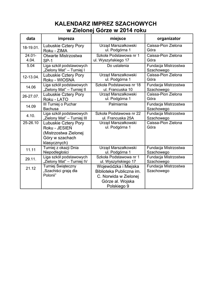 KALENDARZ IMPREZ SZACHOWYCH w Zielonej Górze w 2014 roku