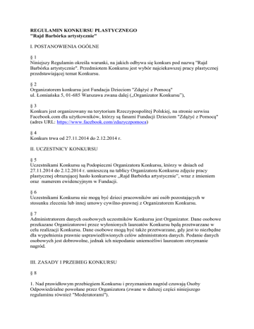 REGULAMIN KONKURSU PLASTYCZNEGO "Rajd Barbórka artystycznie" I. POSTANOWIENIA OGÓLNE §1 Niniejszy Regulamin określa warunki, na jakich odbywa się konkurs pod nazwą "Rajd Barbórka artystycznie". Przedmiotem Konkursu jest wybór najciekawszej pracy plastycznej przedstawiającej temat Konkursu. §2 Organizatorem konkursu jest Fundacja Dzieciom "Zdążyć z Pomocą" ul. Łomiańska 5, 01-685 Warszawa zwana dalej („Organizator Konkursu”), §3 Konkurs jest organizowany na terytorium Rzeczypospolitej Polskiej, na stronie serwisu Facebook.com dla użytkowników, którzy są fanami Fundacji Dzieciom "Zdążyć z Pomocą" (adres URL: https://www.facebook.com/zdazyczpomoca) §4 Konkurs trwa od 27.11.2014 do 2.12.2014 r. II. UCZESTNICY KONKURSU §5 Uczestnikami Konkursu są Podopieczni Organizatora Konkursu, którzy w dniach od 27.11.2014 do 2.12.2014 r. umieszczą na tablicy Organizatora Konkursu zdjęcie pracy plastycznej obrazującej hasło konkursowe „Rajd Barbórka artystycznie”, wraz z imieniem oraz numerem ewidencyjnym w Fundacji. §6 Uczestnikami Konkursu nie mogą być dzieci pracowników ani osób pozostających w stosunku zlecenia lub innej umowy cywilno-prawnej z Organizatorem Konkursu. §7 Administratorem danych osobowych uczestników Konkursu jest Organizator. Dane osobowe przekazane Organizatorowi przez wyłonionych laureatów Konkursu będą przetwarzane w celu realizacji Konkursu. Dane osobowe mogą być także przetwarzane, gdy jest to niezbędne dla wypełnienia prawnie usprawiedliwionych celów administratora danych. Podanie danych osobowych jest dobrowolne, jednak ich niepodanie uniemożliwi laureatom otrzymanie nagród. III. ZASADY I PRZEBIEG KONKURSU §8 1. Nad prawidłowym przebiegiem Konkursu i przyznaniem nagród czuwają Osoby Odpowiedzialne powołane przez Organizatora (zwane w dalszej części niniejszego regulaminu również "Moderatorami"). 2. Ostateczny wybór najlepszych prac zostanie dokonany przez jury składające się z 2 członków Zarządu Organizatora Konkursu. §9 1. Aby przystąpić do Konkursu należy: być Podopiecznym Organizatora Konkursu, zapoznać się z Regulaminem Konkursu, umieścić zdjęcie pracy konkursowej na tablicy Organizatora Konkursu na portalu Facebook 2. Do zgłoszonej do Konkursu pracy powinno być podane imię oraz numer ewidencyjny podopiecznego w Fundacji. 3. Celem postawionym przed uczestnikami Konkursu jest zaprezentowanie za pomocą pracy plastycznej motywu związanego z Rajdem Barbórka. Sposób ujęcia tematu i technika wykonania pracy są dowolne. 4. Każdy z uczestników Konkursu może wysłać tylko jedną pracę i jedno jej zdjęcie (wraz z opisem) w formacie JPG, w maksymalnym rozmiarze 1,5 MB. 5. Wysyłając swoje zgłoszenie, Uczestnik oświadcza i potwierdza, że zgłoszona do konkursu praca plastyczna i zdjęcie pracy plastycznej są jego własnością i zostały wykonany przez niego samego oraz, że przysługują mu autorskie prawa majątkowe i osobiste do tego zdjęcia, w tym prawo do wysyłania go na Konkurs. 6 . Rozstrzygnięcie Konkursu (opublikowanie wyników) nastąpi 03.12.2014 r. około godziny 9:00. 7. Wyniki Konkursu oraz zwycięzcy zostaną opublikowane w formie notatki na fan page https://www.facebook.com/zdazyczpomoca IV. NAGRODY § 10 1. W konkursie przewidziano: bilety wstępu na 52 Rajd Barbórka, na Odcinek Specjalny Bemowo. który odbędzie się 6.12.2014 r. w Warszawie. Bilety te przeznaczone są dla laureata oraz jego opiekuna. Dzieci do 12 r.ż. mogą uczestniczyć w Rajdzie bezpłatnie. 2. Bilety dla laureatów konkursu będą do odbioru w Ośrodku Rehabilitacji CEMICUS, przy ulicy Grzybowskiej 4 (lok. 9A) w Warszawie w godz. 8.00-16.00 w dniach 03.12.- 05.12. V. POSTANOWIENIA KOŃCOWE § 11 1. Uczestnik oświadcza, że przysługują mu autorskie prawa osobiste i majątkowe do zgłoszonego do Konkursu zdjęcia i prawa te nie są obciążone prawami osób trzecich oraz jest uprawniony do rozporządzania nimi w zakresie i celu opisanym w ust.1. 2. Organizator nie ponosi kosztów związanych z dostarczeniem prac konkursowych przez uczestników Konkursu. 3. Organizator nie ponosi odpowiedzialności za problemy techniczne powstałe w trakcie przesyłania materiałów konkursowych. 4. W przypadku naruszenia Regulaminu, osoby odpowiedzialne powołane przez Organizatora mogą wykluczyć Uczestnika na każdym etapie Konkursu. 5. W kwestiach nieuregulowanych Regulaminem stosuje się przepisy Kodeksu Cywilnego. 6. Zgłoszenie zdjęcia do Konkursu jest równoznaczne z akceptacją warunków zapisanych w niniejszym Regulaminie.