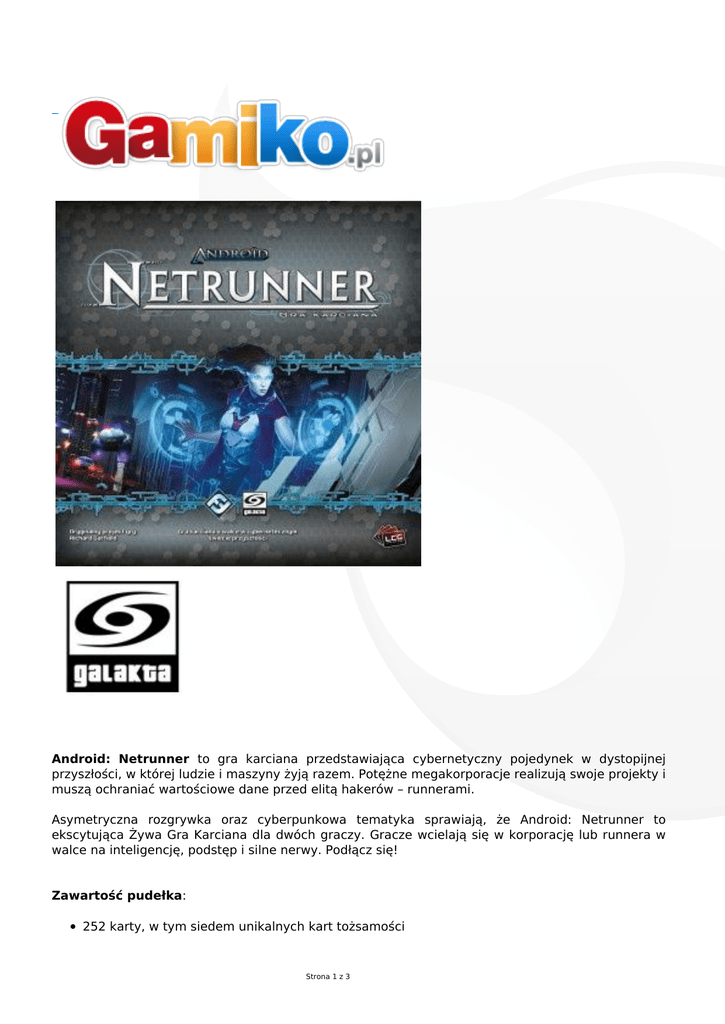 Android: Netrunner to gra karciana przedstawiająca cybernetyczny pojedynek w dystopijnej przyszłości, w której ludzie i maszyny żyją razem. Potężne megakorporacje realizują swoje projekty i muszą ochraniać wartościowe dane przed elitą hakerów – runnerami. Asymetryczna rozgrywka oraz cyberpunkowa tematyka sprawiają, że Android: Netrunner to ekscytująca Żywa Gra Karciana dla dwóch graczy. Gracze wcielają się w korporację lub runnera w walce na inteligencję, podstęp i silne nerwy. Podłącz się! Zawartość pudełka: 252 karty, w tym siedem unikalnych kart tożsamości Strona 1 z 3 instrukcja Wiek 13+ Liczba graczy 2 graczy Czas gry ok. 60 minut Instrukcja polska Wydanie polskie Producent Galakta Projektant Richard Garfield Lukas Litzsinger Strona 2 z 3 Strona 3 z 3