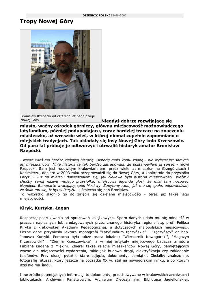 DZIENNIK POLSKI 23-06-2007 Tropy Nowej Góry Bronisław Rzepecki od czterech lat bada dzieje Nowej Góry Niegdyś dobrze rozwijające się miasto, waŜny ośrodek górniczy, główna miejscowość moŜnowładczego latyfundium, później podupadające, coraz bardziej tracące na znaczeniu miasteczko, aŜ wreszcie wieś, w której niemal zupełnie zapomniano o miejskich tradycjach. Tak układały się losy Nowej Góry koło Krzeszowic. Od paru lat próbuje je odtworzyć i utrwalić historyk amator Bronisław Rzepecki. - Nasza wieś ma bardzo ciekawą historię. Historię mało komu znaną - nie wyłączając samych jej mieszkańców. Mnie historia ta tak bardzo zafrapowała, Ŝe postanowiłem ją spisać - mówi Rzepecki. Sam jest rodowitym krakowianinem: przez wiele lat mieszkał na Grzegórzkach i Kazimierzu, dopiero w 2003 roku przeprowadził się do Nowej Góry, a konkretnie do przysiółka ParyŜ. - JuŜ na miejscu dowiedziałem się, jak ciekawa była historia miejscowości. Weźmy choćby samą nazwę mojego przysiółka: miejscowa legenda głosi, Ŝe miał tam nocować Napoleon Bonaparte wracający spod Moskwy. Zapytany rano, jak mu się spało, odpowiedział, Ŝe śniło mu się, iŜ był w ParyŜu - uśmiecha się pan Bronisław. To wszystko skłoniło go do zajęcia się dziejami miejscowości - teraz juŜ takŜe jego miejscowości. Kiryk, Kurtyka, Łagan Rozpoczął poszukiwania od opracowań ksiąŜkowych. Sporo danych udało mu się odnaleźć w pracach napisanych lub zredagowanych przez znanego historyka regionalistę, prof. Feliksa Kiryka z krakowskiej Akademii Pedagogicznej, a dotyczących małopolskich miejscowości. Liczne dane przyniosła lektura monografii "Latyfundium tęczyńskie" i "Tęczyńscy" dr hab. Janusza Kurtyki. Pomocna była takŜe prasa lokalna: "Wieczernik Nowogórski", "Magazyn Krzeszowicki" i "Ziemia Krzeszowicka", a w niej artykuły miejscowego badacza amatora Fabiana Łagana z Miękini. Zbierał takŜe relacje mieszkańców Nowej Góry, pamiętających waŜne dla miejscowości wydarzenia, takie jak budowa drogi, elektryfikacja czy zakładanie telefonów. Przy okazji pytał o stare zdjęcia, dokumenty, pamiątki. Chciałby znaleźć np. fotografię ratusza, który jeszcze na początku XX w. stał na nowogórskim rynku, a po którym dziś nie ma śladu. Inne źródło potencjalnych informacji to dokumenty, przechowywane w krakowskich archiwach i bibliotekach: Archiwum Państwowym, Archiwum Diecezjalnym, Bibliotece Jagiellońskiej, Bibliotece Czartoryskich. Wiele ciekawych dokumentów przepadło w 1975, gdy w ramach reformy administracyjnej Nowa Góra straciła status siedziby gminy. - Zniszczono między innymi mapy katastralne, zaginął gdzieś oryginał przywileju Jana Kazimierza na urządzanie jarmarków, zapodziała się bardzo cenna pieczęć miejska - ubolewa Rzepecki. Jeszcze inne miejsce, które trzeba odwiedzić, to oczywiście parafia i jej księgi oraz dokumenty. Ani śladu kopalni Najstarsza wzmianka o Nowej Górze pochodzi z 1276 r. Osada powstała w związku z wydobywaniem galmanu, z którego pozyskiwano ołów i srebro. W XV w. król Władysław Jagiełło nadał miejscowość Janowi Tęczyńskiemu. Od tego czasu aŜ do 1637 r., czyli wymarcia rodu, Nowa Góra była własnością Tęczyńskich, głównym ośrodkiem ich małopolskiego latyfundium, zwanego hrabstwem tęczyńskim. Po Tęczyńskich Nową Górę drogą koligacji objęli Opalińscy, później Sieniawscy, Czartoryscy i wreszcie Potoccy. Do detronizacji i upadku Nowej Góry przyczyniło się odkrycie źródeł zdrowotnych w Krzeszowicach, związane z tym przekształcenie ich w uzdrowisko oraz doprowadzenie tam linii kolejowej. Odtąd znaczenie Nowej Góry zaczęło systematyczne spadać. Dwa razy - w 1800 i 1875 r. - nawiedzały ją poŜary. Gwoździem do trumny było odebranie praw miejskich, dokonane w latach 30. XX w. oraz utrata statusu stolicy gminy w 1975 r. Górnictwo rozwijało się w Nowej Górze do początków XX w. JuŜ pod koniec XIX stulecia nastąpiło wyczerpanie się złóŜ, ale drobne wydobycie trwało jeszcze niemal do wybuchu I wojny światowej. Dziś po górniczej przeszłości prawie nie ma śladu. Jedyne pozostałości - to charakterystyczne zagłębienia w terenie. Pan Bronisław dotarł do starych map, na których zaznaczono obszary kopalni. Pierwszy krok na drodze Prawie czteroletnie poszukiwania Rzepeckiego przyniosły juŜ efekt: jest nim niewielka broszura "Zarys historii Nowej Góry". Pan Bronisław zebrał w niej te dane, które udało mu się wydobyć z najróŜniejszych źródeł. "Zarys" pokazuje dzieje miejscowości od jej załoŜenia (jako górniczej osady Góra), przez lokację w połowie XIV w., rozwój w latyfundium Tęczyńskich, wzniesienie kościoła, szkolnictwo, powstanie przysiółków w XVIII stuleciu, koleje losów górnictwa aŜ po wiek XX. Ten przegląd historyczny uzupełniają informacje na temat połoŜenia Nowej Góry, flory i fauny jej okolic, spis zachowanych zabytków oraz lista proboszczów, administratorów i wikariuszy parafii. W zamierzeniu autora "Zarys" jest jedynie początkiem, pierwszym krokiem, jaki trzeba wykonać na długiej drodze do stworzenia prawdziwej monografii miejscowości. - Nie zamierzam pisać jej jako pracy stricte naukowej. Ma być popularna i przeznaczona przede wszystkim dla mieszkańców Nowej Góry. Będę starał się tak ją napisać, aby bez znudzenia przeczytała ją młodzieŜ - wyjaśnia autor. Na razie "Zarys", wydany staraniem autora w 66 egzemplarzach, został rozdany bezpłatnie mieszkańcom, trafił teŜ do szkoły, kościoła i biblioteki. "Zarys" liczy około 60 stron, tymczasem planowana monografia będzie miała - według pana Bronisława - od 400 do 500 stronic. Tajemnice dat i nazw Tajemnic związanych z historią Nowej Góry jest sporo. Jedna z nich to ustalenie daty lokacji miasta. Musiało się to stać pomiędzy rokiem 1336 a 1367: w 1336 Nowa Góra była bowiem jeszcze wsią,