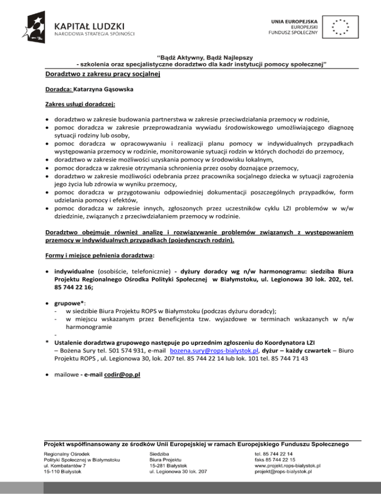 Doradztwo z zakresu pracy socjalnej Doradca: Katarzyna Gąsowska Zakres usługi doradczej: doradztwo w zakresie budowania partnerstwa w zakresie przeciwdziałania przemocy w rodzinie, pomoc doradcza w zakresie przeprowadzania wywiadu środowiskowego umożliwiającego diagnozę sytuacji rodziny lub osoby, pomoc doradcza w opracowywaniu i realizacji planu pomocy w indywidualnych przypadkach występowania przemocy w rodzinie, monitorowanie sytuacji rodzin w których dochodzi do przemocy, doradztwo w zakresie możliwości uzyskania pomocy w środowisku lokalnym, pomoc doradcza w zakresie otrzymania schronienia przez osoby doznające przemocy, doradztwo w zakresie możliwości odebrania przez pracownika socjalnego dziecka w sytuacji zagrożenia jego życia lub zdrowia w wyniku przemocy, pomoc doradcza w przygotowaniu odpowiedniej dokumentacji poszczególnych przypadków, form udzielania pomocy i efektów, pomoc doradcza w zakresie innych, zgłoszonych przez uczestników cyklu LZI problemów w w/w dziedzinie, związanych z przeciwdziałaniem przemocy w rodzinie. Doradztwo obejmuje również analizę i rozwiązywanie problemów związanych z występowaniem przemocy w indywidualnych przypadkach (pojedynczych rodzin). Formy i miejsce pełnienia doradztwa: indywidualne (osobiście, telefonicznie) - dyżury doradcy wg n/w harmonogramu: siedziba Biura Projektu Regionalnego Ośrodka Polityki Społecznej w Białymstoku, ul. Legionowa 30 lok. 202, tel. 85 744 22 16; grupowe*: - w siedzibie Biura Projektu ROPS w Białymstoku (podczas dyżuru doradcy); - w miejscu wskazanym przez Beneficjenta tzw. wyjazdowe w terminach wskazanych w n/w harmonogramie * Ustalenie doradztwa grupowego następuje po uprzednim zgłoszeniu do Koordynatora LZI – Bożena Sury tel. 501 574 931, e-mail [email protected], dyżur – każdy czwartek – Biuro Projektu ROPS , ul. Legionowa 30, lok. 207 tel. 85 744 22 14 lub lok. 101 tel. 85 744 71 43 mailowe - e-mail [email protected] Okres trwania usługi doradczej: listopad – grudzieo 2010 roku – wg harmonogramu doradztwa: Formy doradztwa Doradztwo indywidualne (osobiście, telefonicznie) Doradztwo grupowe* Dyżury w siedzibie Biura Projektu Terminy Godziny 8.11.2010 11.00 – 16.00/ 5 godz. 10.11.2010 11.00 – 16.00/ 5 godz. 29.11.2010 11.00 – 16.00/ 5 godz. 2.12.2010 11.00 -16.00/ 5 godz. 7.12.2010 9.00 – 16.00/ 7 godz. 13.12.2010 11.00 – 16.00/ 5 godz. 17.12.2010 9.00 – 16.00/ 7 godz. Łącznie 39 godzin Doradztwo grupowe* w miejscu wskazanym przez Beneficjenta 22.11.2010 8.00 – 16.00/ 8 godz. 24.11.2010 8.00 – 16.00/ 8 godz. 1.12.2010 8.00 – 16.00/ 8 godz. Łącznie 24 godziny Doradztwo mailowe e-mail [email protected] Łącznie 70 godzin doradztwa w zakresie pracy socjalnej. Łącznie 7 godzin