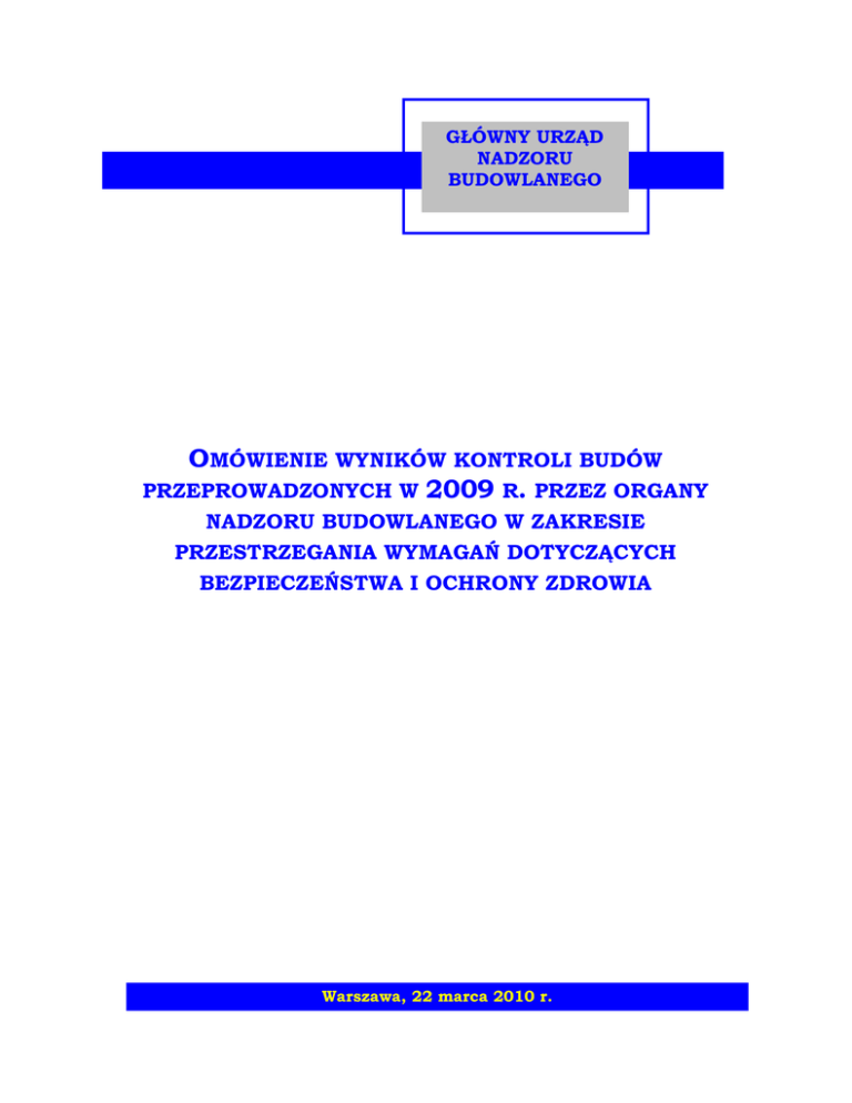GŁÓWNY URZĄD NADZORU BUDOWLANEGO OMÓWIENIE WYNIKÓW KONTROLI BUDÓW PRZEPROWADZONYCH W 2009 R. PRZEZ ORGANY NADZORU BUDOWLANEGO W ZAKRESIE PRZESTRZEGANIA WYMAGAŃ DOTYCZĄCYCH BEZPIECZEŃSTWA I OCHRONY ZDROWIA Warszawa, 22 marca 2010 r. I. Wymagania prawne w zakresie bezpieczeństwa i ochrony zdrowia w procesie budowlanym Zgodnie z przepisami ustawy z dnia 7 lipca 1994 r. - Prawo budowlane (Dz. U. z 2006 r. Nr 156 poz. 1118 z późn. zm.), uczestnicy procesu budowlanego są zobowiązani do zapewnienia bezpieczeństwa i ochrony zdrowia na budowie, a w szczególności, w przypadkach określonych w ustawie, do opracowania, wdroŜenia i przestrzegania planu bezpieczeństwa i ochrony zdrowia (BIOZ). Inwestor jest obowiązany zorganizować proces budowy z uwzględnieniem zasad bezpieczeństwa i ochrony zdrowia, w tym zapewnić opracowanie planu BIOZ (art. 18 ust. 1 ustawy - Prawo budowlane). Bezpośrednio odpowiedzialnymi za opracowanie, wdroŜenie i przestrzeganie planu BIOZ są: projektant, który sporządza informację dotyczącą bezpieczeństwa i ochrony zdrowia ze względu na specyfikę projektowanego obiektu budowlanego, uwzględnianą w planie BIOZ (art. 20 ust. 1 pkt 1b ustawy- Prawo budowlane), kierownik budowy, który: - sporządza (lub zapewnia sporządzenie) planu BIOZ przed rozpoczęciem budowy, uwzględniając specyfikę obiektu i warunki prowadzenia robót budowlanych, w tym jednoczesne prowadzenie robót budowlanych i produkcji przemysłowej (art. 21a ust. 1 ustawy- Prawo budowlane), - składa pisemne oświadczenie o sporządzeniu planu BIOZ, które inwestor jest obowiązany przedstawić, wraz z innymi dokumentami, właściwemu organowi nadzoru budowlanego co najmniej na 7 dni przed rozpoczęciem robót budowlanych (art. 41 ust.4 pkt 1 ustawy- Prawo budowlane), - umieszcza na terenie budowy, w przypadkach określonych w przepisach, ogłoszenie zawierające dane dotyczące bezpieczeństwa pracy i ochrony zdrowia (art. 42 ust. 2 pkt 2 i ust. 3a ustawy- Prawo budowlane) - w miarę potrzeby wprowadza niezbędne zmiany w informacji sporządzonej przez projektanta oraz w samym planie BIOZ, wynikające z postępu robót (art. 22 pkt 3c ustawy- Prawo budowlane). Przepisy ustawy określają przypadki, dla których obowiązkowe jest sporządzenie planu bezpieczeństwa i ochrony zdrowia. Dotyczy to sytuacji, gdy w trakcie budowy wykonywany będzie przynajmniej jeden z rodzajów robót budowlanych uznanych za niebezpieczne, lub gdy roboty budowlane będą trwały dłuŜej niŜ 30 dni roboczych i jednocześnie będzie przy nich zatrudnionych co najmniej 20 pracowników, albo pracochłonność robót będzie przekraczać 500 osobodni (art. 21a ust. 1a ustawy - Prawo budowlane). 1 Za niebezpieczne uznane zostały następujące rodzaje robót budowlanych (art. 21a ust. 2 ustawy - Prawo budowlane): 1) których charakter, organizacja lub miejsce prowadzenia stwarza szczególnie wysokie ryzyko powstania zagroŜenia bezpieczeństwa i zdrowia ludzi, a w szczególności przysypania ziemią lub upadku z wysokości; 2) przy prowadzeniu których występują działania substancji chemicznych lub czynników biologicznych zagraŜających bezpieczeństwu i zdrowiu ludzi; 3) stwarzających zagroŜenie promieniowaniem jonizującym; 4) prowadzonych w pobliŜu linii wysokiego napięcia lub czynnych linii komunikacyjnych; 5) stwarzających ryzyko utonięcia pracowników; 6) prowadzonych w studniach, pod ziemią i w tunelach; 7) wykonywanych przez kierujących pojazdami zasilanymi z linii napowietrznych; 8) wykonywanych w kesonach, z atmosferą wytwarzaną ze spręŜonego powietrza; 9) wymagających uŜycia materiałów wybuchowych; 10) prowadzonych przy montaŜu i demontaŜu cięŜkich elementów prefabrykowanych. Mając na uwadze stopień zagroŜeń, jaki stwarzają poszczególne rodzaje robót, szczegółowy zakres robót budowlanych, które wymagają opracowania planu BIOZ, został określony w rozporządzeniu Ministra Infrastruktury z dnia 23 czerwca 2003 r. w sprawie informacji dotyczącej bezpieczeństwa i ochrony zdrowia oraz planu bezpieczeństwa i ochrony zdrowia. Odpowiedzialność karna i zawodowa za nieprzestrzeganie przepisów w zakresie zapewnienia bezpieczeństwa na budowie obejmuje uchybienia i wykroczenia opisane w rozdziałach 9 i 10 Prawa budowlanego. W szczególności karą grzywny zagroŜeni są uczestnicy procesu budowlanego, którzy przystępują do budowy lub prowadzą roboty budowlane bez dopełnienia wymagań wynikających z przepisów, a dotyczących zapewnienia bezpieczeństwa pracy i ochrony zdrowia, opisanych w art. 41 ust. 4 pkt 1 i 3 i w art. 42 ust. 2 pkt 2 ustawy - Prawo budowlane. 2 II. Kontrole budów przeprowadzone w 2009 r. przez organy nadzoru budowlanego pod kątem zapewnienia na budowie bezpieczeństwa i ochrony zdrowia Kontrole wykonywania obowiązków w zakresie zapewnienia bezpieczeństwa i ochrony zdrowia na budowie, a w szczególności zapewnienia opracowania, wdroŜenia i przestrzegania planu bezpieczeństwa i ochrony zdrowia wykonywane są stale przez organy nadzoru budowlanego w ramach rutynowych kontroli budów, w szczególności prowadzonych na podstawie pozwolenia na budowę. Wyniki tych kontroli, w układzie wojewódzkim, obrazuje załączona tabela pn. „Informacje dotyczące przestrzegania przepisów prawa budowlanego w zakresie bezpieczeństwa i ochrony zdrowia w 2009 roku”. W roku 2009 dokonano na terenie kraju 13 455 kontroli budów, uwzględniających kwestie związane z funkcjonowaniem planu bezpieczeństwa i ochrony zdrowia (BIOZ). Ogółem w skali kraju nie stwierdzono nieprawidłowości w zakresie bezpieczeństwa i ochrony zdrowia podczas 11558 kontroli, co stanowi 86% skontrolowanych budów. Kontrole budów z uwzględnieniem BIOZ wykonane w 2009 r. przez organy nadzoru budowlanego (relacje liczby kontroli bez uwag do liczby kontroli z uwagami ) 1897 14% 11558 86% Podczas pozostałych 1897 kontroli (14% skontrolowanych budów) stwierdzono na