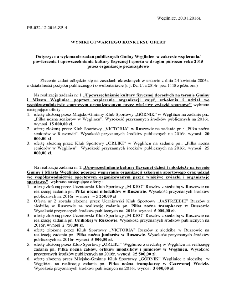 Węgliniec, 20.01.2016r. PR.032.12.2016.ZP-4 WYNIKI OTWARTEGO KONKURSU OFERT Dotyczy: na wykonanie zadań publicznych Gminy Węgliniec w zakresie wspierania/ powierzenia i upowszechniania kultury fizycznej i sportu w drugim półroczu roku 2015 przez organizacje pozarządowe Zlecenie zadań odbędzie się na zasadach określonych w ustawie z dnia 24 kwietnia 2003r. o działalności pożytku publicznego i o wolontariacie (t. j. Dz. U. z 2014r. poz. 1118 z późn. zm.) Na realizację zadania nr 1 „Upowszechnianie kultury fizycznej dorosłych na terenie Gminy i Miasta Węgliniec poprzez wspieranie organizacji zajęć, szkolenia i udział we współzawodnictwie sportowym organizowanym przez właściwe związki sportowe” wybrano następujące oferty : 1. ofertę złożoną przez Miejsko-Gminny Klub Sportowy „GÓRNIK” w Węglińcu na zadanie pn.: „Piłka nożna seniorów w Węglińcu”. Wysokość przyznanych środków publicznych na 2016r. wynosi 15 000,00 zł. 2. ofertę złożoną przez Klub Sportowy „VICTORIA” w Ruszowie na zadanie pn.: „Piłka nożna seniorów w Ruszowie”. Wysokość przyznanych środków publicznych na 2016r. wynosi 20 000,00 zł 3. ofertę złożoną przez Klub Sportowy „ORLIKI” w Węglińcu na zadanie pn.: „Piłka nożna seniorów w Węglińcu” Wysokość przyznanych środków publicznych na 2016r. wynosi 25 000,00 zł. Na realizację zadania nr 2 „Upowszechnianie kultury fizycznej dzieci i młodzieży na terenie Gminy i Miasta Węgliniec poprzez wspieranie organizacji szkolenia sportowego oraz udział we współzawodnictwie sportowym organizowanym przez właściwe związki i organizacje sportowe.” wybrano następujące oferty : 1. ofertę złożoną przez Uczniowski Klub Sportowy „MIKRO” Ruszów z siedzibą w Ruszowie na realizację zadania pn. Piłka nożna młodzików w Ruszowie. Wysokość przyznanych środków publicznych na 2016r. wynosi – 5 250,00 zł 2. Oferta nr 2 została złożona przez Uczniowski Klub Sportowy „JASTRZĘBIE” Ruszów z siedzibą w Ruszowie na realizację zadania pn. Piłka nożna trampkarzy w Ruszowie Wysokość przyznanych środków publicznych na 2016r. wynosi 5 000,00 zł. 3. ofertę złożoną przez Uczniowski Klub Sportowy „MIKRO” Ruszów z siedzibą w Ruszowie na realizację zadania pn. Unihokej w Ruszowie. Wysokość przyznanych środków publicznych na 2016r. wynosi 2 750,00 zł. 4. ofertę złożoną przez Klub Sportowy „VICTORIA” Ruszów z siedzibą w Ruszowie na realizację zadania pn. Piłka nożna juniorów w Ruszowie. Wysokość przyznanych środków publicznych na 2016r. wynosi 5 500,00 zł. 5. ofertę złożoną przez Klub Sportowy „ORLIKI” Węgliniec z siedzibą w Węglińcu na realizację zadania pn. Piłka nożna żaków, orlików młodzików i juniorów w Węglińcu. Wysokość przyznanych środków publicznych na 2016r. wynosi 25 500,00 zł. 6. ofertę złożoną przez Miejsko-Gminny Klub Sportowy „GÓRNIK” Węgliniec z siedzibą w Węglińcu na realizację zadania pn. Piłka nożna trampkarzy w Czerwonej Wodzie. Wysokość przyznanych środków publicznych na 2016r. wynosi 3 000,00 zł Na realizację zadania nr 3 „Upowszechnianie kultury fizycznej na terenie Gminy i Miasta Węgliniec poprzez wspieranie organizacji szkolenia, udziału we współzawodnictwie sportowym, organizacji zawodów, imprez i zajęć popularyzujących lekkoatletykę, turystykę i pozostałe formy upowszechniania kultury fizycznej” wybrano następujące oferty : 1. ofertę złożoną przez Klub Sportowy „ORLIKI” Węgliniec z siedzibą w Węglińcu na realizację zadania pn. Zajęcia z kulturystyki i fitness w Węglińcu”. Wysokość przyznanych środków publicznych na 2016r. wynosi 4 000,00 zł. 2. ofertę złożoną przez Uczniowski Klub Sportowy „OLIMPIA” przy Gimnazjum w Węglińcu z siedzibą w Węglińcu na realizację zadania pn. „Lekkoatletyka bez ograniczeń wiekowych oraz gry zespołowe dla uczniów (młodzików i juniorów) w Węglińcu”. Wysokość przyznanych środków publicznych na 2016r. wynosi 4 000,00 zł. 3. ofertę złożoną przez Uczniowski Klub Sportowy „START” z siedzibą w Ruszowie na realizację zadania pn. „Lekkoatletyka bez ograniczeń wiekowych oraz gry zespołowe dla uczniów w Ruszowie”. Wysokość przyznanych środków publicznych na 2016r. wynosi 6 000,00 zł. Na realizację zadania nr 4 „Upowszechnianie kultury fizycznej poprzez powierzenie organizacji zajęć rekreacyjno – sportowych dla dzieci i młodzieży w czasie wakacji 2016 roku” wybrano następujące oferty : 1. ofertę złożoną przez Uczniowski Klub Sportowy „MIKRO” Ruszów z siedzibą w Ruszowie na realizację zadania pn. Zajęcia sportowe na boiskach wielofunkcyjnych”. Wysokość przyznanych środków publicznych na 2016r. wynosi 300,00 zł. 2. ofertę złożoną przez Klub Sportowy „ORLIKI” Węgliniec z siedzibą w Węglińcu na realizację zadania pn. „IX wakacje z piłką nożną”. Wysokość przyznanych środków publicznych na 2016r. wynosi 600,00 zł. 3. ofertę złożoną przez Uczniowski Klub Sportowy „START” z siedzibą w Ruszowie na realizację zadania pn. „Puchar ORLIKA w siatkówce plażowej w Ruszowie”. Wysokość przyznanych środków publicznych na 2016r. wynosi 600,00 zł. Na realizację zadania nr 5 „Upowszechnianie kultury fizycznej poprzez powierzenie organizacji imprez sportowo – rekreacyjnych, zawodów i konkurencji sportowych podczas imprezy plenerowej „Święto Grzybów” w 2016 roku” wybrano następującą ofertę : 1. ofertę złożoną przez Klub Sportowy „ORLIKI” Węgliniec z siedzibą w Węglińcu na realizację zadania pn. „Turniej piłkarski dzieci do lat 10 o Puchar Święta Grzybów”. Wysokość przyznanych środków publicznych na 2016r. wynosi 1 500,00 zł. Burmistrz Gminy i Miasta Węgliniec (-) Stanisław Mikołajczyk