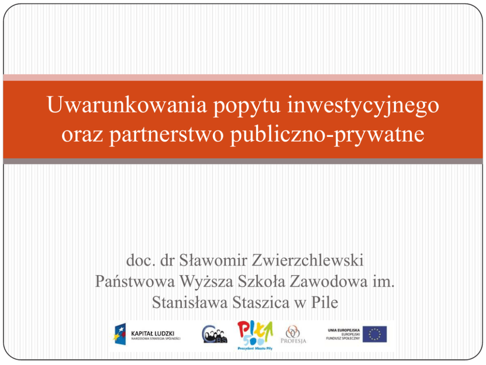 Uwarunkowania popytu inwestycyjnego oraz partnerstwo publiczno-prywatne doc. dr Sławomir Zwierzchlewski Państwowa Wyższa Szkoła Zawodowa im. Stanisława Staszica w Pile Uwarunkowania popytu inwestycyjnego Piła, 27.09.2012, „Skutki oddziaływania na lokalną społeczność w perspektywie realizowanych inwestycji w podregionie pilskim” Przewiduj i reaguj - zarządzanie zmianą w subregionie pilskim - projekt jest współfinansowany ze środków Unii Europejskiej w ramach Europejskiego Funduszu Społecznego Typ polityki fiskalnej a sektor prywatny - Efekt dostępności: Ekspansja fiskalna zwiększa popyt państwa na pieniądz, co odcina sferę inwestycji od środków finansowych - Efekt cenowy: Ekspansja fiskalna kanalizuje kredyt bankowy w stronę sektora państwowego, tworząc nacisk na wyższą stopę procentową Piła, 27.09.2012, „Skutki oddziaływania na lokalną społeczność w perspektywie realizowanych inwestycji w podregionie pilskim” Przewiduj i reaguj - zarządzanie zmianą w subregionie pilskim - projekt jest współfinansowany ze środków Unii Europejskiej w ramach Europejskiego Funduszu Społecznego - Efekt substytucji: Atrakcyjność obligacji publicznych skłania część prywatnych inwestorów do realizacji inwestycji portfelowych kosztem inwestycji produkcyjnych - Efekt „ambitnego inwestora”: Przeszkodą do inwestowania jest wysoka stopa dyskontowa Piła, 27.09.2012, „Skutki oddziaływania na lokalną społeczność w perspektywie realizowanych inwestycji w podregionie pilskim” Przewiduj i reaguj - zarządzanie zmianą w subregionie pilskim - projekt jest współfinansowany ze środków Unii Europejskiej w ramach Europejskiego Funduszu Społecznego Czynniki wpływające na skalę efektu wypierania - Wrażliwość sektora prywatnego na efekt dostępności i efekt - cenowy Dostępność przedsiębiorstw do zewnętrznych źródeł finansowania Dostęp kapitału zagranicznego do finansowania krajowego deficytu budżetowego Piła, 27.09.2012, „Skutki oddziaływania na lokalną społeczność w perspektywie realizowanych inwestycji w podregionie pilskim” Przewiduj i reaguj - zarządzanie zmianą w subregionie pilskim - projekt jest współfinansowany ze środków Unii Europejskiej w ramach Europejskiego Funduszu Społecznego Partnerstwo publiczno-prywatne Piła, 27.09.2012, „Skutki oddziaływania na lokalną społeczność w perspektywie realizowanych inwestycji w podregionie pilskim” Przewiduj i reaguj - zarządzanie zmianą w subregionie pilskim - projekt jest współfinansowany ze środków Unii Europejskiej w ramach Europejskiego Funduszu Społecznego Racjonalność finansów publicznych a potrzeby społeczne Instytucja współpracy podmiotu publicznego z partnerem prywatnym Piła, 27.09.2012, „Skutki oddziaływania na lokalną społeczność w perspektywie realizowanych inwestycji w podregionie pilskim” Przewiduj i reaguj - zarządzanie zmianą w subregionie pilskim - projekt jest współfinansowany ze środków Unii Europejskiej w ramach Europejskiego Funduszu Społecznego Podstawy prawne PPP Rygoryzm ustawy - obowiązek formułowania analiz ekonomicznych, które miały potwierdzać przewagę PPP nad tradycyjnymi metodami realizacji zadań publicznych - wyszczególnienie rodzajów przedsięwzięć mogących być przedmiotem PPP Piła, 27.09.2012, „Skutki oddziaływania na lokalną społeczność w perspektywie realizowanych inwestycji w podregionie pilskim” Przewiduj i reaguj - zarządzanie zmianą w subregionie pilskim - projekt jest współfinansowany ze środków Unii Europejskiej w ramach Europejskiego Funduszu Społecznego Etapy PPP - identyfikacja projektu - konsultacje z inwestorami prywatnymi (możliwości finansowe) - analiza ekonomiczna (biznesplan) - wybór partnera prywatnego (możliwości finansowe i merytoryczne przygotowanie) Piła, 27.09.2012, „Skutki oddziaływania na lokalną społeczność w perspektywie realizowanych inwestycji w podregionie pilskim” Przewiduj i reaguj - zarządzanie zmianą w subregionie pilskim - projekt jest współfinansowany ze środków Unii Europejskiej w ramach Europejskiego Funduszu Społecznego Czynniki określające merytoryczne przygotowanie - Wykonanie określonej inwestycji w ciągu ostatnich pięciu lat - Dysponowanie odpowiednim zasobem ludzkim - Posiadanie potencjału technicznego Piła, 27.09.2012, „Skutki oddziaływania na lokalną społeczność w perspektywie realizowanych inwestycji w podregionie pilskim” Przewiduj i reaguj - zarządzanie zmianą w subregionie pilskim - projekt jest współfinansowany ze środków Unii Europejskiej w ramach Europejskiego Funduszu Społecznego Główne kategorie przedsięwzięć w ramach PPP - Infrastruktura sportowo-rekreacyjna - Infrastruktura komunalno-transportowa - Infrastruktura sieciowa - Małe PPP Główne podmioty publiczne uczestniczące w PPP - Miasta i gminy - Powiaty - Urzędy marszałkowskie Piła, 27.09.2012, „Skutki oddziaływania na lokalną społeczność w perspektywie realizowanych inwestycji w podregionie pilskim” Przewiduj i reaguj - zarządzanie zmianą w subregionie pilskim - projekt jest współfinansowany ze środków Unii Europejskiej w ramach Europejskiego Funduszu Społecznego Przykład przedsięwzięcia realizowanego w ramach PPP - Podmiot publiczny: Miasto Sopot - Podmiot prywatny: Bałtycka Grupa Inwestycyjna S.A. z - Gdańska PKP S.A. Kategoria: infrastruktura komunalno-transportowa Szacunkowa wartość przedsięwzięcia: ok. 100 mln zł Piła, 27.09.2012, „Skutki oddziaływania na lokalną społeczność w perspektywie realizowanych inwestycji w podregionie pilskim” Przewiduj i reaguj - zarządzanie zmianą w subregionie pilskim - projekt jest współfinansowany ze środków Unii Europejskiej w ramach Europejskiego Funduszu Społecznego - Podmiot publiczny: Gmina Piła - Rodzaj inwestycji: Zaprojektowanie, wybudowanie i utrzymanie urządzeń oświetlenia ulicznego oraz dostawa energii elektrycz