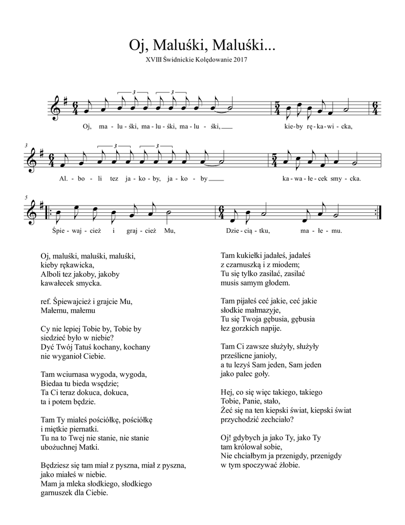 Oj, Maluśki, Maluśki... XVIII Świdnickie Kolędowanie 2017 3 3 # 6 j j Ïj Ïj Ïj Ïj Ïj Ïj Ïj Ïj ú & 4 Ï Ï Oj, ma - lu - śki, ma - lu - śki, ma - lu - śki, # 6 j j j 3j j j 3j j j j & 4 Ï Ï Ï Ï Ï Ï Ï Ï Ï Ï ú # . & . ÏJ 5 Ï J Ï J Śpie - waj - cież tez Ï J i ja - ko - by, ja - ko - by j Ïj ú Ï graj - cież Mu, kie - by rę - ka - wi - cka, 54 Ïj Ï Ïj j Ï J Ï 3 Al. - bo - li 5 Ï Ï Ï j ú 4 J J J Ï Ï 6 4 Ïj ÏJ ú Dzie - cią - tku, j j Ï ú Ï ma - łe - mu. Tam kukiełki jadałeś, jadałeś z czarnuszką i z miodem; Tu się tylko zasilać, zasilać musis samym głodem. ref. Śpiewajcież i grajcie Mu, Małemu, małemu Tam pijałeś ceć jakie, ceć jakie słodkie małmazyje, Tu się Twoja gębusia, gębusia łez gorzkich napije. Tam wciurnasa wygoda, wygoda, Biedaa tu bieda wsędzie; Ta Ci teraz dokuca, dokuca, ta i potem będzie. Tam Ty miałeś pościółkę, pościółkę i miętkie piernatki. Tu na to Twej nie stanie, nie stanie ubożuchnej Matki. Będziesz się tam miał z pyszna, miał z pyszna, jako miałeś w niebie. Mam ja mleka słodkiego, słodkiego garnuszek dla Ciebie. ú ka - wa - łe - cek smy - cka. Oj, maluśki, maluśki, maluśki, kieby rękawicka, Alboli tez jakoby, jakoby kawałecek smycka. Cy nie lepiej Tobie by, Tobie by siedzieć było w niebie? Dyć Twój Tatuś kochany, kochany nie wyganioł Ciebie. 6 4 Tam Ci zawsze służyły, służyły prześlicne janioły, a tu lezyś Sam jeden, Sam jeden jako palec goły. Hej, co się więc takiego, takiego Tobie, Panie, stało, Żeć się na ten kiepski świat, kiepski świat przychodzić zechciało? Oj! gdybych ja jako Ty, jako Ty tam królował sobie, Nie chciałbym ja przenigdy, przenigdy w tym spoczywać żłobie. ..