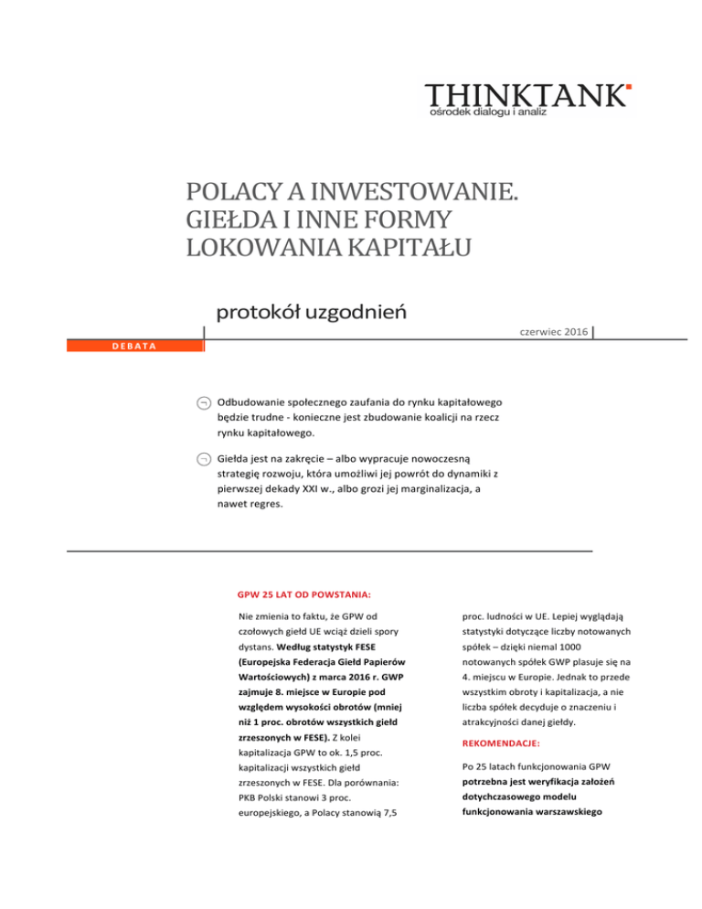 POLACYAINWESTOWANIE. GIEŁDAIINNEFORMY LOKOWANIAKAPITAŁU protokółuzgodnień DEBATA czerwiec2016 Odbudowaniespołecznegozaufaniadorynkukapitałowego będzietrudne-koniecznejestzbudowaniekoalicjinarzecz rynkukapitałowego. Giełdajestnazakręcie–albowypracujenowoczesną strategięrozwoju,któraumożliwijejpowrótdodynamikiz pierwszejdekadyXXIw.,albogrozijejmarginalizacja,a nawetregres. GPW25LATODPOWSTANIA: Niezmieniatofaktu,żeGPWod proc.ludnościwUE.Lepiejwyglądają czołowychgiełdUEwciążdzielispory statystykidotycząceliczbynotowanych dystans.WedługstatystykFESE spółek–dziękiniemal1000 (EuropejskaFederacjaGiełdPapierów notowanychspółekGWPplasujesięna Wartościowych)zmarca2016r.GWP 4.miejscuwEuropie.Jednaktoprzede zajmuje8.miejscewEuropiepod wszystkimobrotyikapitalizacja,anie względemwysokościobrotów(mniej liczbaspółekdecydujeoznaczeniui niż1proc.obrotówwszystkichgiełd atrakcyjnościdanejgiełdy. zrzeszonychwFESE).Zkolei kapitalizacjaGPWtook.1,5proc. REKOMENDACJE: kapitalizacjiwszystkichgiełd Po25latachfunkcjonowaniaGPW zrzeszonychwFESE.Dlaporównania: potrzebnajestweryfikacjazałożeń PKBPolskistanowi3proc. dotychczasowegomodelu europejskiego,aPolacystanowią7,5 funkcjonowaniawarszawskiego protokółuzgodnień parkietu.Pierwszeznichdotyczyroli standardomwiedzaosóbzwiązanychz spółekSkarbuPaństwa.Ich rynkiemgiełdowym,atakże prywatyzacjapoprzezgiełdębyła świadomośćprywatnychpodmiotów jednymzmotorówfunkcjonowania gospodarczych,żedlawieluznich GPW.Obecnielistaspółek,które giełdamożestanowićalternatywną mogłybyzostaćsprywatyzowane drogępozyskiwaniakapitału. poprzezgiełdę,jestbardzokrótka. Kolejnymparadygmatemwymagającym weryfikacjisąplanykonsolidacjigiełd 2 DIAGNOZA: wregionieEuropyŚrodkowo- Od2011r.naGPWmamydoczynienia Wschodniej.Fiasko„konsolidacyjnej” zestagnacjąwarunkowanąprzezwiele inicjatywygiełdywiedeńskiejpokazuje czynnikówzarównowewnętrznych, skalęwyzwańzwiązanychztąideą. jakimakroekonomicznych(przede Dodatkowowydajesię,żezdolność wszystkimglobalnykryzysfinansowyi koalicyjnapolskiejgiełdy– jegoskutki,kryzysstrefyeuro,a kontrolowanejprzezpaństwo– ostatniokryzysemergingmarkets dodatkowozmniejszaszansęnasukces. spowodowanym.in.spadkamicen GPW,zewzględunarozmiarpolskiej gospodarki,maszansęodegraćrolę ponadnarodową,alebędzietozależało przedewszystkimodjejatrakcyjności dlazagranicznychklientów,anieod ewentualnychmiędzynarodowych aliansów. NOWYMODELFUNKCJONOWANIA GPW: surowców).Wśródczynników wewnętrznychbezwątpieniakluczową rolęodegrałoczęściowecofnięcie reformyemerytalnejizmianywOFE. Zdaniemczęściuczestnikówdebatyw efekciegwałtownejzmianywarunków funkcjonowaniaGPWzdezaktualizował siędotychczasowyparadygmat dotyczącyopłacalności długoterminowychinwestycjiwakcje. Obecniegiełdajestnazakręcie–albo wypracujenowoczesnąstrategię Zperspektywy25latfunkcjonowania rozwoju,któraumożliwijejpowrótdo GiełdyPapierówWartościowychw dynamikizpierwszejdekadyXXIw., Warszawiejejnajwiększymi albo–zewzględunaglobalną niepodważalnymsukcesemjest konkurencjęikończeniesię zbudowanienowoczesnejiprzejrzystej dotychczasowegopaliwawpostaci infrastrukturygiełdowej„zniczego”.W prywatyzacji–grozijejmarginalizacja, ciągućwierćwieczanadWisłąudałosię anawetregres. stworzyćotoczenieregulacyjne, instytucjerynkukapitałowego,system rozliczeń(najnowocześniejszyw regionie).Ogromnąwartośćma odpowiadającaeuropejskim Negatywnymtrendemjest zmniejszaniesięliczby krótkoterminowychinwestorów indywidualnych.Wpływanatowiele protokółuzgodnień czynników,wtymniesprzyjające Jednocześniewdyskusjioprzyczynach regulacje–nietylkopodatekodzysków kryzysuzaufaniapodnoszonesą kapitałowych,lecztakżeregulacje argumentyobciążającewinązaobecne dotyczącesposobówwykonywania statusquozarównoinstytucje transakcjilubteżustalaniacen. państwoweipolityków,jakipodmioty Jednocześniebrakujezgody,czyrozwój giełdyograniczająprzedewszystkim kwestieinstytucjonalne(związanez funkcjonowaniemGPW),czyteż 3 rynkowe. REKOMENDACJE: ograniczonazdolnośćpolskiej WyprowadzenieGWPzzakrętu,na gospodarkidogenerowania którymsięznalazła,wymaga atrakcyjnychokazjidoinwestowania. zbudowaniastrategiioddającejnowy Zwolennicypierwszejtezyprzekonują, pomysłnagiełdę.Musibyćonaczęścią żeproblememjestniedostatecznailość kompleksowejstrategiirozwojurynku ijakośćinformacjiociekawych kapitałowego,jaknp.wTurcjiczyw spółkachspozaWIG20.Doniedawna Malezji.Planyrozwojurynkupowstały problemembyłteżbrakprzejrzystości takżewNiemczechczywSzwajcarii. ofertmałychspółektechnologicznych Dobrąokazjądojejzbudowaniasą (np.brakhistoriiczyteżaudytu).W pracenaduszczegółowieniem„Planu celuzmianytejsytuacjiGPWorganizuje narzeczZrównoważonegoRozwoju” m.in.konferencjedlainwestorów (tzw.PlanuMorawieckiego). zagranicznych(roadshow)zudziałem zarównowiększychspółek,jakiMŚP. Zgodnieznowąstrategiągiełda powinnabyćplatformąwspółpracy, Napoparciedrugiejtezypodnoszony którastymulujewzrostinwestycji jestargumentopułapceśredniego przedewszystkimwmałeiśrednie dochodu,wktórejznajdujesiępolska innowacyjnespółki.Wtymcelunależy gospodarka.Wkonsekwencji uprościćprocedurywchodzeniana zdecydowanawiększośćpolskichfirm giełdę,dokonaćsegmentacjirynkuna budujeswojąpozycjękonkurencyjnąw spółkibardziejryzykowne(pigmarket) oparciuoniskiekoszty.Zpowodu orazteposiadającebardziejstabilne rosnącychkosztówpracyzaśich fundamentyrozwoju,atakże dochodowośćspada–cozkoleiobniża wprowadzićregulacjestymulujące ichatrakcyjnośćdlainwestorów. inwestowaniewtespółki. Mniejkontrowersjibudziumieszczenie Pozytywnywpływnafunkcjonowanie naliściepriorytetówdlaGPWpoprawy giełdy,wtymzwiększenieroli wizerunkurynkukapitałowego inwestorówinstytucjonalnych,miałoby (niezbędnedoprzyciągnięcia odbudowanieprywatnego,lecz inwestorówindywidualnych)oraz obowiązkowegosystemu zwi