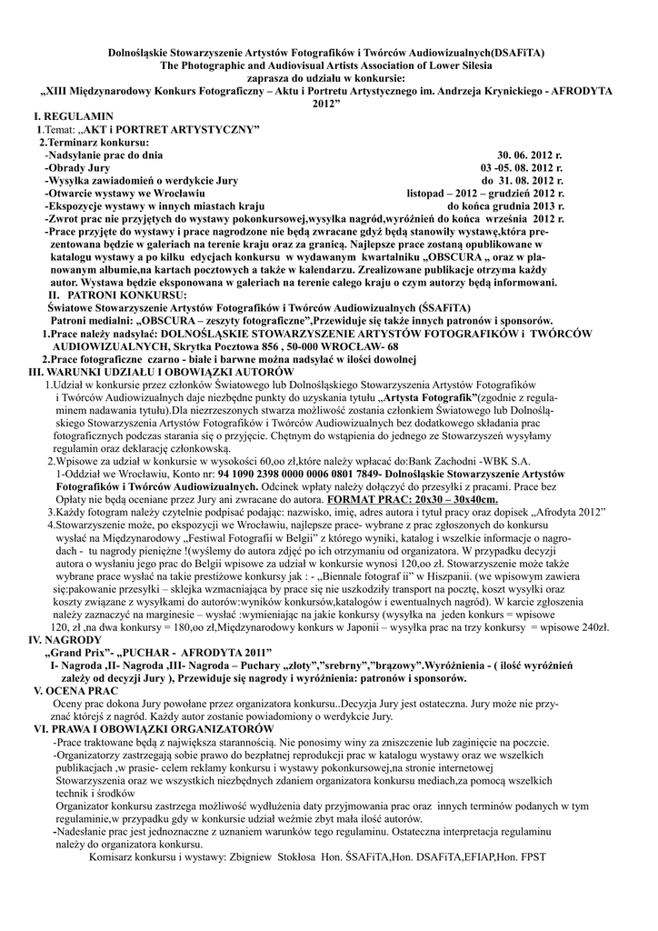 Dolnośląskie Stowarzyszenie Artystów Fotografików i Twórców Audiowizualnych(DSAFiTA) The Photographic and Audiovisual Artists Association of Lower Silesia zaprasza do udziału w konkursie: „XIII Międzynarodowy Konkurs Fotograficzny – Aktu i Portretu Artystycznego im. Andrzeja Krynickiego - AFRODYTA 2012” I. REGULAMIN 1.Temat: „AKT i PORTRET ARTYSTYCZNY” 2.Terminarz konkursu: -Nadsyłanie prac do dnia 30. 06. 2012 r. -Obrady Jury 03 -05. 08. 2012 r. -Wysyłka zawiadomień o werdykcie Jury do 31. 08. 2012 r. -Otwarcie wystawy we Wrocławiu listopad – 2012 – grudzień 2012 r. -Ekspozycje wystawy w innych miastach kraju do końca grudnia 2013 r. -Zwrot prac nie przyjętych do wystawy pokonkursowej,wysyłka nagród,wyróżnień do końca września 2012 r. -Prace przyjęte do wystawy i prace nagrodzone nie będą zwracane gdyż będą stanowiły wystawę,która prezentowana będzie w galeriach na terenie kraju oraz za granicą. Najlepsze prace zostaną opublikowane w katalogu wystawy a po kilku edycjach konkursu w wydawanym kwartalniku „OBSCURA „ oraz w planowanym albumie,na kartach pocztowych a także w kalendarzu. Zrealizowane publikacje otrzyma każdy autor. Wystawa będzie eksponowana w galeriach na terenie całego kraju o czym autorzy będą informowani. II. PATRONI KONKURSU: Światowe Stowarzyszenie Artystów Fotografików i Twórców Audiowizualnych (ŚSAFiTA) Patroni medialni: „OBSCURA – zeszyty fotograficzne”,Przewiduje się także innych patronów i sponsorów. 1.Prace należy nadsyłać: DOLNOŚLĄSKIE STOWARZYSZENIE ARTYSTÓW FOTOGRAFIKÓW i TWÓRCÓW AUDIOWIZUALNYCH, Skrytka Pocztowa 856 , 50-000 WROCŁAW- 68 2.Prace fotograficzne czarno - białe i barwne można nadsyłać w ilości dowolnej III. WARUNKI UDZIAŁU I OBOWIĄZKI AUTORÓW 1.Udział w konkursie przez członków Światowego lub Dolnośląskiego Stowarzyszenia Artystów Fotografików i Twórców Audiowizualnych daje niezbędne punkty do uzyskania tytułu „Artysta Fotografik”(zgodnie z regulaminem nadawania tytułu).Dla niezrzeszonych stwarza możliwość zostania członkiem Światowego lub Dolnośląskiego Stowarzyszenia Artystów Fotografików i Twórców Audiowizualnych bez dodatkowego składania prac fotograficznych podczas starania się o przyjęcie. Chętnym do wstąpienia do jednego ze Stowarzyszeń wysyłamy regulamin oraz deklarację członkowską. 2.Wpisowe za udział w konkursie w wysokości 60,oo zł,które należy wpłacać do:Bank Zachodni -WBK S.A. 1-Oddział we Wrocławiu, Konto nr: 94 1090 2398 0000 0006 0801 7849- Dolnośląskie Stowarzyszenie Artystów Fotografików i Twórców Audiowizualnych. Odcinek wpłaty należy dołączyć do przesyłki z pracami. Prace bez Opłaty nie będą oceniane przez Jury ani zwracane do autora. FORMAT PRAC: 20x30 – 30x40cm. 3.Każdy fotogram należy czytelnie podpisać podając: nazwisko, imię, adres autora i tytuł pracy oraz dopisek „Afrodyta 2012” 4.Stowarzyszenie może, po ekspozycji we Wrocławiu, najlepsze prace- wybrane z prac zgłoszonych do konkursu wysłać na Międzynarodowy „Festiwal Fotografii w Belgii” z którego wyniki, katalog i wszelkie informacje o nagrodach - tu nagrody pieniężne !(wyślemy do autora zdjęć po ich otrzymaniu od organizatora. W przypadku decyzji autora o wysłaniu jego prac do Belgii wpisowe za udział w konkursie wynosi 120,oo zł. Stowarzyszenie może także wybrane prace wysłać na takie prestiżowe konkursy jak : - „Biennale fotograf ii” w Hiszpanii. (we wpisowym zawiera się:pakowanie przesyłki – sklejka wzmacniająca by prace się nie uszkodziły transport na pocztę, koszt wysyłki oraz koszty związane z wysyłkami do autorów:wyników konkursów,katalogów i ewentualnych nagród). W karcie zgłoszenia należy zaznaczyć na marginesie – wysłać :wymieniając na jakie konkursy (wysyłka na jeden konkurs = wpisowe 120, zł ,na dwa konkursy = 180,oo zł,Międzynarodowy konkurs w Japonii – wysyłka prac na trzy konkursy = wpisowe 240zł. IV. NAGRODY „Grand Prix”- „PUCHAR - AFRODYTA 2011” I- Nagroda ,II- Nagroda ,III- Nagroda – Puchary „złoty”,”srebrny”,”brązowy”.Wyróżnienia - ( ilość wyróżnień zależy od decyzji Jury ), Przewiduje się nagrody i wyróżnienia: patronów i sponsorów. V. OCENA PRAC Oceny prac dokona Jury powołane przez organizatora konkursu..Decyzja Jury jest ostateczna. Jury może nie przyznać którejś z nagród. Każdy autor zostanie powiadomiony o werdykcie Jury. VI. PRAWA I OBOWIĄZKI ORGANIZATORÓW -Prace traktowane będą z największa starannością. Nie ponosimy winy za zniszczenie lub zaginięcie na poczcie. -Organizatorzy zastrzegają sobie prawo do bezpłatnej reprodukcji prac w katalogu wystawy oraz we wszelkich publikacjach ,w prasie- celem reklamy konkursu i wystawy pokonkursowej,na stronie internetowej Stowarzyszenia oraz we wszystkich niezbędnych zdaniem organizatora konkursu mediach,za pomocą wszelkich technik i środków Organizator konkursu zastrzega możliwość wydłużenia daty przyjmowania prac oraz innych terminów podanych w tym regulaminie,w przypadku gdy w konkursie udział weźmie zbyt mała ilość autorów. -Nadesłanie prac jest jednoznaczne z uznaniem warunków tego regulaminu. Ostateczna interpretacja regulaminu należy do organizatora konkursu. Komisarz konkursu i wystawy: Zbigniew Stokłosa Hon. ŚSAFiTA,Hon. DSAFiTA,EFIAP,Hon. FPST