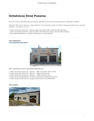 Urząd Gminy w Zabrodziu Ochotnicza Straż Pożarna Na terenie Gminy Zabrodzie funkcjonują dwie jednostki Ochotniczych Straży Pożarnych w Zabrodziu i Słopsku. Jednostki OSP z ternu gminy w ciągu ostatnich 5 lat pozyskały sprzęt do działań ratowniczo-gaśniczych o łącznej wartości 1 mln 500 tys. zł, m.in.: ● ● ● średni samochód ratowniczo - gaśniczy GBA 2,5/24 MAN TGM 13,280 dla OSP Zabrodzie średni samochód ratowniczo - gaśniczy GBA 2,5/24 Mercedes Atego 1329 dla OSP w Słopsku dwie łodzie płaskodenne z silnikami zaburtowymi na przyczepkach OSP ZABRODZIE www.zabrodzie.osp.org.pl OSP w Zabrodziu na swoim wyposażeniu posiada min.: ● ● ● ● ● średni samochód ratowniczo - gaśniczy - (GBA 2,5/24 Man TGM 13.280) średni samochód ratowniczo - gaśniczy – (GBA 2/16 Starman) średni samochód ratowniczo - gaśniczy – (GBM 2,5/8 Star 244) łódź aluminiowa płaskodenna z silnikiem zaburtowym HONDA BF 50 LRTU średni zestaw hydraulicznych narzędzi ratowniczych firmy HOLMATRO OSP SŁOPSK 1 Urząd Gminy w Zabrodziu OSP w Słopsku na swoim wyposażeniu posiada min.: ● ● samochód ratowniczo - gaśniczy średni - Mercedes łódź płaskodenną (4 osobową) 2