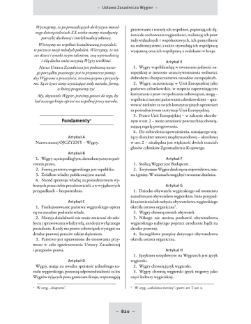 – Ustawa Zasadnicza Węgier – Wyznajemy, że po prowadzących do kryzysu moralnego dziesięcioleciach XX wieku mamy nieodpartą potrzebę duchowej i intelektualnej odnowy. Wierzymy we wspólnie kształtowaną przyszłość, w poczucie misji młodych pokoleń. Wierzymy, że nasze dzieci i wnuki swym talentem, swą wytrwałością i siłą ducha znów uczynią Węgry wielkimi. Nasza Ustawa Zasadnicza jest podstawą naszego porządku prawnego: jest to przymierze pomiędzy Węgrami z przeszłości, teraźniejszymi i przyszłymi. Są to żywe ramy wyrażające wolę narodu, formę, w której pragniemy żyć. My, obywatele Węgier, jesteśmy gotowi do tego, by ład naszego kraju oprzeć na wspólnej pracy narodu. Fundamenty1 Artykuł A Nazwa naszej OJCZYZNY – Węgry. przetrwanie i rozwój ich wspólnot, popierają ich dążenia do zachowania węgierskości, realizację ich praw indywidualnych i wspólnotowych, ich pomyślność na rodzimej ziemi, a także stymulują ich współpracę wzajemną oraz ich współpracę z rodakami w kraju. Artykuł E 1. Węgry współdziałają w tworzeniu jedności eu- ropejskiej w interesie urzeczywistnienia wolności, dobrobytu i bezpieczeństwa narodów europejskich. 2. Węgry, uczestnicząc w Unii Europejskiej jako państwo członkowskie, w stopniu zapewniającym korzystanie z praw i wypełnianie zobowiązań, mogą – wspólnie z innymi państwami członkowskimi – sprawować niektóre ze swych konstytucyjnych uprawnień za pośrednictwem instytucji Unii Europejskiej. 3. Prawo Unii Europejskiej – w zakresie określonym w ust. 2 – może ustanowić powszechnie obowiązującą regułę postępowania. 4. Do uchwalenia upoważnienia, uznającego wiążący charakter umowy międzynarodowej – określonej w ust. 2 – niezbędna jest większość dwóch trzecich głosów członków Zgromadzenia Krajowego. Artykuł B 1. Węgry są niepodległym, demokratycznym pań- stwem prawa. 2. Formą państwa węgierskiego jest republika. 3. Źródłem władzy publicznej jest naród. 4. Naród sprawuje władzę za pośrednictwem wybranych przez siebie przedstawicieli, a w wyjątkowych przypadkach – bezpośrednio. Artykuł C 1. Funkcjonowanie państwa węgierskiego opiera się na zasadzie podziału władz. 2. Niczyja działalność nie może zmierzać do zdobycia i sprawowania władzy siłą, ani do jej wyłącznego posiadania. Każdy ma prawo i obowiązek wystąpić na drodze prawnej przeciw takim dążeniom. 3. Państwo jest uprawnione do stosowania przymusu w celu egzekwowania Ustawy Zasadniczej i przepisów prawa. Artykuł D Węgry, mając na uwadze spoistość jednolitego narodu węgierskiego, ponoszą odpowiedzialność za los Węgrów żyjących poza granicami kraju, wspomagają 1 W oryg. „Alapvetés”. Artykuł F 1. Stolicą Węgier jest Budapeszt. 2. Terytorium Węgier dzieli się na województwa, mia- sta i gminy. W miastach mogą być tworzone dzielnice. Artykuł G 1. Dziecko obywatela węgierskiego od momentu narodzin jest obywatelem węgierskim. Inne przypadki zaistnienia lub nabycia obywatelstwa węgierskiego określa ustawa organiczna 2 . 2. Węgry chronią swoich obywateli. 3. Nikogo nie można pozbawić obywatelstwa węgierskiego nabytego poprzez urodzenie bądź na drodze prawnej. 4. Szczegółowe przepisy dotyczące obywatelstwa określa ustawa organiczna. Artykuł H 1. Językiem urzędowym na Węgrzech jest język węgierski. 2. Węgry chronią język węgierski. 3. Węgry chronią węgierski język migowy jako część kultury węgierskiej. 2 W oryg. „sarkalatos törvény”; patrz: art. T ust. 4. – 820 – – Magyarország Alaptörvénye – Artykuł I Artykuł N 1. Godłem Węgier jest wizerunek podzielonej pio- 1. Węgry realizują zasadę zrównoważonej, przejrzy- nowo na dwie połowy tarczy o zaostrzonej podstawie. Lewe jej pole jest podzielone siedmioma cięciami tworzącymi osiem poziomych czerwonych i srebrnych pasów. W prawym, czerwonym polu, na środkowej, wystającej części potrójnego pagórka znajduje się złota korona, na której widnieje podwójny srebrny krzyż. Na wierzchołku tarczy spoczywa węgierska Święta Korona. 2. Flaga Węgier składa się z trzech poziomych pasów, równej szerokości o następujących – patrząc od góry – barwach: czerwonej, białej i zielonej; czerwień symbolizuje siłę, biel – wierność, zieleń – nadzieję. 3. Hymnem Węgier jest wiersz Ferenca Kölcseya Hymn, z muzyką Ferenca Erkela. 4. Godło i flaga mogą również występować w innych, historycznie ukształtowanych formach. Szczegółowe zasady posługiwania się godłem i flagą, a także odznaczenia państwowe określa ustawa organiczna. stej i stabilnej gospodarki oraz polityki budżetowej. 2. Odpowiedzialność za realizację zasady określonej w ust. 1 spoczywa przede wszystkim na Zgromadzeniu Krajowym i Rządzie. 3. Trybunał Konstytucyjny, sądy, samorządy terytorialne oraz inne organy państwowe w trakcie wypełniania swych zadań zobowiązane są do przestrzegania zasady zawartej w ust. 1. Artykuł J 1. Węgierskie święta narodowe: a) 15 marca – upamiętniające rewolucję i walkę o wolność w latach 1848/1849; Artykuł O Każdy jest odpowiedzialny za siebie i jest zobowiązany do współuczestnictwa – w miarę swych zdolności i możliwości – w realizacji zadań państwowych oraz wspólnotowych. Artykuł P Zasoby naturalne, w szczególności ziemia uprawna, lasy i zasoby wodne, różnorodne bogactwa biologiczne, w szczególności rodzime gatunki flory i fauny, a także wartości kulturalne tworzą wspólne, narodowe dziedzictwo, którego ochrona, utrzymywanie i zachowanie dla przyszłych pokoleń jest obowiązkiem państwa i każdego obywatela. b) 20 sierpnia – upamiętniające utworzenie pań- stwa węgierskiego oraz jego założyciela, króla Świętego Stefana; c) 23 października – upamiętniające rewolucję i walkę o wolność w 1956 roku. 2. Oficjalnym świętem narodowym jest dzie
