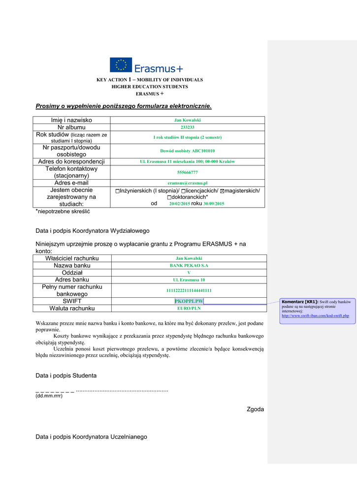 KEY ACTION 1 – MOBILITY OF INDIVIDUALS HIGHER EDUCATION STUDENTS ERASMUS + Prosimy o wypełnienie poniższego formularza elektronicznie. Imię i nazwisko Nr albumu Rok studiów (licząc razem ze Jan Kowalski 233233 I rok studiów II stopnia (2 semestr) studiami I stopnia) Nr paszportu/dowodu osobistego Adres do korespondencji Telefon kontaktowy (stacjonarny) Adres e-mail Jestem obecnie zarejestrowany na studiach: Dowód osobisty ABC101010 Ul. Erasmusa 11 mieszkania 100; 00-000 Kraków 555666777 [email protected] Inżynierskich (I stopnia)/ licencjackich/ magisterskich/ doktoranckich* od 20/02/2015 roku 30/09/2015 *niepotrzebne skreślić Data i podpis Koordynatora Wydziałowego Niniejszym uprzejmie proszę o wypłacanie grantu z Programu ERASMUS + na konto: Jan Kowalski Właściciel rachunku BANK PEKAO S.A Nazwa banku V Oddział Ul. Erasmusa 10 Adres banku Pełny numer rachunku 11112222111144441111 bankowego PKOPPLPW SWIFT EURO/PLN Waluta rachunku Komentarz [KR1]: Swift cody banków podane są na następującej stronie internetowej: http://www.swift-iban.com/kod-swift.php Wskazane przeze mnie nazwa banku i konto bankowe, na które ma być dokonany przelew, jest podane poprawnie. Koszty bankowe wynikające z przekazania przez stypendystę błędnego rachunku bankowego obciążają stypendystę. Uczelnia ponosi koszt pierwotnego przelewu, a powtórne zlecenie/a będące konsekwencją błędu niezawinionego przez uczelnię, obciążają stypendystę. Data i podpis Studenta _ _ _ _ _ _ _ _ ....................................................... (dd.mm.rrrr) Zgoda Data i podpis Koordynatora Uczelnianego