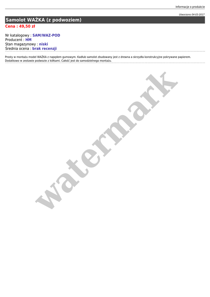 Informacje o produkcie Utworzono 04-03-2017 Samolot WAŻKA (z podwoziem) Cena : 49,50 zł Nr katalogowy : SAM/WAZ-POD Producent : HM Stan magazynowy : niski Średnia ocena : brak recenzji w at er m ar k Prosty w montażu model WAŻKA z napędem gumowym. Kadłub samolot zbudowany jest z drewna a skrzydła konstrukcyjne pokrywane papierem. Dodatkowo w zestawie podwozie z kółkami. Całość jest do samodzielnego montażu.