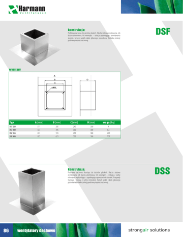 konstrukcja: Podstawa dachowa do dachów p³askich. Blacha stalowa ocynkowana, lub blacha aluminiowa. Od wewn¹trz – izolacja zapobiegaj¹ca powstawaniu skroplin. Fartuch wokó³ coko³u g³ównego pozwala na dok³adn¹ izolacjê podstawy na po³aci dachowej. DSF wymiary Typ DSF 220 DSF 280 DSF 355 DSF 450 A [mm] B [mm] C [mm] D [mm] waga [kg] 571 657 817 877 295 395 555 625 245 330 450 535 300 300 300 300 4 6,5 6,75 7,57 konstrukcja: Podstawa dachowa t³umi¹ca do dachów p³askich. Blacha stalowa ocynkowana, lub blacha aluminiowa. Od wewn¹trz – izolacja z we³ny mineralnej wyt³umiaj¹ca i zapobiegaj¹ca powstawaniu skroplin. Przegrody t³umi¹ce z izolacj¹ z we³ny mineralnej. Fartuch wokó³ coko³u g³ównego pozwala na dok³adn¹ izolacjê podstawy na po³aci dachowej. 86 wentylatory dachowe DSS strongair solutions wentylatory dachowe akcesoria wymiary Typ DSS 220 DSS 280 DSS 355 DSS 455 A [mm] B [mm] C [mm] D [mm] E [mm] waga [kg] 571 657 817 877 294 395 555 625 245 333 493 563 600 600 600 600 410 380 310 310 5,5 5,5 6,7 6,7 Konstrukcja: Przeciwko³nierz (króciec) do wentylatorów dachowych wykonany ze stali ocynkowanej. Umo¿liwia pod³¹czenie odcinka kana³u prostego o przekroju okr¹g³ym. DAF wymiary Typ DAF 180 DAF 250 DAF 400 ÆA [mm] 213 286 438 www.harmann.pl ÆB [mm] C [mm] D [mm] E [mm] waga [kg] 183 252 402 8 10 10 12 10 15 25 25 30 0,33 0,56 0,95 87
