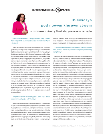 W ZAKŁADACH IP-Kwidzyn pod now ym kierownictwem – r oz m ow a z A net ą Mus k a ł ą , p rezes em z a rz ądu Które cele i działania – z pozycji Prezesa firmy – uważa naszego zakładu. Mam nadzieję, że w następnych latach Pani w tej chwili za priorytetowe dla International Paper- będę mogła się z Państwem podzielić informacjami o ko- -Kwidzyn? lejnych inwestycjach strategicznych w zakład w Kwidzynie. Jako IP-Kwidzyn jesteśmy zobowiązani do realizacji Czy obok sztandarowego asortymentu, jakim są papiery globalnej strategii firmy. Do podstawowych zadań należeć białe, tektura stanie się równie ważną i rozpoznawalną będzie utrzymanie operacyjności zakładu na najwyższym marką firmy? światowym poziomie, dzięki czemu będziemy mogli realizować plany produkcyjne przy zachowaniu kontroli kosztów. Uważam, że obecnie IP-Kwidzyn zaczyna coraz silniej koja- Z pewnością dużą uwagę będziemy, jak co roku, przykładać rzyć się z produkcją tektury. Jak bardzo nasza tektura będzie do rozwoju kompetencji naszych pracowników, gdyż od lat w świadomości konsumentów kojarzyć się z IP jest trudne w IP wierzymy, że naszą siłą są pracownicy, a inwestycje w lu- do oszacowania, gdyż nie trafia ona w ręce użytkowników dzi przynoszą najlepszy zwrot. Nasze usytuowanie w Unii końcowych pod swoją nazwą. Odbiorcami naszej tektury są Europejskiej, wraz z oczekiwaniami właściciela, mobilizują najczęściej drukarnie, które wykorzystują ją do produkcji nas do poszukiwania nowych inicjatyw pozwalających na opakowań dla różnych segmentów i branż, w tym kosme- redukcję kosztów w celu umacniania przewagi konkuren- tyków, farmaceutyków, słodyczy i produktów żywnościo- cyjnej naszych produktów na docelowych rynkach. Sukces wych. W zasadzie każdy z nas posiada w domu przynajmniej w tym zakresie zwiększa szanse na pozyskanie środków kilka produktów zapakowanych w tekturę wyprodukowaną wewnątrz organizacji na kolejne inwestycje, a co za tym w Kwidzynie, nie mając takiej świadomości. Inaczej wygląda idzie, na ciągłe doskonalenie naszych procesów i produktów, sytuacja z papierami białymi. Nasze marki z rodziny Pol, a także utrzymanie pozycji dobrego pracodawcy i sąsiada czyli Pol Speed, Pol Lux, a także najwyższej jakości papier w oczach społeczności lokalnej. W szczególności jednak Pol Jet zapakowane są w obwoluty opatrzone logo firmy będziemy skupiać się na tym, aby powyższe zostało osią- i w takiej formie trafiają do konsumentów. Klienci, pracow- gnięte przy najwyższej dbałości o bezpieczeństwo naszych nicy biurowi i inni użytkownicy naszych papierów białych pracowników. przyzwyczajeni są do komfortu pracy z papierem naszej marki i chętnie po niego sięgają. Ze świadomością konsu- Wspomniała Pani o inwestycjach. Jakie będą dalsze działania inwestycyjne w IP-Kwidzyn? mentów opakowań jest inaczej, ale nie ulega wątpliwości, że marki Alaska Plus i Arktika reprezentują najwyższą jakość i są cenione przez klientów. Należy zaznaczyć, że w wyniku W ostatnich trzech latach wydaliśmy ponad 130 mln USD, modernizacji MP4 udało nam się obniżyć podstawową gra- w tym na modernizację maszyn papierniczych: MP4 produ- maturę przy zachowaniu stabilnego poziomu pozostałych kującej tektury powlekane, której modernizacja pozwoliła parametrów technicznych tektury Alaska Plus. Dla produ- nam zastąpić produkowaną wcześniej tekturę Alaska, centów wyrobów FMCG istotne jest, że proces produkcji wprowadzając na rynek nową niskogramaturową tekturę Alaski Plus pochłania mniejsze ilości włókien, ilość odpadów powlekaną Alaska Plus. W minionym roku wymieniliśmy na- jest ograniczona, a tektura do przetransportowania lżejsza, pędy MP1 produkującej papiery białe, a obecnie realizujemy zatem wpływ na środowisko na wszystkich etapach cyklu duże projekty środowiskowe na wydziale energetycznym życia produktu jest zredukowany. 28 PRZEGLĄD PAPIERNICZY · 72 · STYCZEŃ 2016
