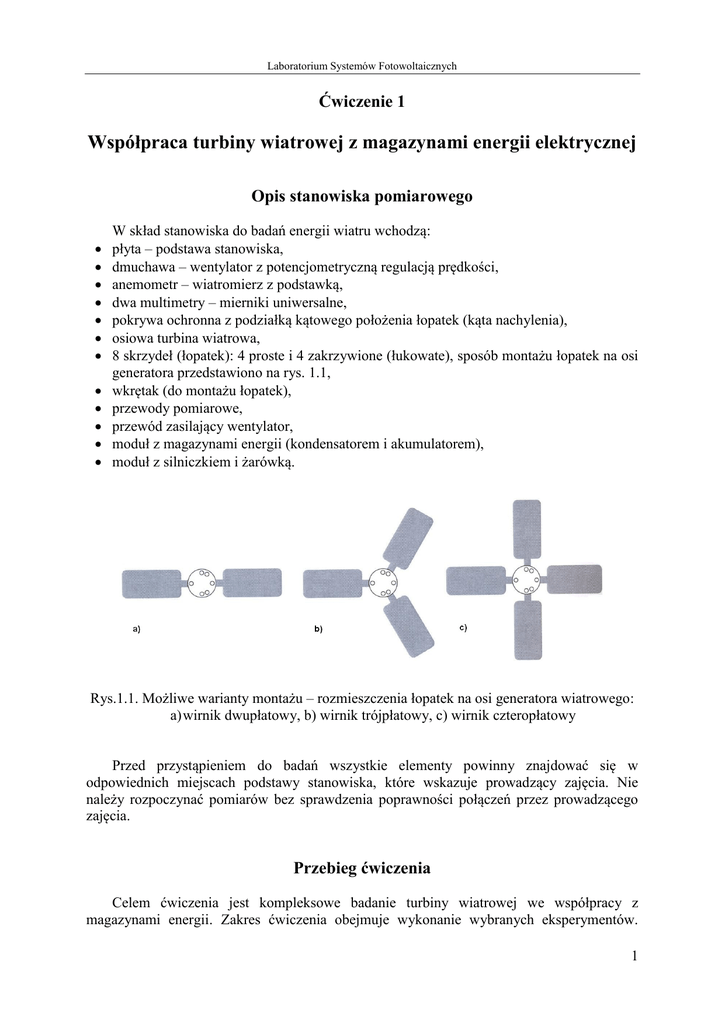Laboratorium Systemów Fotowoltaicznych Ćwiczenie 1 Współpraca turbiny wiatrowej z magazynami energii elektrycznej Opis stanowiska pomiarowego W skład stanowiska do badań energii wiatru wchodzą: płyta – podstawa stanowiska, dmuchawa – wentylator z potencjometryczną regulacją prędkości, anemometr – wiatromierz z podstawką, dwa multimetry – mierniki uniwersalne, pokrywa ochronna z podziałką kątowego położenia łopatek (kąta nachylenia), osiowa turbina wiatrowa, 8 skrzydeł (łopatek): 4 proste i 4 zakrzywione (łukowate), sposób montażu łopatek na osi generatora przedstawiono na rys. 1.1, wkrętak (do montażu łopatek), przewody pomiarowe, przewód zasilający wentylator, moduł z magazynami energii (kondensatorem i akumulatorem), moduł z silniczkiem i żarówką. Rys.1.1. Możliwe warianty montażu – rozmieszczenia łopatek na osi generatora wiatrowego: a) wirnik dwupłatowy, b) wirnik trójpłatowy, c) wirnik czteropłatowy Przed przystąpieniem do badań wszystkie elementy powinny znajdować się w odpowiednich miejscach podstawy stanowiska, które wskazuje prowadzący zajęcia. Nie należy rozpoczynać pomiarów bez sprawdzenia poprawności połączeń przez prowadzącego zajęcia. Przebieg ćwiczenia Celem ćwiczenia jest kompleksowe badanie turbiny wiatrowej we współpracy z magazynami energii. Zakres ćwiczenia obejmuje wykonanie wybranych eksperymentów. 1 Laboratorium Systemów Fotowoltaicznych Pomiary oraz sprawozdanie końcowe należy wykonywać według zamieszczonych poniżej wskazówek. Eksperyment nr 1 Proces ładowania kondensatora za pomocą turbiny wiatrowej Elementy stanowiska pomiarowego (rys.1.2-1.3): - podstawa, - wentylator, - wiatromierz, - turbina wiatrowa z łopatkami, - mierniki uniwersalne (woltomierz i amperomierz), - moduł z magazynami energii, - moduł z silniczkiem i żarówką. Do badań należy przyjąć następujące ustawienia: - 4 łopatki, - kształt łopatek: zakrzywione, - kąt nachylenia łopatek: 60°, - prędkość wiatru: 8-9 m/s. Rys.1.2. Schemat ideowy oraz elektryczny połączeń do badania ładowania kondensatora z wykorzystaniem turbiny wiatrowej (bez podłączenia diody prostowniczej) 2 Laboratorium Systemów Fotowoltaicznych Rys.1.3. Schemat ideowy oraz elektryczny połączeń do badania ładowania kondensatora z wykorzystaniem turbiny wiatrowej (przy podłączonej diodzie prostowniczej) Przebieg eksperymentu: a) sprawdzić za pomocą wiatromierza, przy jakiej nastawie potencjometru wentylatora uzyskuje się wymaganą prędkość wiatru, b) połączyć elementy stanowiska zgodnie z rys.1.2, c) ustawić mierniki na zakresy: DCA 200 mA oraz DCV 20 V, d) sprawdzić czy kondensator jest rozładowany (0 V) – w razie potrzeby rozładować poprzez dołączenie żarówki do górnych zacisków kondensatora, w momencie, gdy wartość napięcia U = 0 V żarówkę odłączyć, e) załączyć wentylator na wcześniej wyznaczoną nastawę (w pkt. a), f) ładować kondensator tak długo, dopóki amperomierz wskazuje prąd ładowania, wyniki notować w tabeli 1.1: Tabela 1.1 Obserwacja procesu ładowania kondensatora t [min] U [V] I [mA] 0 1 2 3 4 5 6 7 8 9 10 11 3 Laboratorium Systemów Fotowoltaicznych 12 13 14 15 … g) wyłączyć wentylator i obserwować amperomierz, zanotować spostrzeżenia: ......................................................................... h) po chwili obserwacji tor prądowy z generatora turbiny przełączyć do dolnych zacisków kondensatora (zgodnie z rys.1.3), i) obserwować amperomierz, notując poniżej dane: - obserwacja wskazań amperomierza – wnioski: . . . . . . . . . . . . . . . . . . . . . . . . . . . . . . . . . . . . , - jaka jest rola diody w układzie? . . . . . . . . . . . . . . . . . . . . . . . . . . . . . . . . . . . . . . . . . . . . . . . . , j) rozładować kondensator do U = 0 V (korzystając z żarówki - jak w pkt. d). Eksperyment nr 2 Proces ładowania akumulatora z wykorzystaniem turbiny wiatrowej Elementy stanowiska pomiarowego i ustawienia analogiczne jak w eksperymencie nr 1. Schematy połączeń przedstawiono na rysunkach 1.4 i 1.5. Rys.1.4. Schemat ideowy oraz elektryczny połączeń do badania ładowania akumulatora z wykorzystaniem turbiny wiatrowej (bez podłączenia diody prostowniczej) 4 Laboratorium Systemów Fotowoltaicznych Rys.1.5. Schemat ideowy oraz elektryczny połączeń do badania ładowania akumulatora z wykorzystaniem turbiny wiatrowej (przy podłączonej diodzie prostowniczej) Przebieg eksperymentu (analogiczny do eksperymentu nr 1): a) sprawdzić poprawność ustawień łopatek (kąt: 60°), b) połączyć elementy stanowiska zgodnie z rys.1.4, c) ustawić mierniki na zakresy: DCA 200 mA oraz DCV 20 V, d) sprawdzić czy kondensator jest rozładowany (0 V) – w razie potrzeby rozładować poprzez dołączenie żarówki do górnych zacisków kondensatora, w momencie, gdy wartość napięcia U = 0 V żarówkę odłączyć, e) załączyć wentylator na wcześniej wyznaczoną nastawę, f) ładować akumulator tak długo, dopóki amperomierz wskazuje prąd ładowania, wyniki notować w tabeli 1.2: Tabela 1.2 Obserwacja procesu ładowania akumulatora t [min] U [V] I [mA] 0 1 2 3 4 5 6 7 8 9 10 11 12 5 Laboratorium Systemów Fotowoltaicznych 13 14 15 … g) wyłączyć wentylator i obserwować amperomierz, zanotować spostrzeżenia: ......................................................................... h) po chwili obserwacji tor prądowy z generatora turbiny przełączyć do dolnych zacisków akumulatora (zgodnie z rys.1.5), i) obserwować amperomierz, notując poniżej dane: - obserwacja wskazań amperomierza – wnioski: . . . . . . . . . . . . . . . . . . . . . . . . . . . . . . . . . . . . , - jaka jest rola diody w układzie? . . . . . . . . . . . . . . . . . . . . . . . . . . . . . . . . . . . . . . . . . . . . . . . . , j) rozładować akumulator do U = 0 V (korzystając z żarówki - jak w pkt. d). Sprawozdanie z przebiegu ćwiczen