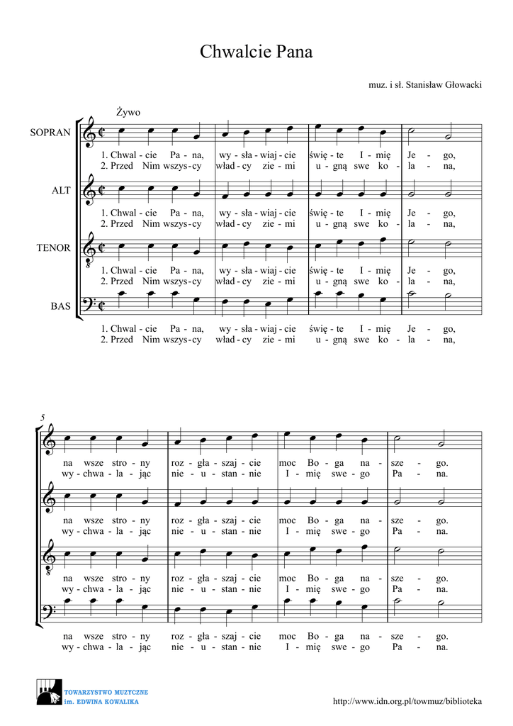 Chwalcie Pana muz. i sł. Stanisław Głowacki ° œ SOPRAN & C œ œ œ &C œ œ œ œ Żywo 1. Chwal - cie Pa - na, 2. Przed Nim wszys - cy ALT 1. Chwal - cie Pa - na, 2. Przed Nim wszys - cy &C œ œ œ œ ‹ 1. Chwal - cie Pa - na, 2. Przed Nim wszys - cy œ œ œ œ ? C BAS ¢ TENOR 1. Chwal - cie Pa - na, 2. Przed Nim wszys - cy ° œ & œ & œ œ 5 œ œ na wsze stro - ny wy - chwa - la - jąc œ œ na wsze stro - ny wy - chwa - la - jąc ¢ & œ œ œ œ ‹ na wsze stro - ny wy - chwa - la - jąc œ œ œ œ ? na wsze stro - ny wy - chwa - la - jąc œ œ œ œ œ œ wy - sła - wiaj - cie wład - cy zie - mi œ œ œ œ œ œ œ œ ˙ świę - te I - mię Je u - gną swe ko - la œ œ œ œ ˙ œ œ œ œ ˙ - ˙ go, na, ˙ wy - sła - wiaj - cie wład - cy zie - mi świę - te I - mię Je u - gną swe ko - la - go, na, wy - sła - wiaj - cie wład - cy zie - mi świę - te I - mię Je u - gną swe ko - la - go, na, wy - sła - wiaj - cie wład - cy zie - mi świę - te I - mię Je u - gną swe ko - la - go, na, œ œ œ œ œ œ œ œ œ œ roz - gła - szaj - cie nie - u - stan - nie œ œ œ œ œ œ œ œ œ œ œ œ œ œ œ œ ˙ ˙ moc Bo - ga na - sze I - mię swe - go Pa œ œ œ œ ˙ œ œ œ œ ˙ - ˙ ˙ ˙ go. na. ˙ roz - gła - szaj - cie nie - u - stan - nie moc Bo - ga na - sze I - mię swe - go Pa - go. na. roz - gła - szaj - cie nie - u - stan - nie moc Bo - ga na - sze I - mię swe - go Pa - go. na. roz - gła - szaj - cie nie - u - stan - nie moc Bo - ga na - sze I - mię swe - go Pa - go. na. œ œ œ œ œ œ œ œ ˙ ˙ ˙ http://www.idn.org.pl/towmuz/biblioteka ° ™ & ™ ∑ & ™™ ∑ & ™™ ‹ ∑ 2 9 ? ™™ œ™ ¢ Niech ∑ œ™ Niech œ œ œ J Go chwa - lą Go chwa - lą ° œ œ œ œ & 13 œ œ wszyst - kie œ œ œ œ œ œ zie - œ œ œ œ œ ˙ ¢ ˙ mie, wszel - ki lud niech sła - œ œ œ œ ˙ & ‹ wszel - ki lud niech sła ? œ œ œ œ wszel - ki lud niech œ œ - w sła ˙ - w - wszyst - kie œ™ Niech zie - mie, Niech wszyst - kie zie - mie, wszel - ki lud niech sła - & ˙™ œ œ œ™ ∑ œ œ œ J œ™ œ œ œ J Niech Go chwa - lą ˙ ˙ ∑ wi, œ œ zie - mie, wszyst œ œ œ J - œ œ Go chwa - lą wszyst - kie œ œ œ J œ œ Go chwa - lą wszyst - kie ˙ œ œ œ œ wi, bo On na - szym Bo - ˙ ∑ ˙ œ œ œ œ wi, wi, ˙ kie œ œ zie - mie, œ œ zie - mie, ˙ giem, œ œ œ œ bo On na - szym ˙ bo On na - szym Bo - ∑ ˙ giem, œ œ œ œ bo On na - szym http://www.idn.org.pl/towmuz/biblioteka ° œ œ œ œ & 18 ˙ bo On na - szym & ˙ Bo ¢ & ‹ ˙ - œ œ œ œ - Bo ˙ - - Ó Bo - giem, giem, ˙ ˙ Bo - giem, w giem, œ œ któ - ry Ó w bo On na - szym ? ˙ ˙ 3 œ œ któ - ry œ œ œ œ któ - ry wszyst - kich œ œ œ œ któ - ry wszyst - kich œ œ œ œ wszyst - kich zba œ œ ˙ wszyst - kich zba ˙ zba œ zba - - - ˙™ œ œ - wi. ˙™ ˙™ - Œ wi. wi. œ ˙ - ˙™ wi. Œ Œ Œ ™™ ™™ ™™ ™™ http://www.idn.org.pl/towmuz/biblioteka