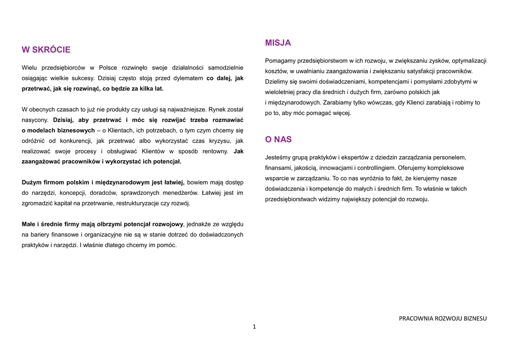 PROGRAM ROZWOJU BIZNESU MISJA W SKRÓCIE Pomagamy przedsiębiorstwom w ich rozwoju, w zwiększaniu zysków, optymalizacji Wielu przedsiębiorców w Polsce rozwinęło swoje działalności samodzielnie kosztów, w uwalnianiu zaangażowania i zwiększaniu satysfakcji pracowników. osiągając wielkie sukcesy. Dzisiaj często stoją przed dylematem co dalej, jak Dzielimy się swoimi doświadczeniami, kompetencjami i pomysłami zdobytymi w przetrwać, jak się rozwinąć, co będzie za kilka lat. wieloletniej pracy dla średnich i dużych firm, zarówno polskich jak i międzynarodowych. Zarabiamy tylko wówczas, gdy Klienci zarabiają i robimy to W obecnych czasach to już nie produkty czy usługi są najważniejsze. Rynek został po to, aby móc pomagać więcej. nasycony. Dzisiaj, aby przetrwać i móc się rozwijać trzeba rozmawiać o modelach biznesowych – o Klientach, ich potrzebach, o tym czym chcemy się O NAS odróżnić od konkurencji, jak przetrwać albo wykorzystać czas kryzysu, jak realizować swoje procesy i obsługiwać Klientów w sposób rentowny. Jak Jesteśmy grupą praktyków i ekspertów z dziedzin zarządzania personelem, zaangażować pracowników i wykorzystać ich potencjał. finansami, jakością, innowacjami i controllingiem. Oferujemy kompleksowe wsparcie w zarządzaniu. To co nas wyróżnia to fakt, że kierujemy nasze Dużym firmom polskim i międzynarodowym jest łatwiej, bowiem mają dostęp doświadczenia i kompetencje do małych i średnich firm. To właśnie w takich do narzędzi, koncepcji, doradców, sprawdzonych menedżerów. Łatwiej jest im przedsiębiorstwach widzimy największy potencjał do rozwoju. zgromadzić kapitał na przetrwanie, restrukturyzacje czy rozwój. Małe i średnie firmy mają olbrzymi potencjał rozwojowy, jednakże ze względu na bariery finansowe i organizacyjne nie są w stanie dotrzeć do doświadczonych praktyków i narzędzi. I właśnie dlatego chcemy im pomóc. PRACOWNIA ROZWOJU BIZNESU 1 PROGRAM ROZWOJU BIZNESU FORMY WSPÓŁPRACY Współpracę rozpoczynamy od warsztatów inspirujących. Może to być forma otwarta (1 dzień) lub też zamknięta dla firmy (1-3 dni). Na takich spotkaniach wprowadzamy do idei zarządzania modelem biznesowym, prezentujemy konkretne narzędzia i sprawdzone koncepcje do zastosowania w każdym obszarze (klient, ludzie, procesy, finanse). Kolejny etap to rozpoczęcie wprowadzania programu rozwoju w firmie. Rekomendujemy powołanie zespołu w wewnątrz organizacji i uczestnictwo w cyklu praktycznych warsztatów. Miesięczne spotkania z naszymi ekspertami i tygodniowe zdalne warsztaty pomagają nie tylko w przyswojeniu wiedzy, ale również we wprowadzaniu jej w rzeczywistość biznesową. Trzecia forma współpracy dotyczy wybranych firm. Tworzymy Pracownie Rozwoju Biznesu z udziałem kilku przedsiębiorstw, które nie tylko chcą usprawnić obecną działalność, ale myślą o nowych możliwościach i współpracy partnerskiej z innymi podmiotami. Dzięki takim aliansom przy stałym wsparciu naszych ekspertów i coachów można sięgnąć po najbardziej ambitne cele. PRACOWNIA ROZWOJU BIZNESU 2 PROGRAM ROZWOJU BIZNESU PROGRAM ROZWOJU BIZNESU NA CZYM POLEGA PROGRAM ROZWOJU BIZNESU? Program opracowany przez Pracownię Rozwoju Biznesu pozwoli Państwu na: Proponowany przez nas kompleksowy Program Rozwoju Biznesu składa się z pięciu etapów: ZROZUMIENIE OBECNEGO MODELU BIZNESOWEGO gdzie jestem? 1. Analiza obecnego modelu przedsiębiorstwa 2. Analiza otoczenia rynkowego / konkurencyjnego POZNANIE OTOCZENIA RYNKOWEGO jakie jest otoczenie i jaki ma wpływ na mój biznes? 3. Opracowanie docelowego modelu biznesowego 4. Wdrożenie działań korygujących i zapobiegawczych REFLEKSJĘ I SFORMUŁOWNIE CELU BIZNESOWEGO gdzie chcę być za rok, dwa, trzy? jak w pełni wykorzystać potencjał firmy? jak postępować z obszarami problemowymi? 5. Stały monitoring zasadności przyjętego modelu biznesowego. Dlaczego właśnie taki program rekomendujemy? ODPOWIEDNIĄ REAKCJĘ NA TO, CO SIĘ DZIEJE jak mogę to osiągnąć? Do właściwego zidentyfikowania problemu, jaki dotknął dane przedsiębiorstwo lub do odkrycia jego potencjału niezbędne jest rozpoznanie, w jakim modelu KONTROLĘ PROWADZONYCH DZIAŁAŃ czy wszystko przebiega zgodnie z oczekiwaniami? biznesowym obecnie pracuje. Niemniej jednak dla pełnego obrazu funkcjonowania przedsiębiorstwa konieczna jest również analiza tego, co na zewnątrz, co kształtuje warunki makroekonomiczne, co stanowi o naszej konkurencyjności na rynku. Dopiero po wnikliwej analizie tych dwóch obszarów tj. samego przedsiębiorstwa i modelu, w jakim funkcjonuje oraz jego otoczenia, jesteśmy w stanie poprawnie zdiagnozować obszary problemowe, odnaleźć ich źródło lub wskazać potencjał do rozwoju przedsiębiorstwa. Wówczas rozpoczyna się etap przygotowania docelowego modelu biznesowego i wdrożenia działań, które doprowadzą Państwa do założonego celu. Ale na tym Program Rozwoju Biznesu się nie kończy. Można by powiedzieć, że dopiero rozpoczyna. Zarówno na etapie analizy, jak i wdrożenia działań PRACOWNIA ROZWOJU BIZNESU 3 PROGRAM ROZWOJU BIZNESU korygujących niezbędna jest obserwacja założonego kursu tj. ciągły monitoring przyjętych założeń biznesowych. Jak pracujemy? Do Państwa dyspozycji oddajemy zespół naszych ekspertów, posiadających bogate doświadczenie w różnych obszarach biznesu (m.in. zarządzanie, finanse, controlling, sprzedaż, HR, zarządzanie jakością, marketing). Do sprawnego wdrożenia Programu niezbędne będzie również zaangażowanie z Państwa strony. Dlatego – w miarę Państwa możliwości - rekomendujemy oddelegowanie dedykowanego zespołu ds. Programu Rozwoju Biznesu, który będzie uczestniczył w warsztatach prowadzonych przez nas w ramach Programu. Zespół ten będzie miał możliwość zdobycia ogromnej wiedzy oraz wymiany doświadczeń podczas bezpośredniej współpracy z naszymi ekspertami