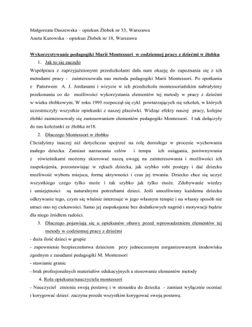 Małgorzata Daszewska – opiekun Żłobek nr 33, Warszawa Aneta Kurowska – opiekun Żłobek nr 18, Warszawa Wykorzystywanie pedagogiki Marii Montessori w codziennej pracy z dziećmi w żłobku 1. Jak to się zaczęło Współpraca z zaprzyjaźnionymi przedszkolami dała nam okazję do zapoznania się z ich metodami pracy - zainteresowała nas metoda pedagogiki Marii Montessori. Po spotkaniu z Państwem A. J. Jordanami i wizycie w ich przedszkolu montessoriańskim nabrałyśmy przekonania co do możliwości wykorzystania elementów tej metody w pracy z dziećmi w wieku żłobkowym. W roku 1995 rozpoczął się cykl powtarzających się szkoleń, w których uczestniczyły wszystkie opiekunki z naszej placówki. Widząc efekty naszej pracy, kolejne żłobki zainteresowały się zastosowaniem elementów pedagogiki Montessori. I tak dołączyły do nas koleżanki ze żłobka nr18. 2. Dlaczego Montessori w żłobku Chciałyśmy inaczej niż dotychczas spojrzeć na rolę dorosłego w procesie wychowania małego dziecka. Zamiast narzucania celów z i tempa ich osiągania, porównywania rówieśnikami możemy skierować naszą uwagę na zainteresowania i możliwości ich zaspokojenia, pozostawiając w rękach dziecka, jak szybko robi postępy i dać dziecku możliwość wyboru miejsca, formę aktywności i czas jej trwania. Dziecko chce się uczyć wszystkiego czego tylko może i tak szybko jak tylko może. Zdobywanie wiedzy i umiejętności są naturalnymi potrzebami dzieci. Jeśli umożliwimy każdemu dziecku odkrywanie tego, czym się właśnie interesuje w jego własnym tempie i na własny sposób nie utraci ono tej ciekawości. Samo jej zaspokojenie bez dodatkowych nagród i motywacji będzie dla niego źródłem radości. 3. Dlaczego pojawiają się u opiekunów obawy przed wprowadzeniem elementów tej metody w codziennej pracy z dziećmi - duża ilość dzieci w grupie - zapewnienie bezpieczeństwa dzieciom przy jednoczesnym zorganizowanym środowisku zgodnym z zasadami pedagogiki M. Montessori - stawianie granic - brak profesjonalnych materiałów edukacyjnych a stosowanie elementów metody 4. Rola opiekuna/nauczyciela montessori - Nauczyciel zmienia swoją postawę i w stosunku do dziecka - zamiast wyłącznie oceniać i korygować dzieci zaczyna przede wszystkim korygować swoją postawę. - Nauczyciel potrafi dostosować zabiegi wychowawcze do konkretnego dziecka i grupy, jest animatorem działań. - Dziecko traktuje podmiotowo, nie narzuca tylko podąża za dzieckiem towarzysząc mu w rozwoju. Nauczyciel dąży do wychowania dzieci w szacunku, życzliwości i akceptacji siebie i innych. 5. Zalety stosowania elementów pedagogiki M. Montessori w codziennej pracy z dziećmi - uporządkowane środowisko i otoczenie dziecka - odwaga i niezależność w myśleniu i działaniu - systematyczność i dążenie do ukończenia rozpoczętych działań - dziecko uczy się asertywności i poczucia własnej wartości. - ułatwienie w organizacji pracy z dziećmi w grupie / w przypadku dużych grup dzieci dowolnie wybierając swoją aktywność naturalnie dzielą się na małe grupy - satysfakcja z osiągnięć dziecka i grupy 6. Podsumowanie Na początku byłyśmy pełne obaw i niepewności lecz nasze 17 letnie doświadczenia utwierdziły nas, że obrałyśmy słuszną drogę ponieważ pedagogika M. Montessori daje dobre efekty wychowawcze i satysfakcję dla nauczyciela. Metoda ta od wielu dziesiątek lat jest praktykowana w przedszkolach i szkołach i z powodzeniem jej elementy są wprowadzane w żłobkach do czego serdecznie zachęcamy.