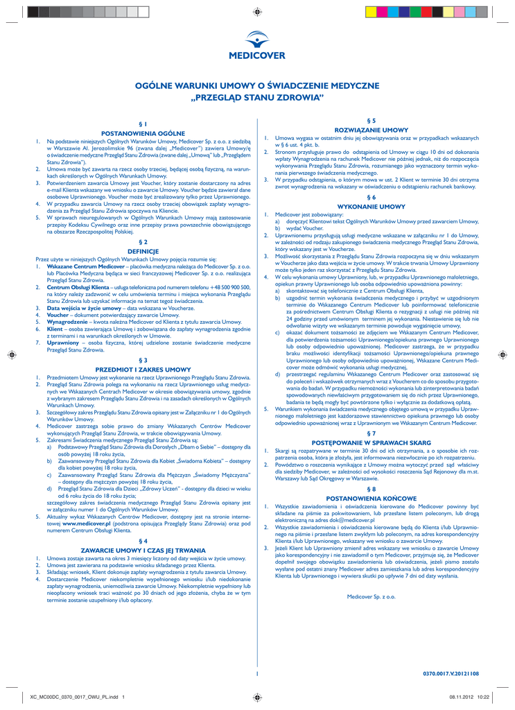 OGÓLNE WARUNKI UMOWY O ŚWIADCZENIE MEDYCZNE „PRZEGLĄD STANU ZDROWIA” §5 ROZWIĄZANIE UMOWY §1 POSTANOWIENIA OGÓLNE 1. 2. 3. 4. 5. 1. Na podstawie niniejszych Ogólnych Warunków Umowy, Medicover Sp. z o.o. z siedzibą w Warszawie Al. Jerozolimskie 96 (zwana dalej „Medicover”) zawiera Umowy/ę o świadczenie medyczne Przegląd Stanu Zdrowia (zwane dalej „Umową” lub „Przeglądem Stanu Zdrowia”). Umowa może być zawarta na rzecz osoby trzeciej, będącej osobą fizyczną, na warunkach określonych w Ogólnych Warunkach Umowy. Potwierdzeniem zawarcia Umowy jest Voucher, który zostanie dostarczony na adres e-mail Klienta wskazany we wniosku o zawarcie Umowy. Voucher będzie zawierał dane osobowe Uprawnionego. Voucher może być zrealizowany tylko przez Uprawnionego. W przypadku zawarcia Umowy na rzecz osoby trzeciej obowiązek zapłaty wynagrodzenia za Przegląd Stanu Zdrowia spoczywa na Kliencie. W sprawach nieuregulowanych w Ogólnych Warunkach Umowy mają zastosowanie przepisy Kodeksu Cywilnego oraz inne przepisy prawa powszechnie obowiązującego na obszarze Rzeczpospolitej Polskiej. 2. 3. §6 WYKONANIE UMOWY 1. 2. §2 DEFINICJE 3. Przez użyte w niniejszych Ogólnych Warunkach Umowy pojęcia rozumie się: 1. Wskazane Centrum Medicover – placówka medyczna należąca do Medicover Sp. z o.o. lub Placówka Medyczna będąca w sieci franczyzowej Medicover Sp. z o.o. realizująca Przegląd Stanu Zdrowia. 2. Centrum Obsługi Klienta – usługa telefoniczna pod numerem telefonu +48 500 900 500, na który należy zadzwonić w celu umówienia terminu i miejsca wykonania Przeglądu Stanu Zdrowia lub uzyskać informacje na temat tegoż świadczenia. 3. Data wejścia w życie umowy – data wskazana w Voucherze. 4. Voucher – dokument potwierdzający zawarcie Umowy. 5. Wynagrodzenie – kwota należna Medicover od Klienta z tytułu zawarcia Umowy. 6. Klient – osoba zawierająca Umowę i zobowiązana do zapłaty wynagrodzenia zgodnie z terminami i na warunkach określonych w Umowie. 7. Uprawniony – osoba fizyczna, której udzielone zostanie świadczenie medyczne Przegląd Stanu Zdrowia. 4. §3 PRZEDMIOT I ZAKRES UMOWY 1. 2. 3. 4. 5. 5. Przedmiotem Umowy jest wykonanie na rzecz Uprawnionego Przeglądu Stanu Zdrowia. Przegląd Stanu Zdrowia polega na wykonaniu na rzecz Uprawnionego usług medycznych we Wskazanych Centrach Medicover w okresie obowiązywania umowy, zgodnie z wybranym zakresem Przeglądu Stanu Zdrowia i na zasadach określonych w Ogólnych Warunkach Umowy. Szczegółowy zakres Przeglądu Stanu Zdrowia opisany jest w Załączniku nr 1 do Ogólnych Warunków Umowy. Medicover zastrzega sobie prawo do zmiany Wskazanych Centrów Medicover wykonujących Przegląd Stanu Zdrowia, w trakcie obowiązywania Umowy. Zakresami Świadczenia medycznego Przegląd Stanu Zdrowia są: a) Podstawowy Przegląd Stanu Zdrowia dla Dorosłych „Dbam o Siebie” – dostępny dla osób powyżej 18 roku życia, b) Zaawansowany Przegląd Stanu Zdrowia dla Kobiet „Świadoma Kobieta” – dostępny dla kobiet powyżej 18 roku życia, c) Zaawansowany Przegląd Stanu Zdrowia dla Mężczyzn „Świadomy Mężczyzna” – dostępny dla mężczyzn powyżej 18 roku życia, d) Przegląd Stanu Zdrowia dla Dzieci „Zdrowy Uczeń” - dostępny dla dzieci w wieku od 6 roku życia do 18 roku życia; szczegółowy zakres świadczenia medycznego Przegląd Stanu Zdrowia opisany jest w załączniku numer 1 do Ogólnych Warunków Umowy. Aktualny wykaz Wskazanych Centrów Medicover, dostępny jest na stronie internetowej www.medicover.pl (podstrona opisująca Przeglądy Stanu Zdrowia) oraz pod numerem Centrum Obsługi Klienta. 5. 1. 2. Skargi są rozpatrywane w terminie 30 dni od ich otrzymania, a o sposobie ich rozpatrzenia osoba, która je złożyła, jest informowana niezwłocznie po ich rozpatrzeniu. Powództwo o roszczenia wynikające z Umowy można wytoczyć przed sąd właściwy dla siedziby Medicover, w zależności od wysokości roszczenia Sąd Rejonowy dla m.st. Warszawy lub Sąd Okręgowy w Warszawie. §8 POSTANOWIENIA KOŃCOWE 1. 2. 3. Umowa zostaje zawarta na okres 3 miesięcy liczony od daty wejścia w życie umowy. Umowa jest zawierana na podstawie wniosku składanego przez Klienta. Składając wniosek, Klient dokonuje zapłaty wynagrodzenia z tytułu zawarcia Umowy. Dostarczenie Medicover niekompletnie wypełnionego wniosku i/lub niedokonanie zapłaty wynagrodzenia, uniemożliwia zawarcie Umowy. Niekompletnie wypełniony lub nieopłacony wniosek traci ważność po 30 dniach od jego złożenia, chyba że w tym terminie zostanie uzupełniony i/lub opłacony. Wszystkie zawiadomienia i oświadczenia kierowane do Medicover powinny być składane na piśmie za pokwitowaniem, lub przesłane listem poleconym, lub drogą elektroniczną na adres [email protected] Wszystkie zawiadomienia i oświadczenia kierowane będą do Klienta i/lub Uprawnionego na piśmie i przesłane listem zwykłym lub poleconym, na adres korespondencyjny Klienta i/lub Uprawnionego, wskazany we wniosku o zawarcie Umowy. Jeżeli Klient lub Uprawniony zmienił adres wskazany we wniosku o zawarcie Umowy jako korespondencyjny i nie zawiadomił o tym Medicover, przyjmuje się, że Medicover dopełnił swojego obowiązku zawiadomienia lub oświadczenia, jeżeli pismo zostało wysłane pod ostatni znany Medicover adres zamieszkania lub adres korespondencyjny Klienta lub Uprawnionego i wywiera skutki po upływie 7 dni od daty wysłania. Medicover Sp. z o.o. 1 XC_MC00DC_0370_0017_OWU_PL.indd 1 Medicover jest zobowiązany: a) doręczyć Klientowi tekst Ogólnych Warunków Umowy przed zawarciem Umowy, b) wydać Voucher. Uprawnionemu przysługują usługi medyczne wskazane w załączniku nr 1 do Umowy, w zależności od rodzaju zakupionego świadczenia medycznego Przegląd Stanu Zdrowia, który wskazany jest w Voucherze. Możliwość skorzystania z Przeglądu Stanu Zdrowia rozpoczyna się w dniu wskazanym w Voucherze jako data w