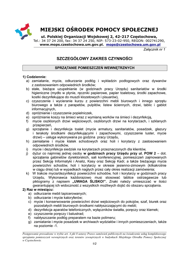 MIEJSKI OŚRODEK POMOCY SPOŁECZNEJ ul. Polskiej Organizacji Wojskowej 2, 42-217 Częstochowa, Tel.: 34 37 24 200, fax: 34 37 24 250, NIP: 573-23-02-950, REGON: 002741290, www.mops.czestochowa.um.gov.pl. [email protected] Załącznik nr 1 SZCZEGÓŁOWY ZAKRES CZYNNOŚCI SPRZĄTANIE POMIESZCZEŃ WEWNĘTRZNYCH 1) Codziennie: a) zamiatanie, mycie, odkurzanie podłóg i wykładzin podłogowych oraz dywanów z zastosowaniem odpowiednich środków; b) stałe, bieżące uzupełnianie (w godzinach pracy Urzędu) sanitariatów w środki higieniczne (mydło w płynie, ręczniki papierowe, papier toaletowy, środki zapachowe, kostki dezynfekujące do muszli klozetowych i pisuarów), c) czyszczenie i wycieranie kurzu z powierzchni mebli biurowych i innego sprzętu biurowego a także z parapetów, pulpitów, listew ściennych, drzwi, tablic i gablot informacyjnych, d) opróżnianie i czyszczenie popielniczek, e) opróżnianie koszy na śmieci wraz z wymianą worków na śmieci i dezynfekcją, f) mycie oszklonych drzwi wejściowych, oszklonych drzwi na korytarzach, i szklanych przepierzeń, g) sprzątanie i dezynfekcja toalet (mycie armatury, sanitariatów, posadzek, glazury i terakoty środkami dezynfekującymi i zapachowymi, czyszczenie luster, mycie drzwi) – usługa wykonywana po godzina pracy Urzędu, h) zamiatanie i mycie klatek schodowych oraz holi i korytarzy z zastosowaniem odpowiednich środków, i) mycie i dezynfekcja siedzisk na korytarzach przeznaczonych dla klientów, j) dyżur co najmniej jednej osoby w godzinach pracy Urzędu przy ul. POW 2 – dot. sprzątania gabinetów dyrektorskich, sali konferencyjnej, pomieszczeń zajmowanych przez Sekcję Informatyki i Analiz, Kasy oraz Sekcję Kadr, a także bieżącego mycia powierzchni schodów, holi i korytarzy w okresie jesienno-zimowym (kilkakrotnie w ciągu dnia) lub w wypadkach nagłych przez cały okres realizacji zamówienia; k) W trakcie mycia/dezynfekcji powierzchni schodów, holi i korytarzy w godzinach pracy Urzędu, Wykonawca każdorazowo musi stosować tablice ostrzegawcze lub piktogramy z napisem „UWAGA ŚLISKO!”. Znaki należy umieszczać w ilości gwarantującej ich widoczność z wszystkich możliwych dojść do obszaru sprzątania. 2) Raz w miesiącu: a) odkurzanie mebli tapicerowanych; b) odkurzanie i mycie kaloryferów; c) mycie i konserwowanie powierzchni drzwi wejściowych do pokojów, szaf, biurek oraz pozostałych mebli biurowych środkami nabłyszczającymi do mebli; d) dezynfekcja aparatów telefonicznych, wyłączników światła, poręczy oraz klamek; e) czyszczenie poręczy i balustrad; f) nabłyszczanie podłóg preparatem na bazie polimeru; g) zamiatanie i mycie posadzek w archiwach wydziałów i innych pomieszczeniach, także na poziomie -1. Postępowanie prowadzone w trybie art. 4 pkt 8 ustawy Prawo zamówień publicznych na świadczenie usług kompleksowego sprzątania pomieszczeń wewnętrznych oraz terenów zewnętrznych w budynkach Miejskiego Ośrodka Pomocy Społecznej w Częstochowie. 1/2 3) Raz na kwartał: a) mycie okien; b) konserwacja odpowiednimi – antypoślizgowymi środkami powierzchni holi, korytarzy i holu obsługi interesanta, 4) Raz w okresie realizacji zamówienia w terminie wyznaczonym przez Zamawiającego: a) pranie firan, b) pranie wykładzin dywanowych i dywanów, c) demontaż i mycie opraw oświetleniowych, d) mycie rolet zewnętrznych, e) czyszczenie rolet materiałowych wewnętrznych, f) polimeryzacja powierzchni holi i korytarzy poprzez zdarcie starej powłoki, zmycie, położenie polimeru oraz położenie polimeru zabezpieczająco-impregnującego; 5) Każdorazowo: generalne sprzątanie po malowaniu i remontach pomieszczeń w dniach i godzinach uzgodnionych z Zamawiającym. Godziny pracy Miejskiego Ośrodka Pomocy Społecznej w Częstochowie (dot. wszystkich budynków objętych przedmiotem zamówienia): pon, śr., czw. w godz. 7:30 – 15:30, wt. 7:30 – 16:00, pt. 7:30 – 15:00. SPRZĄTANIE POMIESZCZEŃ ZEWNĘTRZNYCH 1) Sprzątanie terenu wokół budynku biurowego Miejskiego Ośrodka Pomocy Społecznej Częstochowy przy ul. POW 2 - powierzchnia 1823 m2: Codzienne sprzątanie chodników, parkingu na tyłach budynku oraz parkingu wewnętrznego, w tym: a) zamiatanie, b) opróżnianie koszy, c) koszenie trawników i usuwanie liści, d) usuwanie trawy z chodników, e) bieżące, całkowite usuwanie śniegu i lodu z chodników, z parkingu dla pracowników MOPS (zarówno z przodu jak i z tyłu budynku), posypywanie sprzątanych powierzchni piaskiem i solą, f) bieżący wywóz usuniętego z chodników, parkingu i dziedzińca wewnętrznego śniegu w miejsca składowania śniegu wyznaczone przez Gminę – średnia odległość miejsc sładowania śniegu, wyznaczonych przez Gminę, od sprzątanego obiektu wynosi 10 kilometrów. 2) Sprzątanie terenu wokół budynku biurowego Rejonowego Zespołu Pomocy Społecznej nr 2 przy ul. Staszica 10 - powierzchnia 380 m2: Codzienne sprzątanie chodnika i parkingu wewnętrznego, w tym: a) zamiatanie, b) opróżnianie koszy, c) usuwanie liści i trawy z chodnika, d) bieżące, całkowite usuwanie śniegu i lodu z chodnika i parkingu wewnętrznego, posypywanie sprzątanych powierzchni piaskiem i solą, e) bieżący wywóz usuniętego z chodnika i parkingu wewnętrznego śniegu w miejsca składowania śniegu wyznaczone przez Gminę – średnia odległość miejsc sładowania śniegu, wyznaczonych przez Gminę, od sprzątanego obiektu wynosi 10 kilometrów. Postępowanie prowadzone w trybie art. 4 pkt 8 ustawy Prawo zamówień publicznych na świadczenie usług kompleksowego sprzątania pomieszczeń wewnętrznych oraz terenów zewnętrznych w budynkach Miejskiego Ośrodka Pomocy Społecznej w Częstochowie. 2/2