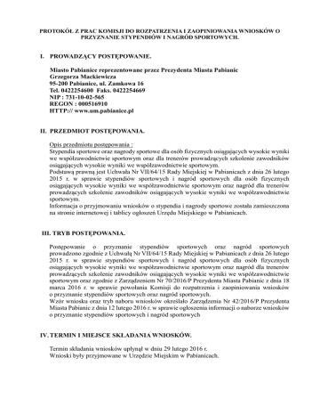 PROTOKÓŁ Z PRAC KOMISJI DO ROZPATRZENIA I ZAOPINIOWANIA WNIOSKÓW O PRZYZNANIE STYPENDIÓW I NAGRÓD SPORTOWYCH. I. PROWADZĄCY POSTĘPOWANIE. Miasto Pabianice reprezentowane przez Prezydenta Miasta Pabianic Grzegorza Mackiewicza 95-200 Pabianice, ul. Zamkowa 16 Tel. 0422254600 Faks. 0422254669 NIP : 731-10-02-565 REGON : 000516910 HTTP:// www.um.pabianice.pl II. PRZEDMIOT POSTĘPOWANIA. Opis przedmiotu postępowania : Stypendia sportowe oraz nagrody sportowe dla osób fizycznych osiągających wysokie wyniki we współzawodnictwie sportowym oraz dla trenerów prowadzących szkolenie zawodników osiągających wysokie wyniki we współzawodnictwie sportowym. Podstawą prawną jest Uchwała Nr VII/64/15 Rady Miejskiej w Pabianicach z dnia 26 lutego 2015 r. w sprawie stypendiów sportowych i nagród sportowych dla osób fizycznych osiągających wysokie wyniki we współzawodnictwie sportowym oraz nagród dla trenerów prowadzących szkolenie zawodników osiągających wysokie wyniki we współzawodnictwie sportowym. Informacja o przyjmowaniu wniosków o stypendia i nagrody sportowe została zamieszczona na stronie internetowej i tablicy ogłoszeń Urzędu Miejskiego w Pabianicach. III. TRYB POSTĘPOWANIA. Postępowanie o przyznanie stypendiów sportowych oraz nagród sportowych prowadzono zgodnie z Uchwałą Nr VII/64/15 Rady Miejskiej w Pabianicach z dnia 26 lutego 2015 r. w sprawie stypendiów sportowych i nagród sportowych dla osób fizycznych osiągających wysokie wyniki we współzawodnictwie sportowym oraz nagród dla trenerów prowadzących szkolenie zawodników osiągających wysokie wyniki we współzawodnictwie sportowym oraz zgodnie z Zarządzeniem Nr 70/2016/P Prezydenta Miasta Pabianic z dnia 18 marca 2016 r. w sprawie powołania Komisji do rozpatrzenia i zaopiniowania wniosków o przyznanie stypendiów sportowych oraz nagród sportowych. Wzór wniosku oraz tryb naboru wniosków określało Zarządzenia Nr 42/2016/P Prezydenta Miasta Pabianic z dnia 12 lutego 2016 r. w sprawie ogłoszenia informacji o naborze wniosków o przyznanie stypendiów sportowych i nagród sportowych IV. TERMIN I MIEJSCE SKŁADANIA WNIOSKÓW. Termin składania wniosków upłynął w dniu 29 lutego 2016 r. Wnioski były przyjmowane w Urzędzie Miejskim w Pabianicach. V. PRACE KOMISJI. Wnioski rozpatrywała Komisja powołana Zarządzeniem Nr 70/2016/P Prezydenta Miasta Pabianic z dnia 18 marca 2016 r. w sprawie powołania Komisji do rozpatrzenia i zaopiniowania wniosków o przyznanie stypendiów sportowych oraz nagród sportowych. Rada Miejska wybrała do komisji swoich przedstawicieli Uchwałą nr XI/123/15 Rady Miejskiej w Pabianicach z dnia 18 maja 2015 r. w sprawie wyboru przedstawiciela Rady Miejskiej w Pabianicach do komisji opiniującej wnioski o nagrody i stypendia sportowe. Komisja zebrała się na posiedzeniu w dniu 23.03.2016 r. Komisja pracowała zgodnie z regulaminem pracy komisji zawartym z stosownym zarządzeniu oraz zgodnie z regulaminami przyznawania stypendiów i nagród sportowych zawartymi w stosownej Uchwale Rady Miejskiej w Pabianicach. Komisja analizowała i opiniowała wszystkie złożone wnioski, które wpłynęły. Po szczegółowej analizie poszczególnych wniosków pod względem formalnym i merytorycznym komisja postanowiła przyznać następujące stypendia i nagrody: a) przyznane stypendia sportowe : L.p. Imię i nazwisko 1. Ewa Kielar Klub/dyscyplina PTK/koszykówka 2. Weronika Dolewa PTK/koszykówka 3. Martyna Dolewa PTK/koszykówka 4. Julia Piestrzyńska PTK/koszykówka 5. Jakub Ambroziak PTC/zapasy, sumo 6. Michał Dybka PTC/zapasy 7. Jakub Madaj PTC/zapasy, sumo 8. Julia Walczyk Zjednoczeni/ szermierka 9. Kinga Królik UKS Azymut/bieg na orientacje, lekkoatletyka Kwota: 200,(miesięcznie) 200,(miesięcznie) 200,(miesięcznie) 200,(miesięcznie) 400,(miesięcznie) 400,(miesięcznie) 400,(miesięcznie) 500,(miesięcznie) 400,(miesięcznie) b) przyznane jednorazowe nagrody sportowe (dyscypliny indywidulane) : L.p. Imię i nazwisko Klub/dyscyplina Kwota 1. Hovannes Yazichyan UKS Heros Team, trójbój siłowy 2500,- 2. Krzysztof Jarzębski 2000,- 3. Mariusz Bałaziński AZS Łódź/ Pabiks, kolarz niepełnosprawny Olimp Zabrze, kulturystyka 4. Janina Rosińska Biegi długodystansowe 1000,- 5. Anna Nita WKS Śląsk Wrocław 2000,- 6. Piotr Gorzela Street Workout – niezrzeszony 2000,- 7. Józef Ejsmont PTC/podnoszenie ciężarów 2500,- 8. Anna Miłak 1000,- 9. Ada Komorowska UKS Tiger Team Łódź/ taniec sportowy PKT/tenis ziemny 10. Wiktoria Jurek PKT/tenis ziemny 800,- 11. Julia Krysiak PKT/tenis ziemny 800,- 12. Artur Gwiazdowski UKS Korona/badminton 600,- 13. Wiktor Wójcik PTC/zapasy 1000,- 14. Jakub Błachowicz PTC/zapasy 500,- 15. Mariusz Nikiel PTC/zapasy 2000,- 16. Dawid Grobelny PTC/zapasy, sumo 1000,- 17. Mateusz Domagała PTC/zapasy, sumo 1000,- 18. Justyna Czajka Zjednoczeni/ szermierka 1000,- 19. Weronika Czajka Zjednoczeni/ szermierka 1000,- 20. Julia Krempińska UKS Azymut/biegi na orientacje 500,- 21. Jan Sztranek UKS Azymut/biegi na orientacje 500,- 22. Dawid Kalisiak UKS Azymut/biegi na orientacje 1000,- 23. Konrad Płóciennik UKS Azymut/biegi na orientacje 1000,- 2000,- 1200,- 24. UKS Azymut/biegi długodystansowe Pabianicki Klub Sztuk Walki AZJA 1000,- 25. Milena Grabska Grzegorczyk Grzegorz Sokołowski 26. Patryk Jagodziński Pabianicki Klub Sztuk Walki AZJA 500,- 27. Aleksander Muszyński Pabianicki Klub Sztuk Walki AZJA 500,- 28. Piotr Dębiński Pabianicki Klub Sztuk Walki AZJA 500,- 29. Adam Tyran Pabianicki Klub Sztuk Walki AZJA 500,- 30. Oliwia Domańska Pabianicki Klub Sztuk Walki AZJA 500,- 700,- c) przyznane jednorazowe nagrody sportowe (dyscypliny zespołowe) : L.p. 1. Imię i nazwisko Joanna Twardowska Klub/dyscyplina PTK/koszykówka Kwota: 700,- 2. Sylwia Bujniak PTK/koszykówka 500,- 3. Beata Paranowska PTK/koszykówka 700,- 4. Dominika Szczygieł PTK/koszykówka 500,- 5. Magdalena Grzelak PTK/koszykówka 900,- 6. Anna Krakowska PTK