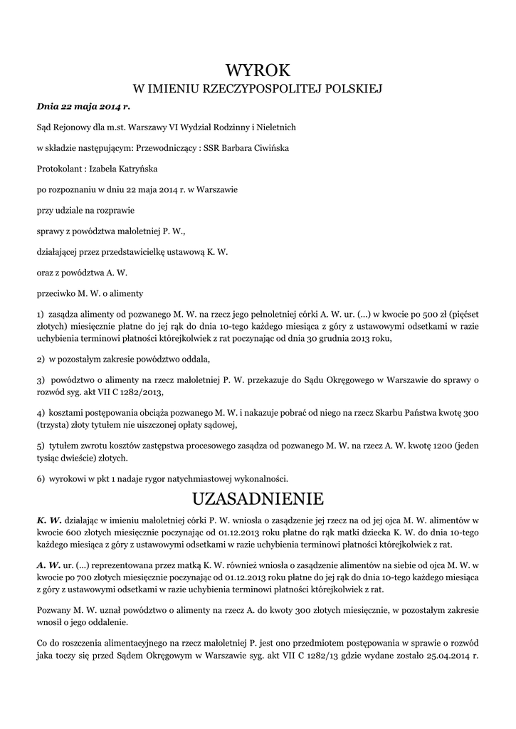 WYROK W IMIENIU RZECZYPOSPOLITEJ POLSKIEJ Dnia 22 maja 2014 r. Sąd Rejonowy dla m.st. Warszawy VI Wydział Rodzinny i Nieletnich w składzie następującym: Przewodniczący : SSR Barbara Ciwińska Protokolant : Izabela Katryńska po rozpoznaniu w dniu 22 maja 2014 r. w Warszawie przy udziale na rozprawie sprawy z powództwa małoletniej P. W., działającej przez przedstawicielkę ustawową K. W. oraz z powództwa A. W. przeciwko M. W. o alimenty 1) zasądza alimenty od pozwanego M. W. na rzecz jego pełnoletniej córki A. W. ur. (...) w kwocie po 500 zł (pięćset złotych) miesięcznie płatne do jej rąk do dnia 10-tego każdego miesiąca z góry z ustawowymi odsetkami w razie uchybienia terminowi płatności którejkolwiek z rat poczynając od dnia 30 grudnia 2013 roku, 2) w pozostałym zakresie powództwo oddala, 3) powództwo o alimenty na rzecz małoletniej P. W. przekazuje do Sądu Okręgowego w Warszawie do sprawy o rozwód syg. akt VII C 1282/2013, 4) kosztami postępowania obciąża pozwanego M. W. i nakazuje pobrać od niego na rzecz Skarbu Państwa kwotę 300 (trzysta) złoty tytułem nie uiszczonej opłaty sądowej, 5) tytułem zwrotu kosztów zastępstwa procesowego zasądza od pozwanego M. W. na rzecz A. W. kwotę 1200 (jeden tysiąc dwieście) złotych. 6) wyrokowi w pkt 1 nadaje rygor natychmiastowej wykonalności. UZASADNIENIE K. W. działając w imieniu małoletniej córki P. W. wniosła o zasądzenie jej rzecz na od jej ojca M. W. alimentów w kwocie 600 złotych miesięcznie poczynając od 01.12.2013 roku płatne do rąk matki dziecka K. W. do dnia 10-tego każdego miesiąca z góry z ustawowymi odsetkami w razie uchybienia terminowi płatności którejkolwiek z rat. A. W. ur. (...) reprezentowana przez matką K. W. również wniosła o zasądzenie alimentów na siebie od ojca M. W. w kwocie po 700 złotych miesięcznie poczynając od 01.12.2013 roku płatne do jej rąk do dnia 10-tego każdego miesiąca z góry z ustawowymi odsetkami w razie uchybienia terminowi płatności którejkolwiek z rat. Pozwany M. W. uznał powództwo o alimenty na rzecz A. do kwoty 300 złotych miesięcznie, w pozostałym zakresie wnosił o jego oddalenie. Co do roszczenia alimentacyjnego na rzecz małoletniej P. jest ono przedmiotem postępowania w sprawie o rozwód jaka toczy się przed Sądem Okręgowym w Warszawie syg. akt VII C 1282/13 gdzie wydane zostało 25.04.2014 r. na czas trwania postępowania postanowienie zabezpieczające te alimenty na kwotę 600 złotych miesięcznie, które pozwany zaskarżył zażaleniem, jak twierdzi. Z uwagi na fakt, iż pozew o rozwód wpłynął 19.12.2013 roku zaś sprawa o alimenty 30.12.2013 roku powództwo o alimenty na rzecz małoletniej P. W. należało art. 445 §1 Kodeksu postępowania cywilnego Sąd Rejonowy przekazać do Sądu Okręgowego w Warszawie do sprawy o rozwód sygn. akt VII C 1282/2013. Sąd Rejonowy ustalił następujący stan faktyczny : K. W.pozostaje w związku małżeńskim z pozwanym M. W.od 28 września (...)., z którego to związku urodziła się A. W.(...). ( k. 6) i P. W.(...)(...)r. ( k. 7). Między małżonkami toczy się w Sądzie Okręgowym w Warszawie od 19.12.2013 roku sprawa o rozwód pod syg. akt VII C 1282/13 (k.25 kopia pozwu). A. W.jest pełnoletnia. Jest uczennicą (...) Liceum Ogólnokształcącego im. E. D.w W., gdzie w tym roku przystąpi do egzaminu dojrzałości, po czym zamierza podjąć studia medyczne. Na jej utrzymanie miesięcznie potrzeba co najmniej około 1000 zł w tym : 250 zł. część kosztów utrzymania mieszkania, 600 zł koszty wyżywienia, 150 zł. inne potrzeby, ubrania, koszty edukacyjne i inne. K. W. jest zatrudniona na 1/1 etatu. Jej wynagrodzenie wynosi zł 1,181 złotych netto. Mieszka we własnym mieszkaniu(56 mkw). Koszty utrzymania mieszkania wynoszą 800 zł. Mieszka z obiema córkami małoletnią P. i A. W., które sama utrzymuje. M. W.ma 40 lat, wykształcenie podstawowe, pracuje w teatrze (...) im. A. S.jako montażysta dekoracji. Zarobki jakie osiąga pozwany wynoszą 2. 637 zł miesięcznie .Od grudnia 2013 r. nie mieszka z żoną i córkami i nie ponosi kosztów ich utrzymania, wyprowadził się i wynajmuje pokój za 600 złotych. Twierdzi, że ma liczne zobowiązania finansowe, które ograniczają mu możliwość płacenia na utrzymanie dzieci. Powyższy stan faktyczny Sąd ustalił na podstawie materiału zebranego w aktach sprawy w tym dowodu z przesłuchania stron w trybie art. 299 i 304 Kodeksu postępowania cywilnego. Sąd Rejonowy zważył co następuje: Powództwo o alimenty na rzecz pełnoletniej A. W. należało uwzględnić do kwoty po 500 zł miesięcznie płatnych do jej rąk do dnia 10-ego każdego miesiąca z góry z ustawowymi odsetkami od dnia wpłynięcia pozwu tj. od dnia 30 grudnia 2013 roku, a w pozostałym zakresie powództwo należało oddalić. W myśl przepisu art. 128 Kodeksu rodzinnego i opiekuńczego obowiązek dostarczania środków utrzymania, a w miarę potrzeby także środków wychowania (obowiązek alimentacyjny) obciąża krewnych w linii prostej oraz rodzeństwo. Rodzice obowiązanie są do świadczeń alimentacyjnych względem dziecka, które nie jest jeszcze w stanie utrzymać się samodzielnie, chyba że dziecko ma dochody ze swojego majątku, które wystarczają na jego utrzymanie (art. 133 §1 Kodeksu rodzinnego i opiekuńczego). Co do dzieci pełnoletnich to rodzice mogą się uchylić od świadczeń alimentacyjnych, jeżeli są one połączone z nadmiernym uszczerbkiem dla rodzica lub jeżeli dziecko nie dokłada starań w celu uzyskania możności samodzielnego utrzymania się (art.133§3 Kodeksu rodzinnego i opiekuńczego). Zakres świadczeń alimentacyjnych wyznaczają usprawiedliwione potrzeby uprawnionego (dziecka) i możliwości zarobkowe zobowiązanego ( rodzica). Chodzi przy tym o zapewnienie uprawnionemu prawidłowych, a nie jedynie minimalnych warunków bytowania. W niniejszej sprawie w ocenie Sądu Rejonowego zasadn