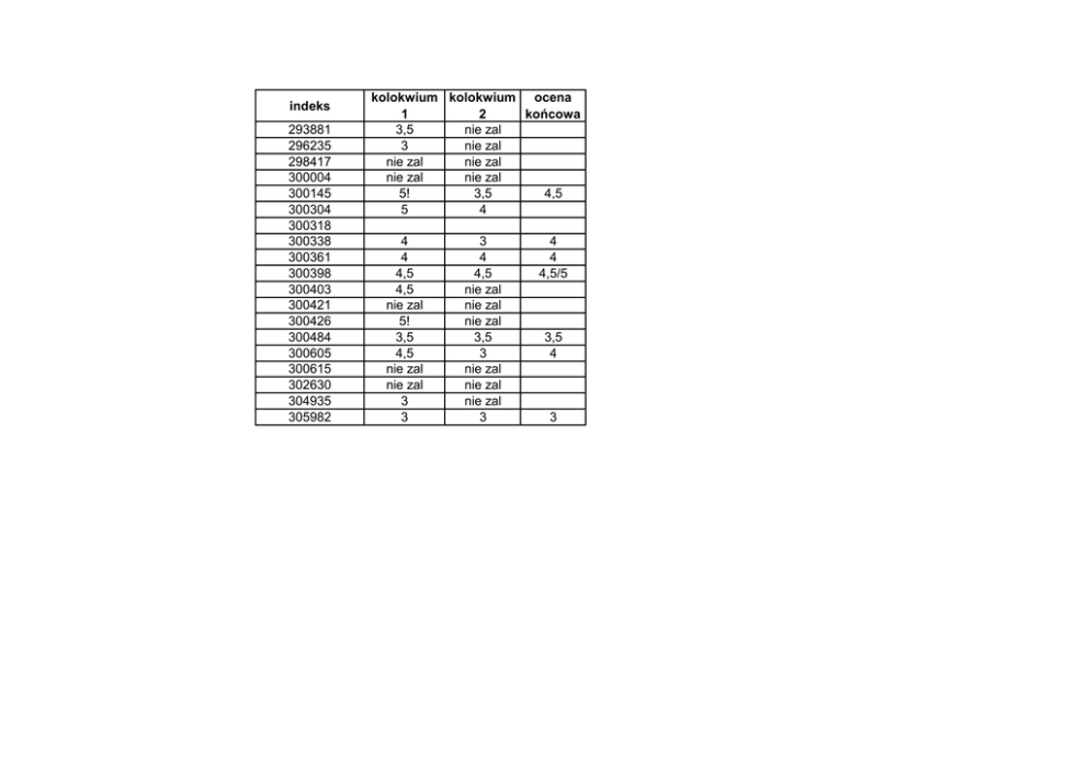 indeks kolokwium 1 kolokwium 2 ocena końcowa 293881 3,5 nie zal