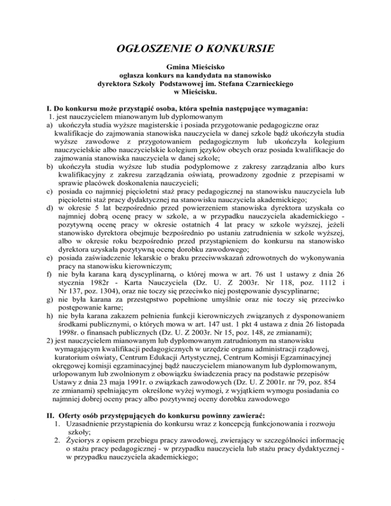 OGŁOSZENIE O KONKURSIE Gmina Mieścisko ogłasza konkurs na kandydata na stanowisko dyrektora Szkoły Podstawowej im. Stefana Czarnieckiego w Mieścisku. I. Do konkursu może przystąpić osoba, która spełnia następujące wymagania: 1. jest nauczycielem mianowanym lub dyplomowanym a) ukończyła studia wyższe magisterskie i posiada przygotowanie pedagogiczne oraz kwalifikacje do zajmowania stanowiska nauczyciela w danej szkole bądź ukończyła studia wyższe zawodowe z przygotowaniem pedagogicznym lub ukończyła kolegium nauczycielskie albo nauczycielskie kolegium języków obcych oraz posiada kwalifikacje do zajmowania stanowiska nauczyciela w danej szkole; b) ukończyła studia wyższe lub studia podyplomowe z zakresy zarządzania albo kurs kwalifikacyjny z zakresu zarządzania oświatą, prowadzony zgodnie z przepisami w sprawie placówek doskonalenia nauczycieli; c) posiada co najmniej pięcioletni staż pracy pedagogicznej na stanowisku nauczyciela lub pięcioletni staż pracy dydaktycznej na stanowisku nauczyciela akademickiego; d) w okresie 5 lat bezpośrednio przed powierzeniem stanowiska dyrektora uzyskała co najmniej dobrą ocenę pracy w szkole, a w przypadku nauczyciela akademickiego pozytywną ocenę pracy w okresie ostatnich 4 lat pracy w szkole wyższej, jeżeli stanowisko dyrektora obejmuje bezpośrednio po ustaniu zatrudnienia w szkole wyższej, albo w okresie roku bezpośrednio przed przystąpieniem do konkursu na stanowisko dyrektora uzyskała pozytywną ocenę dorobku zawodowego; e) posiada zaświadczenie lekarskie o braku przeciwwskazań zdrowotnych do wykonywania pracy na stanowisku kierowniczym; f) nie była karana karą dyscyplinarną, o której mowa w art. 76 ust 1 ustawy z dnia 26 stycznia 1982r - Karta Nauczyciela (Dz. U. Z 2003r. Nr 118, poz. 1112 i Nr 137, poz. 1304), oraz nie toczy się przeciwko niej postępowanie dyscyplinarne; g) nie była karana za przestępstwo popełnione umyślnie oraz nie toczy się przeciwko postępowanie karne; h) nie była karana zakazem pełnienia funkcji kierowniczych związanych z dysponowaniem środkami publicznymi, o których mowa w art. 147 ust. 1 pkt 4 ustawa z dnia 26 listopada 1998r. o finansach publicznych (Dz. U. Z 2003r. Nr 15, poz. 148, ze zmianami); 2) jest nauczycielem mianowanym lub dyplomowanym zatrudnionym na stanowisku wymagającym kwalifikacji pedagogicznych w urzędzie organu administracji rządowej, kuratorium oświaty, Centrum Edukacji Artystycznej, Centrum Komisji Egzaminacyjnej okręgowej komisji egzaminacyjnej bądź nauczycielem mianowanym lub dyplomowanym, urlopowanym lub zwolnionym z obowiązku świadczenia pracy na podstawie przepisów Ustawy z dnia 23 maja 1991r. o związkach zawodowych (Dz. U. Z 2001r. nr 79, poz. 854 ze zmianami) spełniającym określone wyżej wymogi, z wyjątkiem wymogu posiadania co najmniej dobrej oceny pracy albo pozytywnej oceny dorobku zawodowego II. Oferty osób przystępujących do konkursu powinny zawierać: 1. Uzasadnienie przystąpienia do konkursu wraz z koncepcją funkcjonowania i rozwoju szkoły; 2. Życiorys z opisem przebiegu pracy zawodowej, zwierający w szczególności informację o stażu pracy pedagogicznej - w przypadku nauczyciela lub stażu pracy dydaktycznej w przypadku nauczyciela akademickiego; 3. Akt nadania stopnia nauczyciela mianowanego lub dyplomowanego oraz dokumenty potwierdzające posiadanie wymaganego wykształcenia; 4. Dyplom ukończenia szkół wyższych oraz dokumenty potwierdzające posiadanie wymaganego stażu pracy, wykształcenia i przygotowania zawodowego - w przypadku osoby nie będącej nauczycielem; 5. Dyplom ukończenia studiów wyższych lub studiów podyplomowych z zakresu zarządzania oświatą; 6. Ocenę pracy o której mowa w §1 pkt 4 rozporządzenia Ministra Edukacji Narodowej i Sportu z dnia 6 maja 2003r. w sprawie wymagań jakim powinna odpowiadać osoba zajmująca stanowisko dyrektora oraz inne stanowisko kierownicze w poszczególnych typach szkół i placówek; 7. Świadczenie lekarskie o braku przeciwwskazań zdrowotnych do wykonania prac na stanowisku kierowniczym; 8. Oświadczenie, że kandydat nie był karany karą dyscyplinarną, o której mowa w art. 76 ust. 1 ustawy z dnia 26 stycznia 1982r. - Karta Nauczyciela (Dz. U. Z 2003r. Nr 118, poz. 1112 i Nr 137, poz. 1304), oraz nie toczy się przeciwko niemu postępowanie dyscyplinarne; 9. Oświadczenie że kandydat nie był karany za przestępstwo popełnione umyślnie oraz nie toczy się przeciwko niemu postępowanie karne 10. Oświadczenie że kandydat nie był karany zakazem pełnienia funkcji kierowniczych związanych z dysponowaniem ośrodkami publicznymi, o których mowa w art. 147 ust. 1 pkt 4 ustawy z dnia 26 listopada 1998r. o finansach publicznych (Dz. U. Z 203r. Nr 15, poz. 148, Nr 45, poz. 391, Nr 65, poz. 594, Nr 96, poz. 874 i nr 166, poz. 1611); 11. Oświadczenie, że kandydat wyraża zgodę na przetwarzanie swoich danych osobowych zgodnie z ustawą z dnia 29 sierpnia 1997r. o ochronie danych o osobowych (Dz. U. Z 2002r. Nr 101, poz. 929 i Nr 153, poz. 1271) w celach przeprowadzenia konkursu na stanowisko dyrektora. 3. Oferty należy składać w zamkniętych kopertach z podanym adresem zwrotnym i dopiskiem "Konkurs" w terminie do 31.03.2006 r. na adres: Urząd Gminy w Mieścisku, Pl. Powstańców Wlkp. 13, 62-290 Mieścisko. Konkurs przeprowadzi komisja konkursowa powołana przez Wójta Gminy Mieścisko. O terminie i miejscu przeprowadzenia postępowania konkursowego kandydaci zostaną powiadomieni indywidualnie. Wójt Gminy Mieścisko / Andrzej Banaszyński /