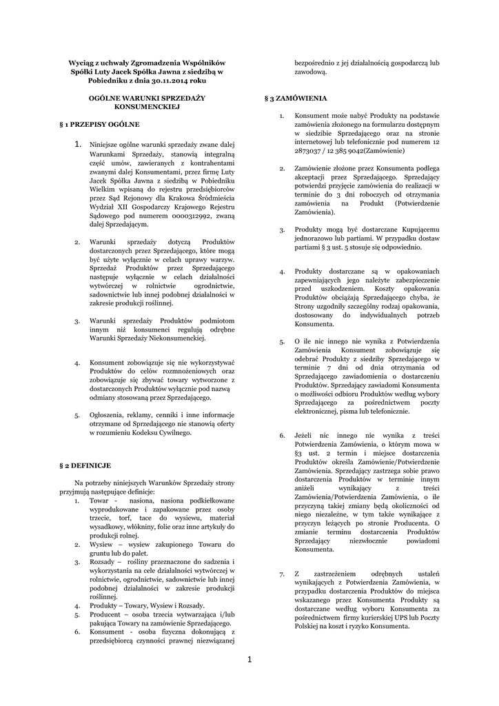 Wyciąg z uchwały Zgromadzenia Wspólników Spółki Luty Jacek Spółka Jawna z siedzibą w Pobiedniku z dnia 30.11.2014 roku bezpośrednio z jej działalnością gospodarczą lub zawodową. OGÓLNE WARUNKI SPRZEDAŻY KONSUMENCKIEJ § 3 ZAMÓWIENIA 1. Konsument może nabyć Produkty na podstawie zamówienia złożonego na formularzu dostępnym w siedzibie Sprzedającego oraz na stronie internetowej lub telefonicznie pod numerem 12 2873037 / 12 385 9042(Zamówienie) 2. Zamówienie złożone przez Konsumenta podlega akceptacji przez Sprzedającego. Sprzedający potwierdzi przyjęcie zamówienia do realizacji w terminie do 3 dni roboczych od otrzymania zamówienia na Produkt (Potwierdzenie Zamówienia). 3. Produkty mogą być dostarczane Kupującemu jednorazowo lub partiami. W przypadku dostaw partiami § 3 ust. 5 stosuje się odpowiednio. 4. Produkty dostarczane są w opakowaniach zapewniających jego należyte zabezpieczenie przed uszkodzeniem. Koszty opakowania Produktów obciążają Sprzedającego chyba, że Strony uzgodniły szczególny rodzaj opakowania, dostosowany do indywidualnych potrzeb Konsumenta. 5. O ile nic innego nie wynika z Potwierdzenia Zamówienia Konsument zobowiązuje się odebrać Produkty z siedziby Sprzedającego w terminie 7 dni od dnia otrzymania od Sprzedającego zawiadomienia o dostarczeniu Produktów. Sprzedający zawiadomi Konsumenta o możliwości odbioru Produktów według wybory Sprzedającego za pośrednictwem poczty elektronicznej, pisma lub telefonicznie. 6. Jeżeli nic innego nie wynika z treści Potwierdzenia Zamówienia, o którym mowa w §3 ust. 2 termin i miejsce dostarczenia Produktów określa Zamówienie/Potwierdzenie Zamówienia. Sprzedający zastrzega sobie prawo dostarczenia Produktów w terminie innym aniżeli wynikający z treści Zamówienia/Potwierdzenia Zamówienia, o ile przyczyną takiej zmiany będą okoliczności od niego niezależne, w tym także wynikające z przyczyn leżących po stronie Producenta. O zmianie terminu dostarczenia Produktów Sprzedający niezwłocznie powiadomi Konsumenta. 7. Z zastrzeżeniem odrębnych ustaleń wynikających z Potwierdzenia Zamówienia, w przypadku dostarczenia Produktów do miejsca wskazanego przez Konsumenta Produkty są dostarczane według wyboru Konsumenta za pośrednictwem firmy kurierskiej UPS lub Poczty Polskiej na koszt i ryzyko Konsumenta. § 1 PRZEPISY OGÓLNE 1. 2. 3. Niniejsze ogólne warunki sprzedaży zwane dalej Warunkami Sprzedaży, stanowią integralną część umów, zawieranych z kontrahentami zwanymi dalej Konsumentami, przez firmę Luty Jacek Spółka Jawna z siedzibą w Pobiedniku Wielkim wpisaną do rejestru przedsiębiorców przez Sąd Rejonowy dla Krakowa Śródmieścia Wydział XII Gospodarczy Krajowego Rejestru Sądowego pod numerem 0000312992, zwaną dalej Sprzedającym. Warunki sprzedaży dotyczą Produktów dostarczonych przez Sprzedającego, które mogą być użyte wyłącznie w celach uprawy warzyw. Sprzedaż Produktów przez Sprzedającego następuje wyłącznie w celach działalności wytwórczej w rolnictwie ogrodnictwie, sadownictwie lub innej podobnej działalności w zakresie produkcji roślinnej. Warunki sprzedaży Produktów podmiotom innym niż konsumenci regulują odrębne Warunki Sprzedaży Niekonsumenckiej. 4. Konsument zobowiązuje się nie wykorzystywać Produktów do celów rozmnożeniowych oraz zobowiązuje się zbywać towary wytworzone z dostarczonych Produktów wyłącznie pod nazwą odmiany stosowaną przez Sprzedającego. 5. Ogłoszenia, reklamy, cenniki i inne informacje otrzymane od Sprzedającego nie stanowią oferty w rozumieniu Kodeksu Cywilnego. § 2 DEFINICJE Na potrzeby niniejszych Warunków Sprzedaży strony przyjmują następujące definicje: 1. Towar nasiona, nasiona podkiełkowane wyprodukowane i zapakowane przez osoby trzecie, torf, tace do wysiewu, materiał wysadkowy, włókniny, folie oraz inne artykuły do produkcji rolnej. 2. Wysiew – wysiew zakupionego Towaru do gruntu lub do palet. 3. Rozsady – rośliny przeznaczone do sadzenia i wykorzystania na cele działalności wytwórczej w rolnictwie, ogrodnictwie, sadownictwie lub innej podobnej działalności w zakresie produkcji roślinnej. 4. Produkty – Towary, Wysiew i Rozsady. 5. Producent – osoba trzecia wytwarzająca i/lub pakująca Towary na zamówienie Sprzedającego. 6. Konsument - osoba fizyczna dokonującą z przedsiębiorcą czynności prawnej niezwiązanej 1 8. W przypadku dostarczenia Produktów do miejsca wskazanego przez Konsumenta ryzyko przypadkowej utraty lub uszkodzenia produktu lub jego części przechodzi na Konsumenta z chwilą wydania Produktów i/lub ich części przewoźnikowi 9. Sprzedający zastrzega sobie w ramach ustalonego w Zamówieniu wynagrodzenia prawo dostarczenia Produktów innych aniżeli zamówione, o ile niemożność dostarczenia Produktów wynikać będzie z przyczyn przez niego niezawinionych, w tym z przyczyn leżących po stronie Producenta. Dostarczenie Produktów zamiennych stanowiących odmiany zastępcze, tj. odmiany posiadające zbliżone parametry hodowlane, uznaje się za należyte wykonanie zobowiązania przez Sprzedającego. 10. O konieczności dostarczenia odmian zastępczych Sprzedający niezwłocznie zawiadomi Konsumenta. 11. W razie braku zamówionych Produktów u Producentów, w tym w szczególności niepowodzeń w produkcji lub wcześniejszej sprzedaży całego zapasu zamówionej odmiany, Sprzedający poinformuje Konsumenta o braku możliwości realizacji zamówienia ewentualnie zaproponuje inne produkty. 12. O ile to wynika z Zamówienia lub Potwierdzenia Zamówienia w chwili zawarcia umowy Sprzedający może przyjąć od Konsumenta nasiona, które Sprzedający zobowiązuje się dokonać Wysiewu na warunkach przewidzianych w Zamówieniu lub Potwierdzeniu zamówienia. Za przyjęte nasiona Sprzedający odpowiada wyłącznie do wysokości ich wartości rynnowej w chwili przyjęcia . Konsument ponosi ryzyko przydat