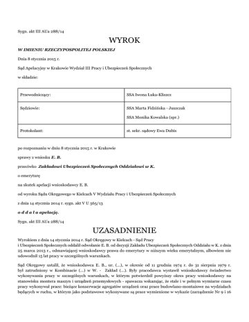 Sygn. akt III AUa 288/14 WYROK W IMIENIU RZECZYPOSPOLITEJ POLSKIEJ Dnia 8 stycznia 2015 r. Sąd Apelacyjny w Krakowie Wydział III Pracy i Ubezpieczeń Społecznych w składzie: Przewodniczący: SSA Iwona Łuka-Kliszcz Sędziowie: SSA Marta Fidzińska - Juszczak SSA Monika Kowalska (spr.) Protokolant: st. sekr. sądowy Ewa Dubis po rozpoznaniu w dniu 8 stycznia 2015 r. w Krakowie sprawy z wniosku E. B. przeciwko Zakładowi Ubezpieczeń Społecznych Oddziałowi w K. o emeryturę na skutek apelacji wnioskodawcy E. B. od wyroku Sądu Okręgowego w Kielcach V Wydziału Pracy i Ubezpieczeń Społecznych z dnia 14 stycznia 2014 r. sygn. akt V U 565/13 o d d a l a apelację. Sygn. akt III AUa 288/14 UZASADNIENIE Wyrokiem z dnia 14 stycznia 2014 r. Sąd Okręgowy w Kielcach - Sąd Pracy i Ubezpieczeń Społecznych oddalił odwołanie E. B. od decyzji Zakładu Ubezpieczeń Społecznych Oddziału w K. z dnia 25 marca 2013 r., odmawiającej wnioskodawcy prawa do emerytury w niższym wieku emerytalnym, albowiem nie udowodnił 15 lat pracy w szczególnych warunkach. Sąd Okręgowy ustalił, że wnioskodawca E. B., ur. (...), w okresie od 11 grudnia 1974 r. do 31 sierpnia 1979 r. był zatrudniony w Kombinacie (...) w W. - Zakład (...). Były pracodawca wystawił wnioskodawcy świadectwo wykonywania pracy w szczególnych warunkach, w którym potwierdził powyższy okres pracy wnioskodawcy na stanowisku montera maszyn i urządzeń przemysłowych - spawacza wskazując, że stale i w pełnym wymiarze czasu pracy wykonywał prace: bieżące konserwacje agregatów urządzeń oraz prace budowlano-montażowe na wydziałach będących w ruchu, w którym jako podstawowe wykonywane są prace wymienione w wykazie (zarządzenie Nr 9 i 16 Ministra BiPMB) i na stanowisku ślusarza wymienionym w wykazie A dział II, poz.1, pkt 1; dział IV poz.40; dział XIV poz.25 pkt 1, stanowiącym załącznik nr 1 do zarządzenia Nr 9 Ministra Budownictwa i Przemysłu Materiałów Budowlanych z dnia 1 sierpnia 1983 (Dz. Urz. MB i PMB Nr 3). W tym czasie wnioskodawca pracował przy remontach urządzeń cementowni, tj.: wykonywał remonty przenośników taśmowych, remonty rurociągów cementu i remonty reduktorów przy taśmach. Wszystkie prace wykonywał na wysokości. Podczas remontu produkcja cementu trwała nadal, jedynie zatrzymywano cześć, która była remontowana. Następnie wnioskodawca był zatrudniony w (...)Przedsiębiorstwie (...)w okresie od 1 września 1979 r. do 31 sierpnia 1989 r. i od 1 maja 1993 r. do 30 listopada 1998 r. Były pracodawca wystawił wnioskodawcy świadectwo pracy, w którym potwierdził okres zatrudnienia od 1 września 1979 r. do 31 sierpnia 1989 r. wskazując, że w tym czasie wykonywał stale i w pełnym wymiarze prace montera konstrukcji żelbetonowych i prefabrykatów na wysokości wymienione w wykazie A, Dziale V, poz. 5 pkt 2, stanowiącym załącznik nr 1 do zarządzenia Nr 9 Ministra Gospodarki Przestrzennej i Budownictwa z dnia 1 sierpnia 1983 r. w sprawie wykazu stanowisk pracy w budownictwie, na których są wykonywane prace w szczególnych warunkach lub w szczególnym charakterze uprawniające do wcześniejszego przejścia na emeryturę oraz do wzrostu emerytury (Dz.Urz. MBiPMB Nr 3 poz. 6.). W dniu 30 listopada 1998 r. były pracodawca wydał wnioskodawcy świadectwo pracy i potwierdził okres jego zatrudnienia od 1 maja 1993 r. do 30 listopada 1998 r. Wnioskodawca pracował na budowach eksportowych: od 10 września 1981 r. do 14 marca 1982 r. w (...) na stanowisku cieśli, od 24 września 1986 r. do 21 grudnia 1986 r. w(...)na stanowisku cieśli - zbrojarza i od 25 lipca 1987 r. do 30 czerwca 1989 r. w (...) na stanowisku cieśli. W w/w okresie od 10 września 1981 r. do 14 marca 1982 r. wnioskodawca pracował jako cieśla przy budowie szkoły, wykonywał ściany z desek lub blatów (sklejka prasowana mocowana na konstrukcji stalowej). Była to szkoła 5-piętrowa i ekipa montowała budynek od podstaw, aż do 5 piętra i również więźbę dachową, następnie po wykonaniu ścian stawiali słupy i na tych słupach szły belki, na słupach były montowane podciągi, a na tych podciągach stropy, które były wykonywane z blatów. W okresie 24 września 1986 r. do 21 grudnia 1986 r. wnioskodawca przebywał na budowie w (...)jako cieśla, gdzie wykonywał prace tą samą technologią jak w (...). Także tego samego rodzaju prace ciesielskie wykonywał w (...)w okresie od 25 lipca 1987 r. do 30 czerwca 1989 r., przy czym były to prace tylko z drewnem bądź płytami ze sklejki. Przez cały okres pracy na eksporcie wnioskodawca pracował jako cieśla w drzewie, szalował słupy, podciągi, robił więźbę dachową. W okresie od 12 października 1992 r. do 9 czerwca 1992 r. wnioskodawca pracował w (...) jako cieśla, od 14 sierpnia 1995 r. do 31 października 1996 r. w (...) na stanowisku cieśli, ślusarza, spawacza oraz od 19 grudnia 1997 r. do 30 czerwca 1998 r. w (...) na budowie eksportowej. W okresie od 12 października 1992 r. do czerwca 1995 r. wnioskodawca pracował przy budowie hotelu (...) w B., gdzie wykonywał prace ciesielskie na wysokości. Od 13 sierpnia 1995 r. do 31 października 1996 r. kontynuował prace przy budowie tego samego hotelu - budował basen, wykonując prace ciesielskie. Do jego obowiązków należało wykonanie attyki, to jest ozdobnych elementów żelbetowych ściany budynku. Od 11 grudnia 1996 r. do 1 kwietnia 1997 r. wnioskodawca pracował na montażu w (...) Przedsiębiorstwie (...), gdzie montował bloki mieszkalne z wielkiej płyty. Praca jego polegała na przyjęciu od dźwigu płyty i przymocowywaniu jej odciągami do stropu, a następnie zrobieniu szalunków z desek między płytami. Montaż płyty zajmował 40-50% pracy w ciągu dnia, a szalowanie resztę czasu pracy. Szalunki były drewniane. Wnioskodawca wykonywał szalowanie schodów, wind, podestów. Następnie resztę prac wykonywali betoniarze i zbrojarze. Wnioskodawca robił tylko s