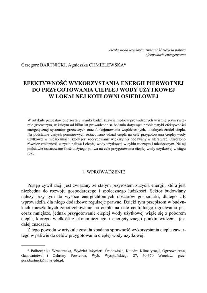 ciepła woda użytkowa, zmienność zużycia paliwa efektywność energetyczna Grzegorz BARTNICKI, Agnieszka CHMIELEWSKA* EFEKTYWNOŚĆ WYKORZYSTANIA ENERGII PIERWOTNEJ DO PRZYGOTOWANIA CIEPŁEJ WODY UŻYTKOWEJ W LOKALNEJ KOTŁOWNI OSIEDLOWEJ W artykule przedstawione zostały wyniki badań zużycia mediów prowadzonych w istniejącym systemie grzewczym, w którym od kilku lat prowadzone są badania dotyczące problematyki efektywności energetycznej systemów grzewczych oraz funkcjonowania współczesnych, lokalnych źródeł ciepła. Na podstawie danych pomiarowych oszacowano udział ciepła na cele przygotowania ciepłej wody użytkowej w mieszkaniach, który jest zdecydowanie większy niż podawany w literaturze. Określono również zmienność zużycia paliwa i ciepłej wody użytkowej w cyklu rocznym i miesięcznym. Na tej podstawie oszacowano ilość zużytego paliwa na cele przygotowania ciepłej wody użytkowej w ciągu roku. 1. WPROWADZENIE Postęp cywilizacji jest związany ze stałym przyrostem zużycia energii, która jest niezbędna do rozwoju gospodarczego i społecznego ludzkości. Sektor budowlany należy przy tym do wysoce energochłonnych obszarów gospodarki, dlatego UE wprowadziła dla niego dodatkowe regulacje prawne. Dzięki tym przepisom w budynkach mieszkalnych zapotrzebowanie na ciepło na cele centralnego ogrzewania jest coraz mniejsze, jednak przygotowanie ciepłej wody użytkowej wiąże się z poborem ciepła, którego wielkość z ekonomicznego i energetycznego punktu widzenia jest dalej znacząca. Z tego powodu w artykule została zbadana sprawność wykorzystania ciepła zawartego w paliwie do celów przygotowania ciepłej wody użytkowej. __________ * Politechnika Wrocławska, Wydział Inżynierii Środowiska, Katedra Klimatyzacji, Ogrzewnictwa, Gazownictwa i Ochrony Powietrza, Wyb. Wyspiańskiego 27, 50-370 Wrocław, [email protected]. 6 G. BARTNICKI, A. CHMIELEWSKA Trzeba pamiętać, że zwiększenie efektywności energetycznej systemu zaopatrzenia w ciepło niesie za sobą m.in. korzyści finansowe, które są niezwykle istotne z punktu widzenia właścicieli lokali mieszkalnych. Pozwala bowiem ograniczyć koszty utrzymania nieruchomości, zarówno jako całości, jak również poszczególnych lokali mieszkalnych. Oczywiście nie można również zapomnieć, że poprawa efektywności energetycznej to również zmniejszenie emisji zanieczyszczeń, a w skali globalnej – bardziej racjonalne zarządzanie nośnikami energii pierwotnej. 2. OPIS SYSTEMU BADAWCZEGO Analizą objęto sześć budynków wielorodzinnych wzniesionych w latach 2008-2009. Łącznie we wszystkich budynkach znajduje się 259 funkcjonalnych mieszkań o powierzchni od 26,7 do 103,4 m². Są to budynki podpiwniczone, w których na poziomie piwnic usytuowano podziemne garaże i komórki lokatorskie. Konstrukcja budynków jest wykonana z materiałów tradycyjnych o podwyższonej izolacyjności i akustyczności. Wszystkie obiekty posiadają podobne rozwiązania konstrukcje i cieplne. Ciepło na potrzeby centralnego ogrzewania i przygotowania ciepłej wody użytkowej wytwarzane jest w dwóch lokalnych kotłowniach gazowych (oznaczonych w dalszej części publikacji jako ZM01 i ZM02). Każda z central grzewczych zasila w ciepło trzy budynki mieszkalne. Zamontowane w nich zostały po dwa żeliwne kotły gazowe firmy De Dietrich DTG 320 EcoNOx o mocy 342 kW każdy. Wszystkie kotły wyposażone zostały w palniki atmosferyczne, które powodują, że proces spalania przebiega z ograniczoną sprawnością. Przygotowanie ciepłej wody użytkowej w obu kotłowniach odbywa się za pomocą baterii podgrzewaczy pojemnościowych, a instalacja doprowadzająca ciepłą wodę użytkową do odbiorców wyposażona została w termostatyczne zawory podpionowe. Instalacja centralnego ogrzewania wykonana została w systemie rozdzialaczowym. Analiza dwóch bardzo podobnych z punktu widzenia konstrukcji grup budynków pozwala na uśrednienie prowadzonych obserwacji i wyeliminowanie błędów pomiarowych. 3. METODA BADAWCZA Wszystkie analizowane mieszkania zostały wyposażone w instalację wodociągową doprowadzającą zimną i ciepłą wodę użytkową do pomieszczenia kuchni oraz łazienki. Każdy z lokali opomiarowany został przy pomocy wodomierzy mieszkaniowych skrzydełkowych jednostrumieniowych JS o qn = 1,5 m3/h do pomiaru zużycia wody Efektywność wykorzystania energii pierwotnej do przygotowania ciepłej wody użytkowej… 7 zimnej i ciepłej. Do pomiaru zużycia ciepła na potrzeby centralnego ogrzewania w szafkach rozdzielaczowych zamontowane zostały liczniki ciepła, zbudowane z przepływomierza skrzydełkowego, pary czujników temperatury i elektronicznego przelicznika (integratora). Odczyty zużycia mediów w mieszkaniach dokonywane były raz na miesiąc. Miesięczne zużycie gazu na potrzeby centralnego ogrzewania i ciepłej wody użytkowej wyznaczone zostało jako różnica wskazań gazomierza z początku i końca danego miesiąca. Roczne zużycie ciepła na potrzeby c.w.u. i c.o. obliczone zostało na podstawie pomiarów dla poszczególnych mieszkań. Badania obejmowały okres od stycznia 2012 r. do grudnia 2013 r. 4. ANALIZA 4.1. CHARAKTERYSTYKA ZUŻYCIA CIEPŁEJ WODY UŻYTKOWEJ Roczne zużycie ciepłej wody użytkowej, odrębnie dla każdej z analizowanych kotłowni porównano w tabela 1. W obu analizowanych centralach grzewczych można zauważyć niewielką zmienność zużycia ciepłej wody w latach 2012–2013. Znikome wahania w poborze medium na poziomie 2–3% mogą być związane z niezmienną strukturą budynków lub liczbą mieszkańców. Tabela 1. Roczny pobór ciepłej wody użytkowej w mieszkaniach zasilanych z kotłowni A5 i A6 Kotłownia ZM01 ZM02 ZM01 i ZM02 Rok 2012 2013 2012 2013 2012 2013 Roczne zużycie c.w.u. [m³/a] 4134,6 4061,2 3709,6 3833,6 7844,2 7894,8 Względne zużycia c.w.u. 100% 98% 100% 103% 100% 101% Na rysunku 1 przedstawiono zmienność zużycia ciepłej w