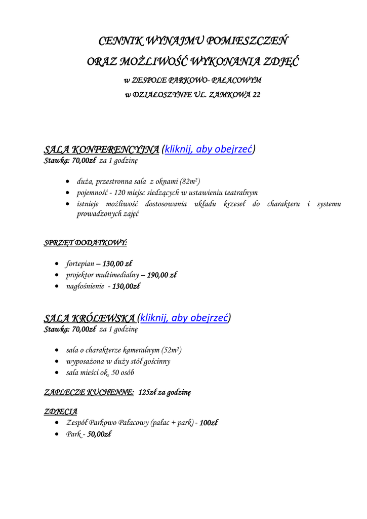 CENNIK WYNAJMU POMIESZCZEŃ ORAZ MOŻLIWOŚĆ WYKONANIA ZDJĘĆ w ZESPOLE PARKOWO- PAŁACOWYM w DZIAŁOSZYNIE UL. ZAMKOWA 22 SALA KONFERENCYJNA (kliknij, aby obejrzeć) Stawka: 70,00zł za 1 godzinę duża, przestronna sala z oknami (82m2) pojemność - 120 miejsc siedzących w ustawieniu teatralnym istnieje możliwość dostosowania układu krzeseł do charakteru i systemu prowadzonych zajęć SPRZĘT DODATKOWY: fortepian – 130,00 zł projektor multimedialny – 190,00 zł nagłośnienie - 130,00zł SALA KRÓLEWSKA (kliknij, aby obejrzeć) Stawka: 70,00zł za 1 godzinę sala o charakterze kameralnym (52m2) wyposażona w duży stół gościnny sala mieści ok. 50 osób ZAPLECZE KUCHENNE: 125zł za godzinę ZDJĘCIA Zespół Parkowo Pałacowy (pałac + park) - 100zł Park - 50,00zł WYNAJEM NA IMPREZY OKOLICZNOŚCIOWE np. spotkania rodzinne, urodziny, chrzciny, komunie, stypy, przyjęcia weselne itp. Stawka powyżej 4 godzin: Sala Konferencyjna – 550,00 zł Sala Królewska– 550,00 zł Zaplecze kuchenne –125,00 zł Park – 550,00 zł Cennik obowiązuje do godz. 23oo po tej godz. opłata za każdą rozpoczętą godz. wynosi 50,00zł.