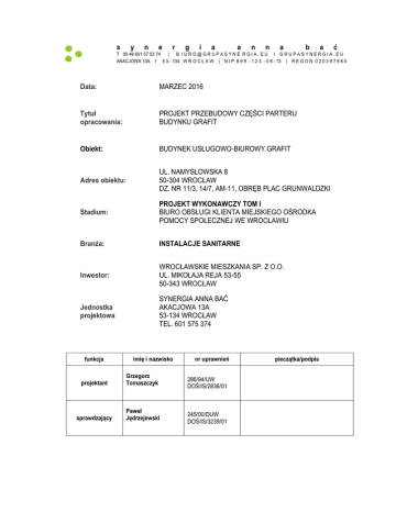s y n e r g i a a n n a b a ć T 00 48 601 57 53 74 | B I U R O @ G R U P A S Y N E R G I A . E U I G R U P A S Y N E R G I A . E U AKACJOWA 13A I 5 3 - 134 W R O C Ł A W | N I P 8 9 9 - 1 2 4 - 0 6 - 13 | R E G O N 0 2 0 3 9 7 6 6 0 Data: MARZEC 2016 Tytuł opracowania: PROJEKT PRZEBUDOWY CZĘŚCI PARTERU BUDYNKU GRAFIT Obiekt: BUDYNEK USŁUGOWO-BIUROWY GRAFIT Adres obiektu: UL. NAMYSŁOWSKA 8 50-304 WROCŁAW DZ. NR 11/3, 14/7, AM-11, OBRĘB PLAC GRUNWALDZKI Stadium: PROJEKT WYKONAWCZY TOM I BIURO OBSŁUGI KLIENTA MIEJSKIEGO OŚRODKA POMOCY SPOŁECZNEJ WE WROCŁAWIU Branża: INSTALACJE SANITARNE Inwestor: WROCŁAWSKIE MIESZKANIA SP. Z O.O. UL. MIKOŁAJA REJA 53-55 50-343 WROCŁAW Jednostka projektowa SYNERGIA ANNA BAĆ AKACJOWA 13A 53-134 WROCŁAW TEL. 601 575 374 funkcja imię i nazwisko projektant Grzegorz Tomaszczyk sprawdzający Paweł Jędrzejewski nr uprawnień 286/94/UW DOŚ/IS/2836/01 245/00/DUW DOŚ/IS/3239/01 pieczątka/podpis 2 PW_OPIS_IS_MOPS+500 Spis opracowania 1. Strona tytułowa 2. Spis opracowania 3. Opis do projektu wykonawczego Rysunki - rzut piwnicy - rzut parteru - instalacja wz +wc - instalacja kan. sanit. PW_OPIS_IS_MOPS+500 str. 1 str. 2 str. 3 IS 1 IS 2 IS 3 IS 4 3 4 PW_OPIS_IS_MOPS+500 1. OPIS DO PROJEKTU WYKONAWCZEGO INSTALACJI SANITARNYCH 1. ZAKRES OPRACOWANIA: Niniejsze opracowanie zawiera opis do projektu wykonawczego instalacji sanitarnych do projektu przebudowy wnętrz na Biura Obsługi Klienta Miejskiego Ośrodka Pomocy Społecznej, części parteru w budynku Grafit, przy ul. Namysłowskiej 8 we Wrocławiu (działki nr 11/3, 14/7, AM-11, obręb Plac Grunwaldzki) 2. WYTYCZNE P.POŻ DLA PROJEKTOWANYCH INSTALACJI Przejścia instalacji sanitarnych przez ściany i stropy należy zabezpieczyć ognioochronnymi obejmami np. HILTI (przewody o średnicy powyżej 40mm), lub masami uszczelniającymi np. HILTI (przewody o średnicy do 40mm)w wypadku: Przejścia przez elementy wydzielenia przeciwpożarowego powinny mieć klasę odporności ogniowej (E I) wymaganych dla tych elementów Dopuszcza się nie instalowanie przepustów, o których mowa wyżej, dla pojedynczych rur instalacyjnych do pomieszczeń higieniczno sanitarnych. Przejścia przez stropy i ściany przepustami o średnicy powyżej 40mm, dla których wymagana jest klasa odporności ogniowej co najmniej E I 60 lub R E 60, powinny mieć klasę odporności ogniowej (E I) tych przegród. Zabezpieczenia powinny posiadać aktualny atest. 3. INSTALACJE WODY ZIMNEJ I CIEPŁEJ Dla adaptowanych pomieszczeń zaprojektowano układ instalacji wody zimnej i ciepłej jednostrefowe włączone do istniejącego układu instalacji. Zmiany dotyczą wydzielonych pomieszczeń na parterze, podejść w piwnicy. Projektowany układ zasilać będzie armaturę czerpalną na parterze. W trakcie robót należy wykonać też odcinki pionów zasilające armaturę powyżej parteru. Istniejące, a nie wykorzystane podejścia pod armaturę czerpalną należy zdemontować, a w poziomie piwnicy odcięte podejścia zakorkować. 3.1 Materiał Projektowane instalacje wykonać z: - rury i kształtki według systemu PE-Xc/Al./PE z umieszczoną pośrodku przekroju przewodu, rurą z aluminium zgrzewanego doczołowo, posiadających współczynnik chropowatości względnej k = 0,0007, współczynnik przewodności cieplnej dla rury 0.35 W/mK oraz max. parametry pracy 95°C i 10 bar. Połączenia za pomocą kształtek i elementów złącznych wykonanych z mosiądzu odpornego na odcynkowanie (gwarantuje minimalną ilość metali ciężkich w instalacji) lub z tworzywa PPSU. Łączenie odbywa się metodą aksjalną ( uszczelnienie następuje poprzez nasunięcie tulei zaciskowej po uprzednim rozkalibrowaniu rury). Zastosowana metoda gwarantuje brak przewężeń na kształtkach, co nie powoduje zmniejszenia przepływu czynnika w instalacji ( co ma miejsce w systemach presfitingowych ), a także nie wymaga w połączeniu żadnego dodatkowego uszczelnienia np. typu O-Ring, jednocześnie umożliwia osiowy obrót kształtki w stosunku do rury – bez rozszczelnienia Ten typ połączenia nierozłącznego daje gwarancję szczelności przy zalewaniu instalacji w posadzkach lub zamurowywaniu w bruzdach. W trakcie wykonywania połączeń należy wykonać według zasad opracowanych przez producenta systemu np. TECEflex firmyTECE. jako alternatywne rozwiązanie proponuje się zastosowanie rur PE-RT/Al/PE-RT z umieszczoną pośrodku przekroju przewodu, rurą z aluminium bezszwową wytwarzaną w całości metodą wytłaczania, posiadających współczynnik chropowatości względnej k = 0,0004, współczynnik przewodności cieplnej dla rury 0.40 W/mK oraz max. parametry pracy 95°C i 10 bar. Połączenia za pomocą kształtek i elementów złącznych wykonanych z cynowanego mosiądzu lub z tworzywa PPSU. Rury z kształtkami łączyć za pomocą połączeń zaprasowywanych. Ten typ połączenia nierozłącznego wykonanego według wytycznych producenta daje gwarancję szczelności przy zalewaniu instalacji w posadzkach lub zamurowywaniu w bruzdach. System np. Uni Pipe PLUS firmy UPONOR. Do łączenia przewodów należy stosować łączniki przewidziane dla danego typu rur (według wybranego systemu) W trakcie wykonywania połączeń należy wykonać według zasad opracowanych przez poszczególnych producentów systemów. W przypadku stosowania złączek z gwintami wymagane jest zastosowanie dodatkowego uszczelnienia w postaci taśmy teflonowej. 3.2 MONTAŻ INSTALACJI Instalacje wody zimnej montować do ścian budynku za pomocą uchwytów z wkładka teflonową, lub do stropu za pomocą wsporników do których montowane będą uchwyty z wkładką teflonową. Podejścia pod armaturę czerpalną montować do ścian budynku za pomocą uchwytów, w bruzdach, lub pod posadzką pomieszczeń (w warstwie styropianu). Całą instalacje wody ciepłej i cyrkulacji należy montować w izolacji np. typu Thermaflex. Zabrania się prowadzenia przewodów instalacji wody zimnej i ciepłej 