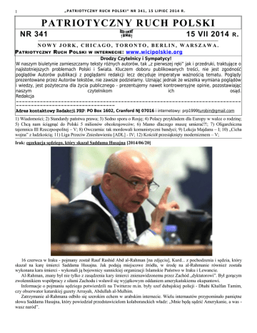 „PATRIOTYCZNY RUCH POLSKI” NR 341, 15 LIPIEC 2014 R. 1 PATRIOTYCZNY RUCH POLSKI NR 341 15 VII 2014 R. ----------------------------------------------------------------------------------------------------------------------------------------------------------------- NOWY JORK, CHICAGO, TORONTO, BERLIN, WARSZAWA. P ATRIOTYCZNY R UCH P OLSKI W INTERNECIE : www.wicipolskie.org Drodzy Czytelnicy i Sympatycy! W naszym biuletynie zamieszczamy teksty różnych autorów, tak „z pierwszej ręki” jak i przedruki, traktujące o najistotniejszych problemach Polski i Świata. Kluczem doboru publikowanych treści, nie jest zgodność poglądów Autorów publikacji z poglądami redakcji lecz decyduje imperatyw ważnością tematu. Poglądy prezentowane przez Autorów tekstów, nie zawsze podzielamy. Uznając jednak że wszelka wymiana poglądów i wiedzy, jest pożyteczna dla życia publicznego - prezentujemy nawet kontrowersyjne opinie, pozostawiając naszym czytelnikom ich osąd. Redakcja ----------------------------------------------------------------------------------------------------------- Adres kontaktowy Redakcji PRP: PO Box 1602, Cranford NJ 07016 i internetowy: [email protected] 1) Wiadomości; 2) Standardy państwa prawa; 3) Sedno sporu o Rosję; 4) Polacy przykładem dla Europy w walce o rodzinę; 5) Chcą nam ściągnąć do Polski 5 milionów obcokrajowców; 6) Mamo dlaczego muszę umierać?!; 7) Oligarchiczna tajemnica III Rzeczpospolitej – V; 8) Owczarnia: tak mordowali komunistyczni bandyci; 9) Lekcja Majdanu – I; 10) „Cicha wojna” z ludzkością; 11) Liga Przeciw Zniesławieniu [ADL] - IV; 12) Kościół przesiąknięty modernizmem – V; Irak: egzekucja sędziego, który skazał Saddama Husajna [2014/06/20] 16 czerwca w Iraku - pojmany został Rauf Rashid Abd al-Rahman [na zdjęciu], Kurd... z pochodzenia i sędzia, który skazał na karę śmierci Saddama Husajna. Jak podają miejscowe źródła, w środę na al-Rahmanie również została wykonana kara śmierci - wykonali ją bojownicy sunnickiej organizacji Islamskie Państwo w Iraku i Lewancie. Al-Rahman, znany był nie tylko z zasądzenia kary śmierci znienawidzonemu przez Zachód „dyktatorowi”. Był gorącym zwolennikiem współpracy z siłami Zachodu i wsławił się wyjątkowym oddaniem amerykańskiemu okupantowi. Informacje o pojmaniu sędziego potwierdzili na Twitterze m.in. były szef dubajskiej policji - Dhahi Khalfan Tamim, czy obserwator katarskiej gazety Arrayah, Abdullah al-Mulhim. Zatrzymanie al-Rahmana odbiło się szerokim echem w arabskim internecie. Wielu internautów przypominało pamiętne słowa Saddama Husajna, który powiedział przedstawicielom kolaboranckich władz: „Mnie będą sądzić Amerykanie, a was wasz naród”. 2 „PATRIOTYCZNY RUCH POLSKI” NR 341, 15 LIPIEC 2014 R. Saddam Husajn został skazany na karę śmierci przez powieszenie. Egzekucja miała miejsce 30 grudnia 2006 roku, o godzinie 6:00 czasu miejscowego. Wykonano ją dosłownie na kilka minut przed rozpoczęciem święta Kurban-Bajram [Święto Ofiarowania]. Na podstawie: ridus.ru Za: http://autonom.pl/?p=9090 # # # Prezbiterianie przeciwko okupacji Palestyny Kościół Prezbiteriański w Stanach Zjednoczonych zaskoczył wszystkich nieoczekiwaną deklaracją. Po przeprowadzonym w piątek [06/20/2014] głosowaniu wśród hierarchów Kościoła opublikowano decyzję o wstrzymaniu współpracy z firmami, które czerpią zyski z izraelskiej okupacji Palestyny. Decyzja dotyczyć będzie Hewlet and Packard, Caterpillar i Motorola. Wycofane natychmiast zakupy i serwis używane przez instytucje związane z Kościołem Prezbiteriańskim w tych firmach, wynoszą ponad 21 milionów. Decyzja spotkała się z poparciem wśród wyznawców i społeczeństwa, co wyraźnie widać na portalach i blogach, które odważyły się poruszyć temat. Dzisiejszy New York Times opublikował spory artykuł w którym autorzy w dość nieporadny sposób starają się przedstawić decyzję Kościoła, jako nieprzemyślaną. Nie wyciągnięto jeszcze ciężkiej artylerii antysemityzmu, ale mam wrażenie, że po zbyt częstym używaniu tego oręża, zarówno jego zasięg jak i ogólne odczucie, przestało kogokolwiek tu w Ameryce bulwersować. Pozostało mieć nadzieję, że hierarchowie Kościoła Katolickiego będą mieli wystarczająco odwagi, aby wypowiedzieć się również w tej sprawie, choć zapewne, jak zwykle zasłonią się monstrualnym potworkiem judeochrześcijaństwa. MW Za: http://www.nasznowyjork.org/5/post/2014/06/prezbiterianie-przeciwko-okupacji-palestyny.html # # # 25 lat III RP, 10 lat w UE - syjonistyczna okupacja trwa 25 lat sukcesów żydosystemu III RP 3 „PATRIOTYCZNY RUCH POLSKI” NR 341, 15 LIPIEC 2014 R. Obiekt w pobliżu granicy Zabrza i Gliwic, w którego budowę od końca lat 70-tych wpompowano kilkaset milionów złotych, miał być najnowocześniejszym szpitalem w Polsce. Pracę miało w nim znaleźć 3 tysiące osób. Inwestycję zastopował jednak kryzys z lat 80-tych. W latach 90-tych rozpaczliwej próby ratowania obiektu podjął się profesor Zbigniew Religa, ówczesny rektor Śląskiej Akademii Medycznej. Porzucono myśl o otwarciu szpitala, zdecydowano się natomiast na utworzenie w tym miejscu Akademickiego Centrum Medycznego, w którym to szkolić się mieli przyszli lekarze z całego świata. Obecnie szpital wysadzono w powietrze. Koniec kolosa: Za: http://wiernipolsce.wordpress.com/2014/05/25/25-lat-iiirp-w-tym-10-lat-w-ue-syjonistyczna-okupacja-trwa/ # # # Wsparcie dla diaspory, zamiast dla Polonii Ministerstwo Spraw Zagranicznych wydaje pieniądze na wsparcie zagranicznych organizacji i projektów związanych z dziedzictwem żydowskim. Jednocześnie brakuje środków na projekty prowadzone przez polskie środowiska współpracujące z Polonią. Głos w tej sprawie na ostatnim posiedzeniu Parlamentu zabrał senator Grzegorz Bierecki. Senatorowie wysłuchiwali w środę informacji ministra Radosława 