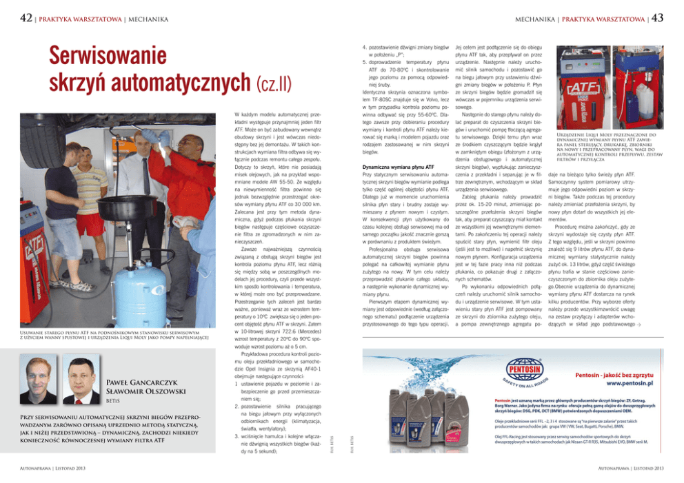 42 | PRAKTYKA WARSZTATOWA | MECHANIKA MECHANIKA | PRAKTYKA WARSZTATOWA | Serwisowanie skrzyń automatycznych (cz.II) BETiS Przy serwisowaniu automatycznej skrzyni biegów przeprowadzanym zarówno opisaną uprzednio metodą statyczną, jak i niżej przedstawioną – dynamiczną, zachodzi niekiedy konieczność równoczesnej wymiany filtra ATF Autonaprawa | Listopad 2013 Jej celem jest podłączenie się do obiegu płynu ATF tak, aby przepływał on przez urządzenie. Następnie należy uruchomić silnik samochodu i pozostawić go na biegu jałowym przy ustawieniu dźwigni zmiany biegów w położeniu P. Płyn ze skrzyni biegów będzie gromadził się wówczas w pojemniku urządzenia serwisowego. Następnie do starego płynu należy dolać preparat do czyszczenia skrzyni biegów i uruchomić pompę tłoczącą agregatu serwisowego. Dzięki temu płyn wraz ze środkiem czyszczącym będzie krążył w zamkniętym obiegu (złożonym z urządzenia obsługowego i automatycznej skrzyni biegów), wypłukując zanieczyszczenia z przekładni i separując je w filtrze zewnętrznym, wchodzącym w skład urządzenia serwisowego. Zabieg płukania należy prowadzić przez ok. 15-20 minut, zmieniając poszczególne przełożenia skrzyni biegów tak, aby preparat czyszczący miał kontakt ze wszystkimi jej wewnętrznymi elementami. Po zakończeniu tej operacji należy spuścić stary płyn, wymienić filtr oleju (jeśli jest to możliwe) i napełnić skrzynię nowym płynem. Konfiguracja urządzenia jest w tej fazie pracy inna niż podczas płukania, co pokazuje drugi z załączonych schematów. Po wykonaniu odpowiednich połączeń należy uruchomić silnik samochodu i urządzenie serwisowe. W tym ustawieniu stary płyn ATF jest pompowany ze skrzyni do zbiornika zużytego oleju, a pompa zewnętrznego agregatu po- Urządzenie Liqui Moly przeznaczone do dynamicznej wymiany płynu ATF zawiera panel sterujący, drukarkę, zbiorniki na nowy i przepracowany płyn, wagi do automatycznej kontroli przepływu, zestaw filtrów i przyłącza daje na bieżąco tylko świeży płyn ATF. Samoczynny system pomiarowy utrzymuje jego odpowiedni poziom w skrzyni biegów. Także podczas tej procedury należy zmieniać przełożenia skrzyni, by nowy płyn dotarł do wszystkich jej elementów. Procedurę można zakończyć, gdy ze skrzyni wydostaje się czysty płyn ATF. Z tego względu, jeśli w skrzyni powinno znaleźć się 9 litrów płynu ATF, do dynamicznej wymiany statystycznie należy zużyć ok. 13 litrów, gdyż część świeżego płynu trafia w stanie częściowo zanieczyszczonym do zbiornika oleju zużytego.Obecnie urządzenia do dynamicznej wymiany płynu ATF dostarcza na rynek kilku producentów. Przy wyborze oferty należy przede wszystkimzwrócić uwagę na zestaw przyłączy i adapterów wchodzących w skład jego podstawowego Fot. BETiS Paweł Gancarczyk Sławomir Olszowski Dynamiczna wymiana płynu ATF Przy statycznym serwisowaniu automatycznej skrzyni biegów wymianie podlega tylko część ogólnej objętości płynu ATF. Dlatego już w momencie uruchomienia silnika płyn stary i brudny zostaje wymieszany z płynem nowym i czystym. W konsekwencji płyn użytkowany do czasu kolejnej obsługi serwisowej ma od samego początku jakość znacznie gorszą w porównaniu z produktem świeżym. Profesjonalna obsługa serwisowa automatycznej skrzyni biegów powinna polegać na całkowitej wymianie płynu zużytego na nowy. W tym celu należy przeprowadzić płukanie całego układu, a następnie wykonanie dynamicznej wymiany płynu. Pierwszym etapem dynamicznej wymiany jest odpowiednie (według załączonego schematu) podłączenie urządzenia przystosowanego do tego typu operacji. Fot. BETiS Usuwanie starego płynu ATF na podnośnikowym stanowisku serwisowym z użyciem wanny spustowej i urządzenia Liqui Moly jako pompy napełniającej W każdym modelu automatycznej przekładni występuje przynajmniej jeden filtr ATF. Może on być zabudowany wewnątrz obudowy skrzyni i jest wówczas niedostępny bez jej demontażu. W takich konstrukcjach wymiana filtra odbywa się wyłącznie podczas remontu całego zespołu. Dotyczy to skrzyń, które nie posiadają misek olejowych, jak na przykład wspomniane modele AW 55-50. Ze względu na niewymienność filtra powinno się jednak bezwzględnie przestrzegać okresów wymiany płynu ATF co 30 000 km. Zalecana jest przy tym metoda dynamiczna, gdyż podczas płukania skrzyni biegów następuje częściowe oczyszczenie filtra ze zgromadzonych w nim za nieczyszczeń. Zawsze najważniejszą czynnością związaną z obsługą skrzyni biegów jest kontrola poziomu płynu ATF, lecz różnią się między sobą w poszczególnych modelach jej procedury, czyli przede wszystkim sposób kontrolowania i temperatura, w której może ono być przeprowadzane. Przestrzeganie tych zaleceń jest bardzo ważne, ponieważ wraz ze wzrostem temperatury o 10ºC zwiększa się o jeden procent objętość płynu ATF w skrzyni. Zatem w 10-litrowej skrzyni 722.6 (Mercedes) wzrost temperatury z 20ºC do 90ºC spowoduje wzrost poziomu aż o 5 cm. Przykładowa procedura kontroli poziomu oleju przekładniowego w samochodzie Opel Insignia ze skrzynią AF40-1 obejmuje następujące czynności: 1 ustawienie pojazdu w poziomie i zabezpieczenie go przed przemieszczaniem się; 2.pozostawienie silnika pracującego na biegu jałowym przy wyłączonych odbiornikach energii (klimatyzacja, światła, wentylatory); 3.wciśnięcie hamulca i kolejne włączanie dźwignią wszystkich biegów (każdy na 5 sekund); 4.pozostawienie dźwigni zmiany biegów w położeniu „P”; 5.doprowadzenie temperatury płynu ATF do 70-80ºC i skontrolowanie jego poziomu za pomocą odpowiedniej śruby. Identyczna skrzynia oznaczona symbolem TF-80SC znajduje się w Volvo, lecz w tym przypadku kontrola poziomu powinna odbywać się przy 55-60ºC. Dlatego zawsze przy dobieraniu procedury wymiany i kontroli płynu ATF należy kierować si